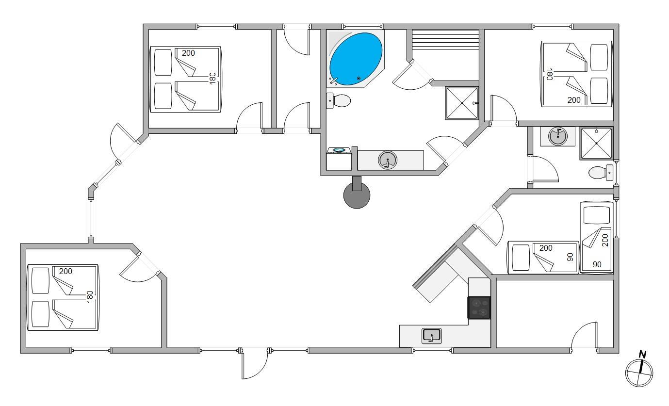 The holiday home features four bedrooms, comfortably accommodating up to eight people. With the kitchen open to the living area, you can remain part of family life while cooking. After meals, the dishwasher takes care of the cleaning up, leaving you free to relax on the sofa.