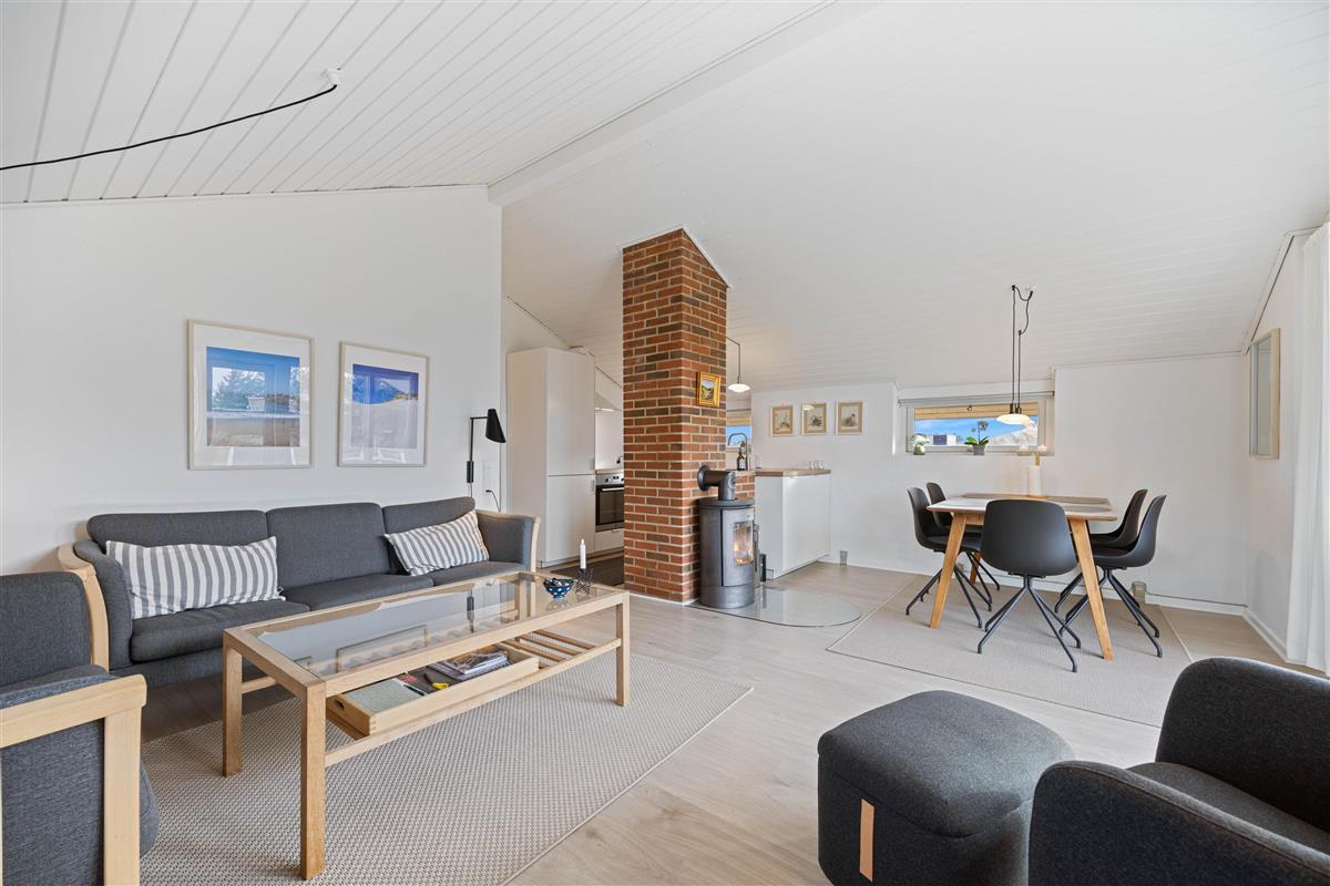 The living room, fitted with laminate flooring, is cosily and attractively furnished, perfect for relaxing together in front of the beautiful wood-burning stove. The kitchen, which was renovated in 2022, is open-plan with the living room, allowing you to prepare meals while staying connected with family or friends. The energy-efficient heat pump ensures a comfortable temperature throughout the living area.