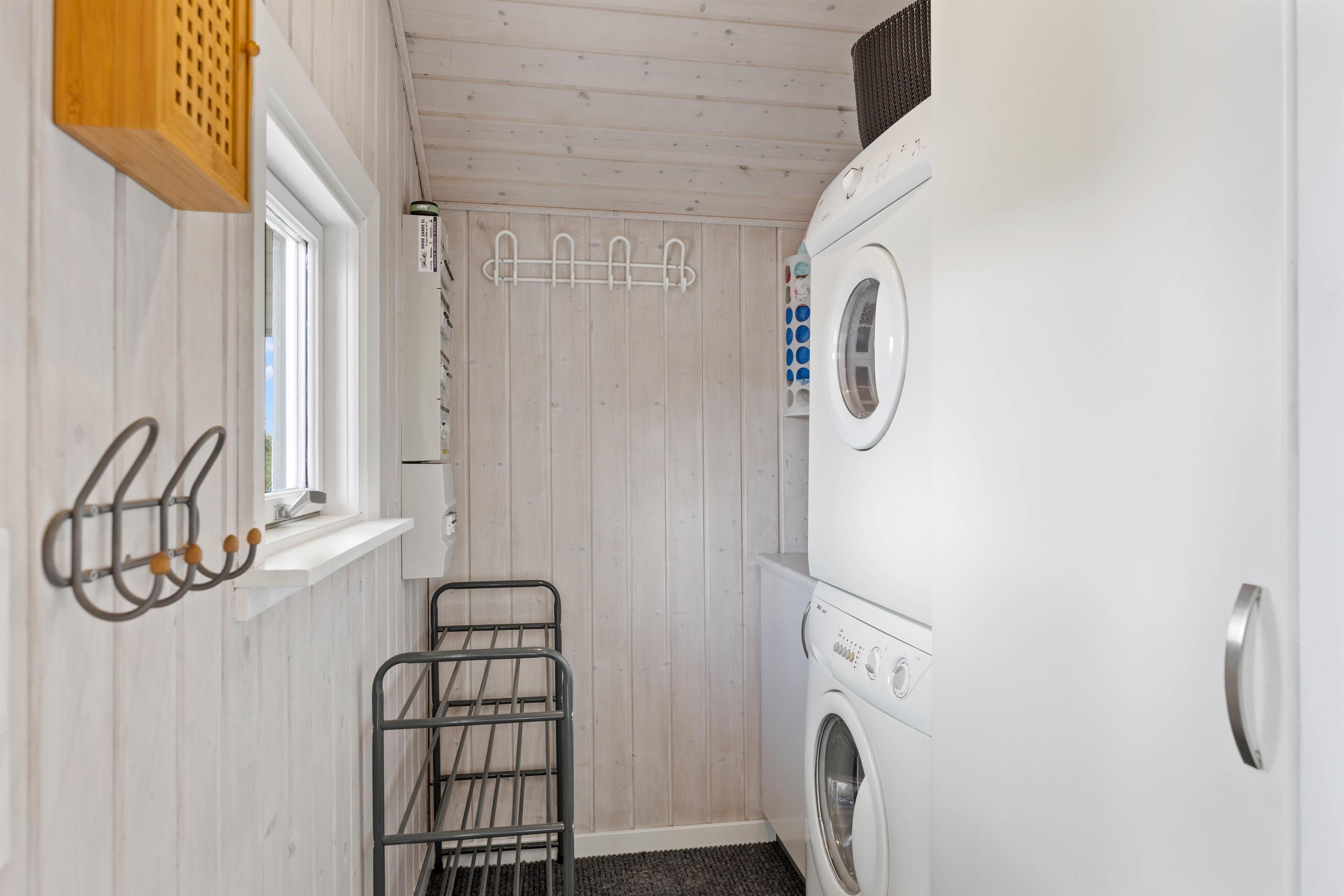 A convenient utility area next to the entrance houses a washing machine, tumble dryer, and coat storage.