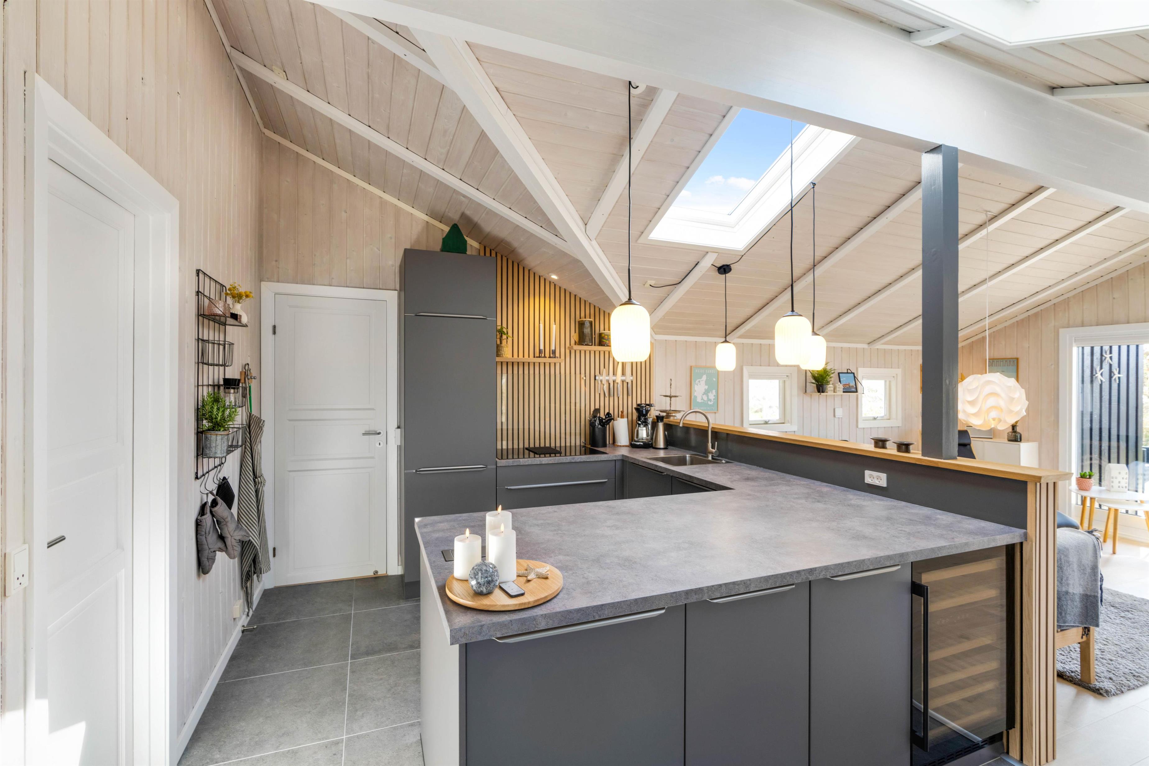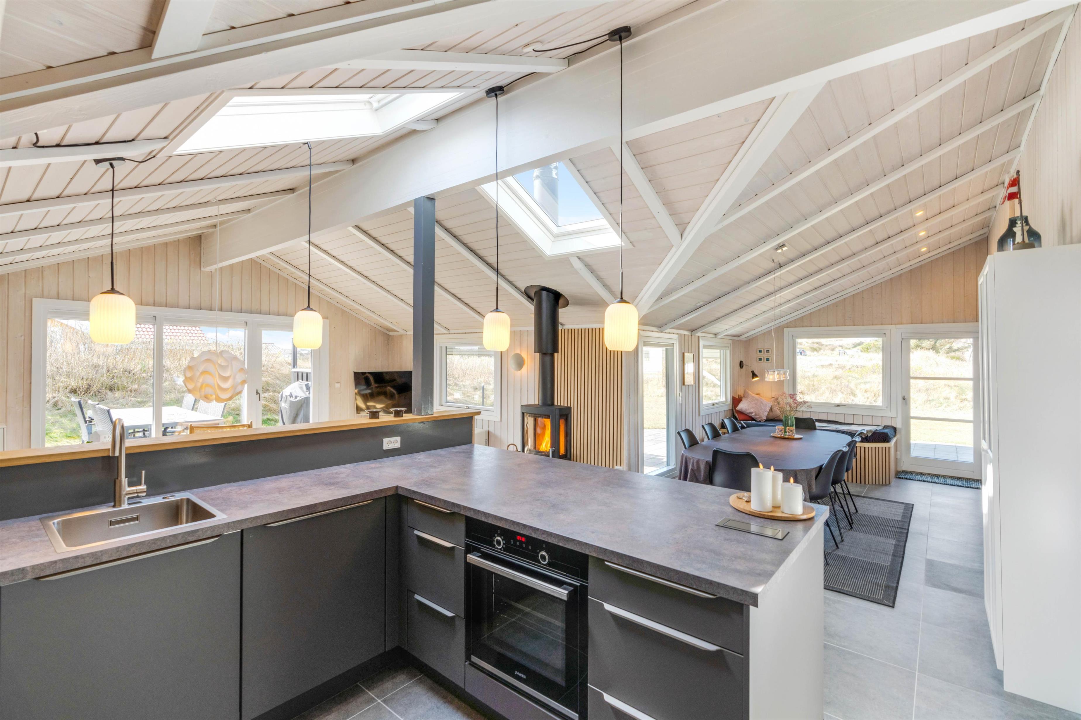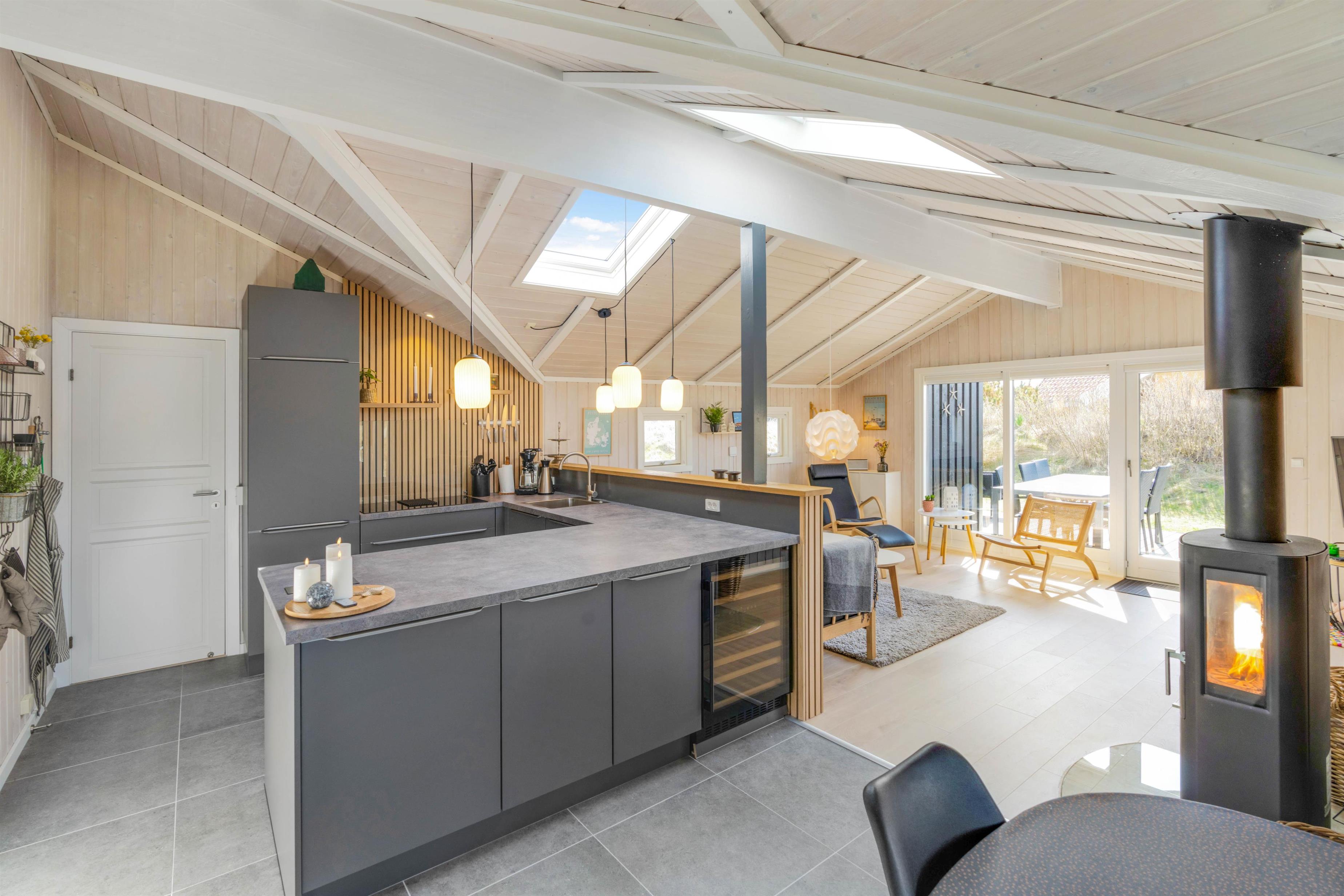 The living area is bright and welcoming, featuring a traditional Danish TV corner perfect for cosy evenings by the wood-burning stove. Adjacent to the living room is a modern kitchen with ample counter space and a dishwasher.