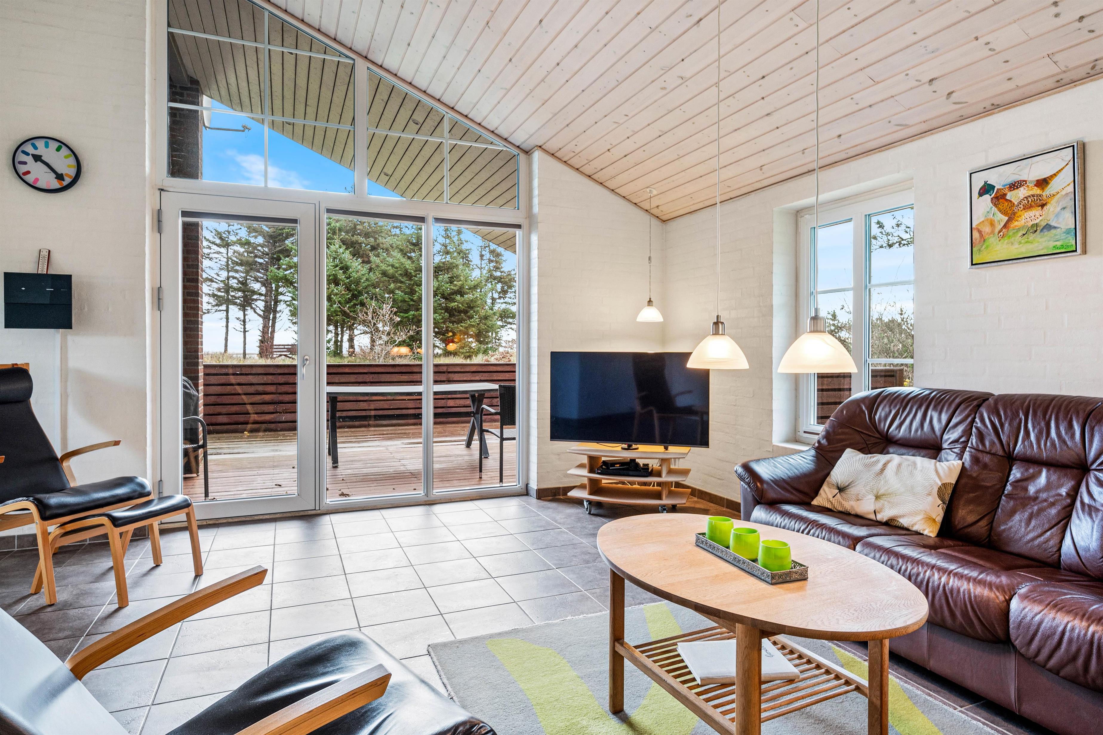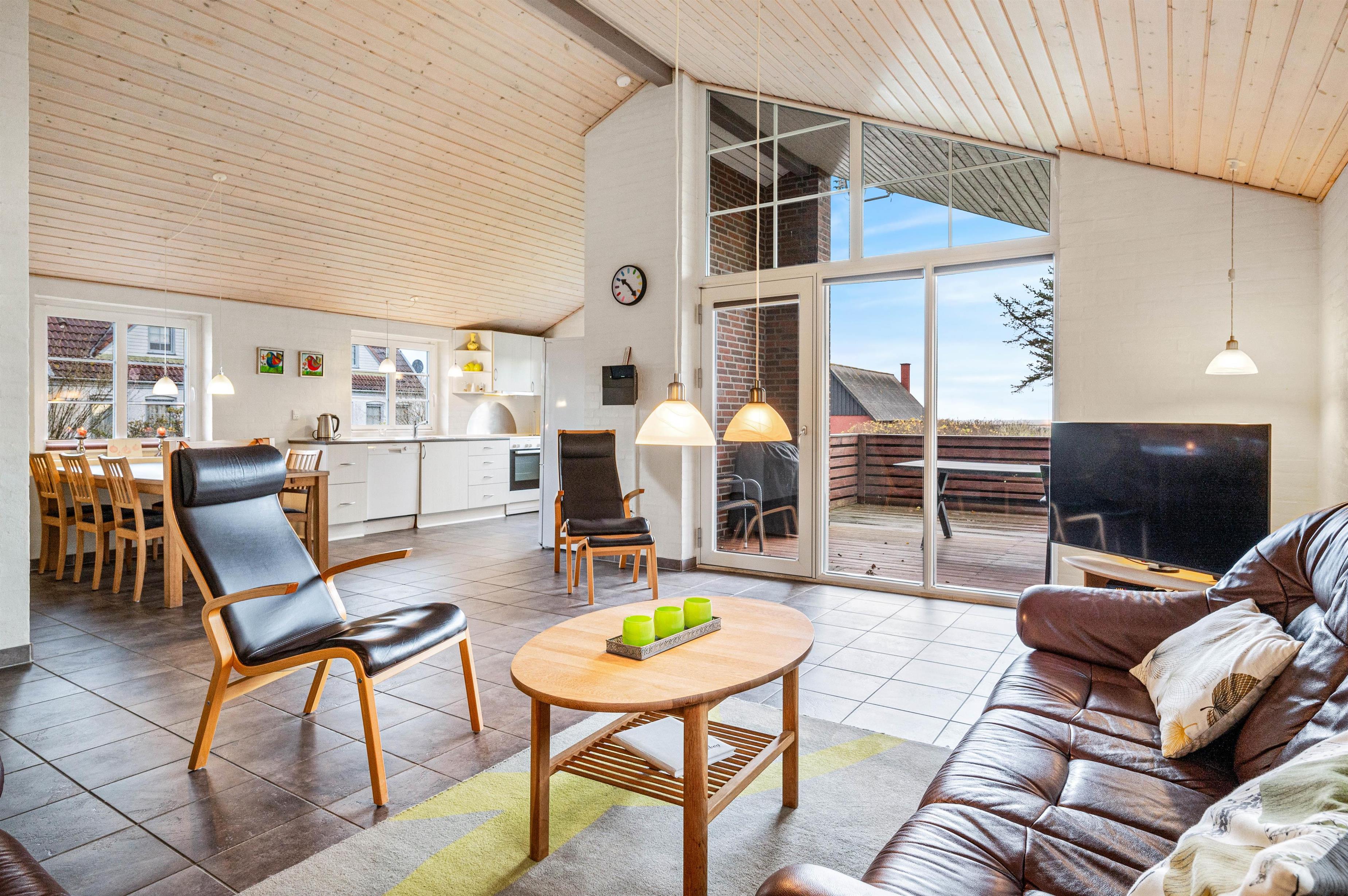Upon entering the holiday home, you'll find a generous entrance area with washing machine and tumble dryer, plus plenty of space for coats and shoes. The open-plan living area, styled in typical Scandinavian fashion, features high ceilings and large windows that flood the space with natural light, creating a welcoming atmosphere.
