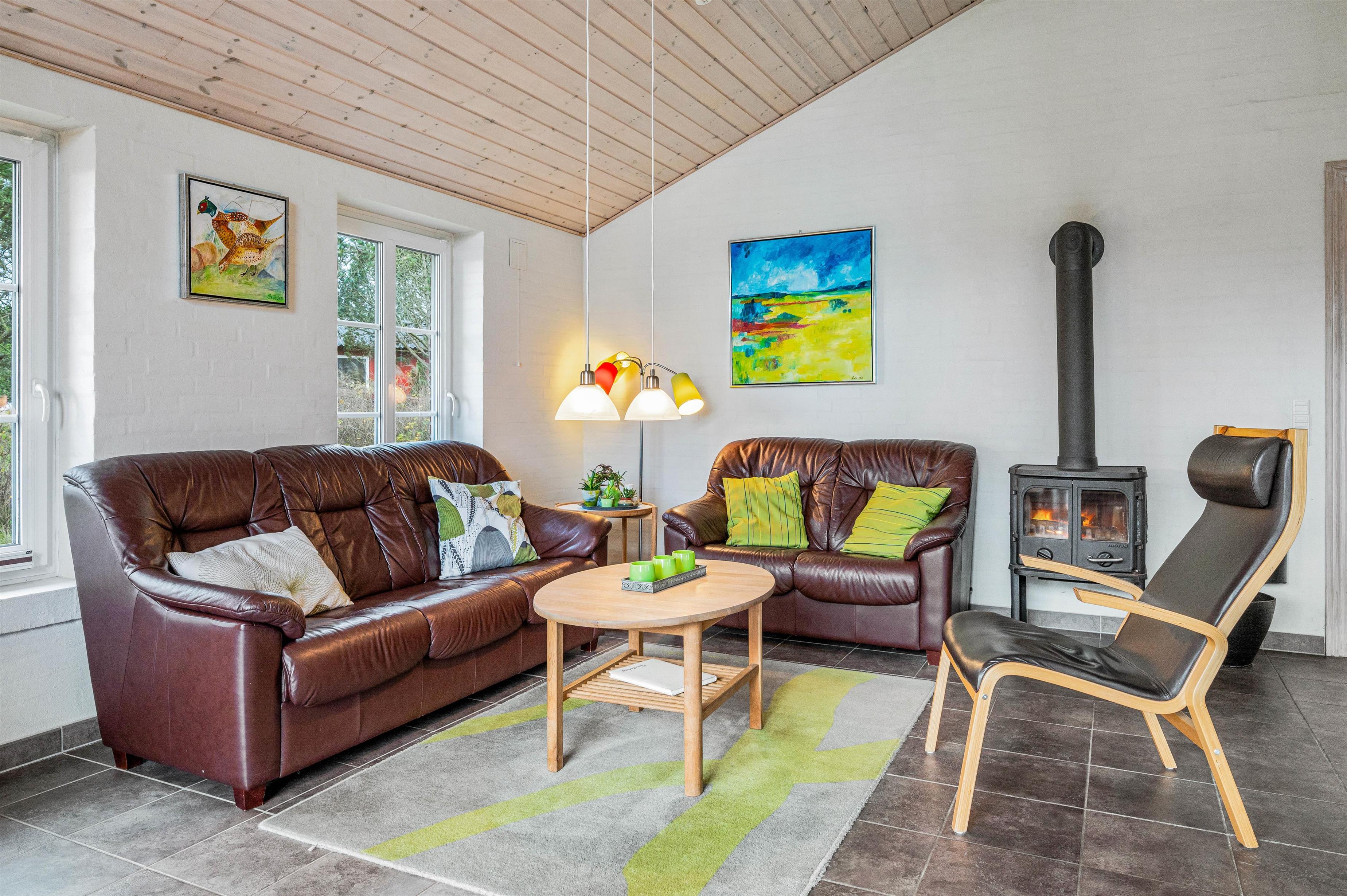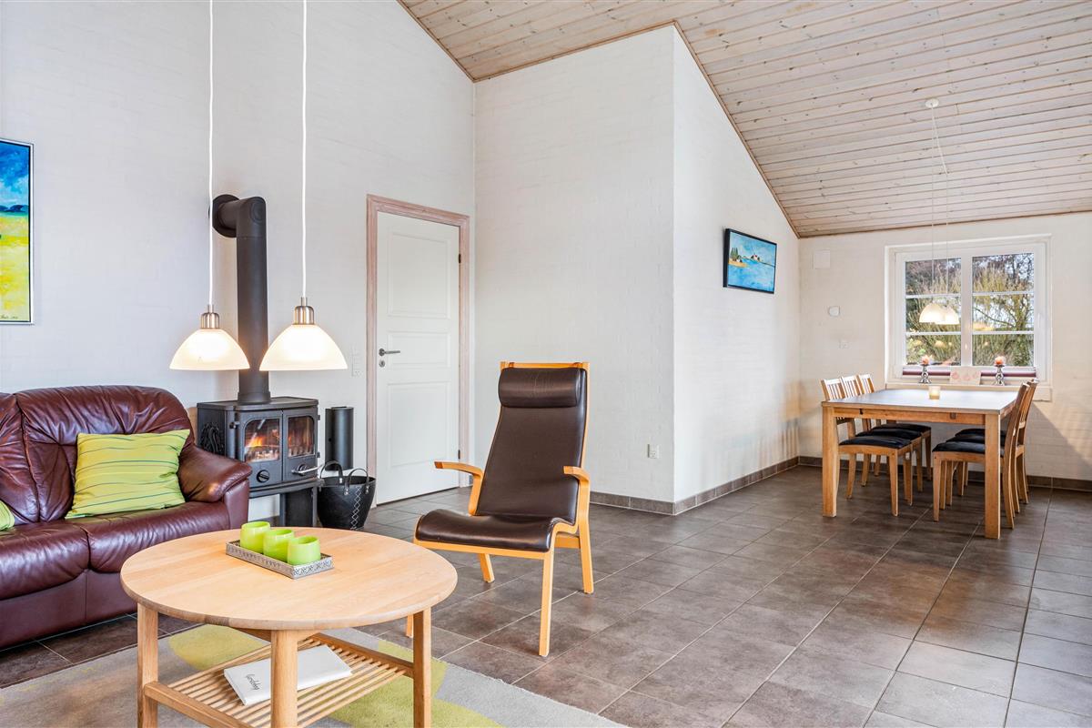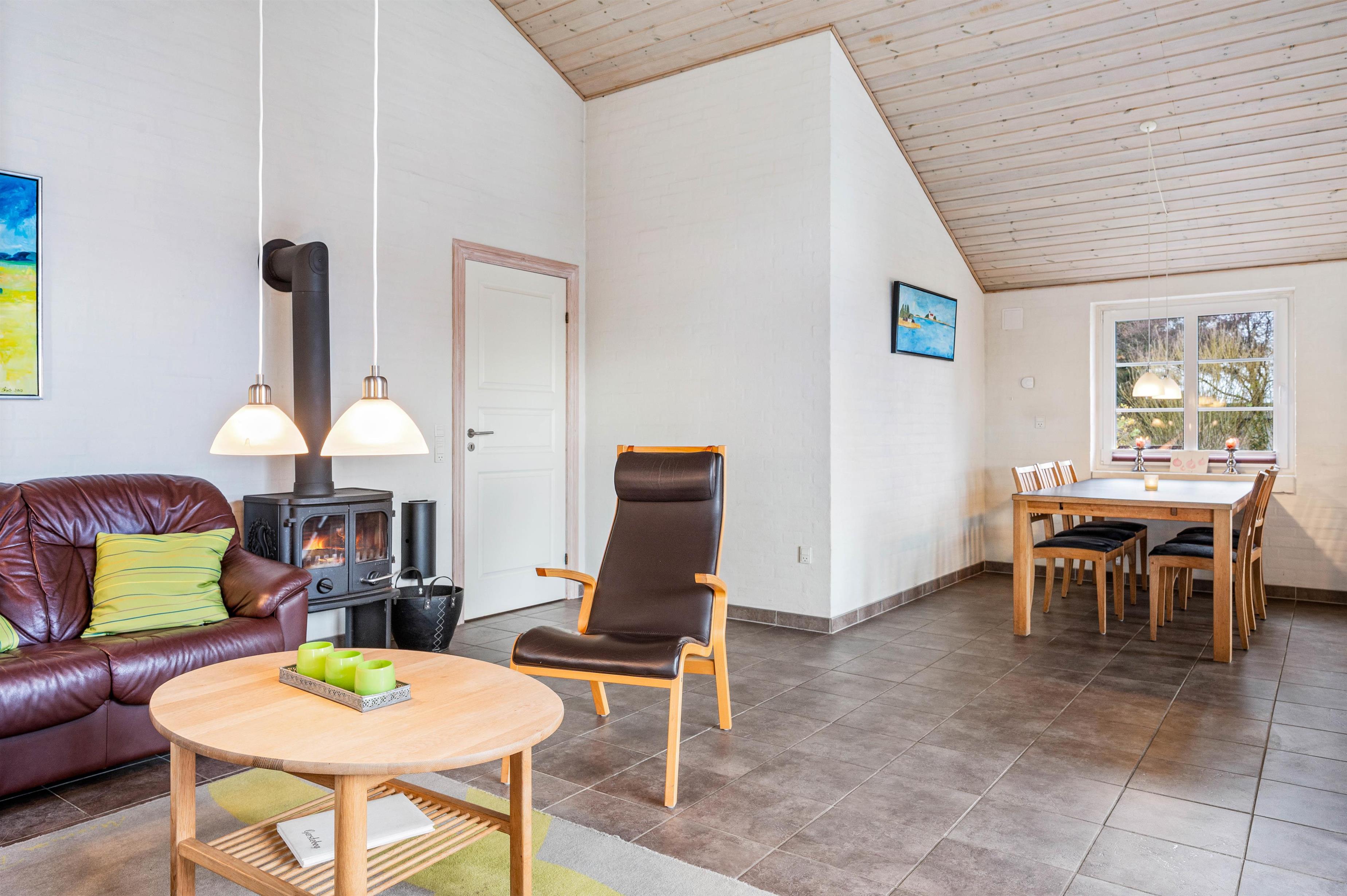Here you'll find a television and DVD player, perfect for cosy family evenings on the sofa. The wood-burning stove adds to the comfortable ambiance, while energy-efficient underfloor heating ensures pleasant warmth throughout the holiday home. The open-plan kitchen is perfectly equipped for social cooking and includes a dishwasher, so you won't need to worry about washing up.