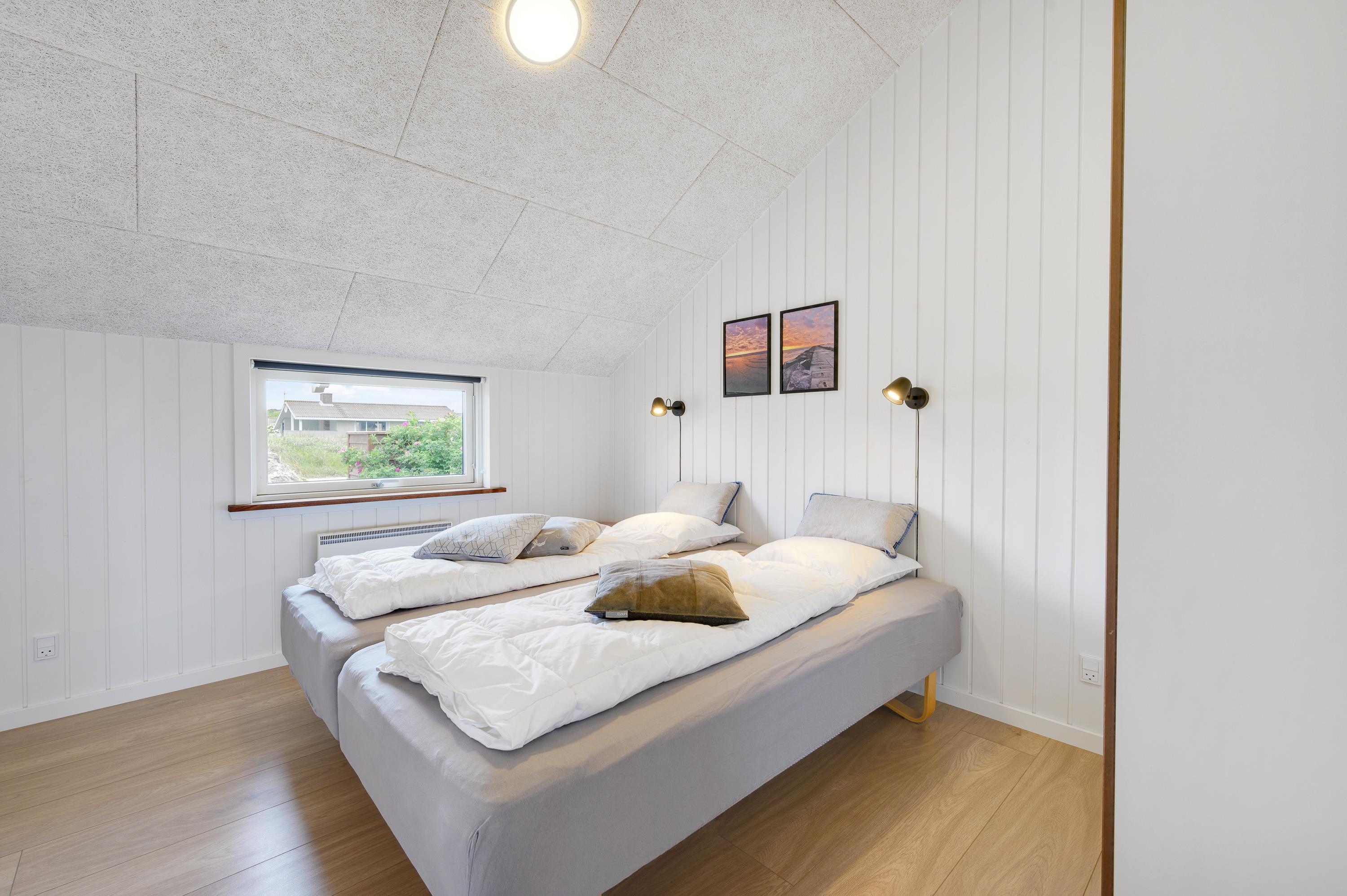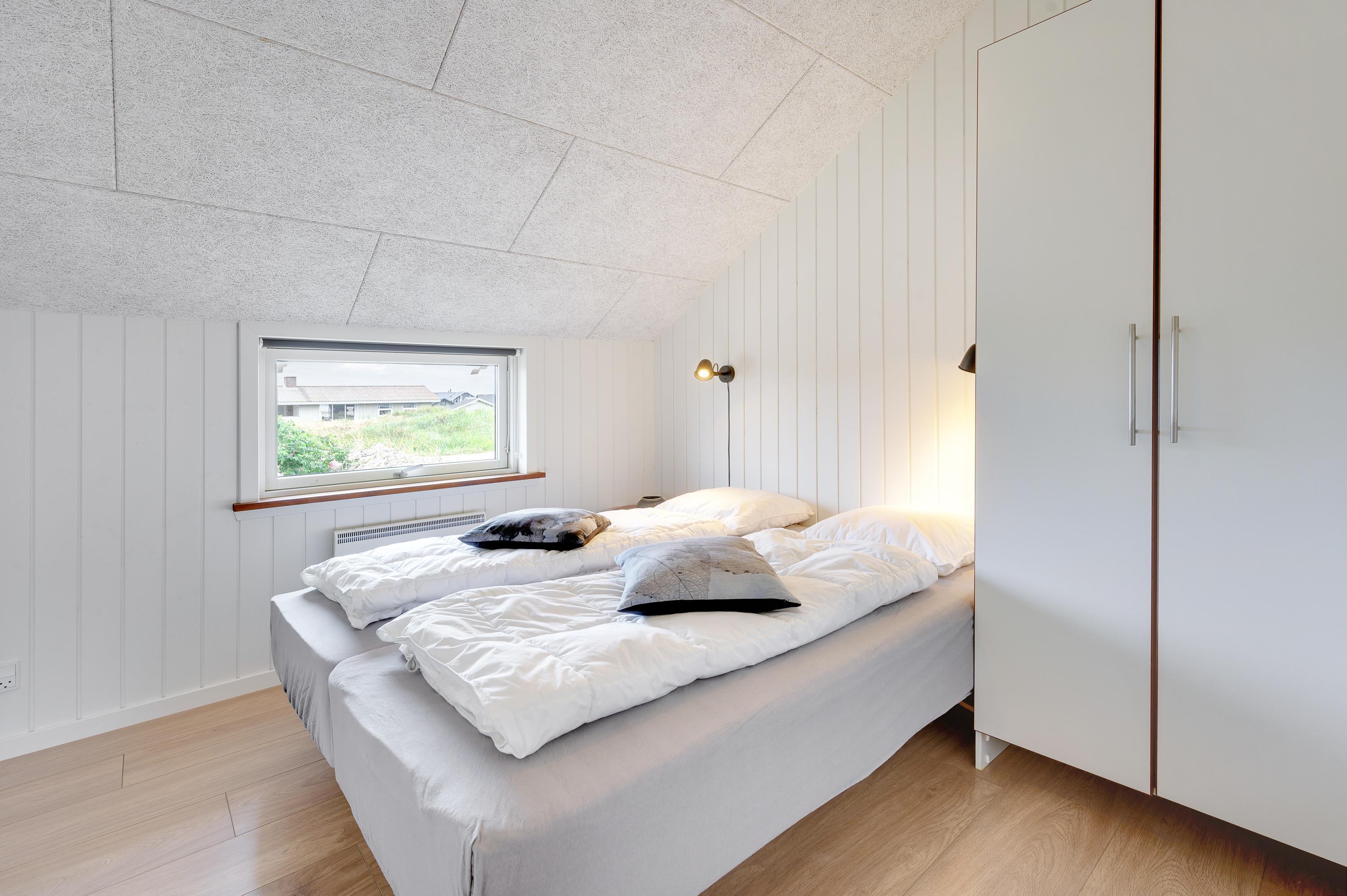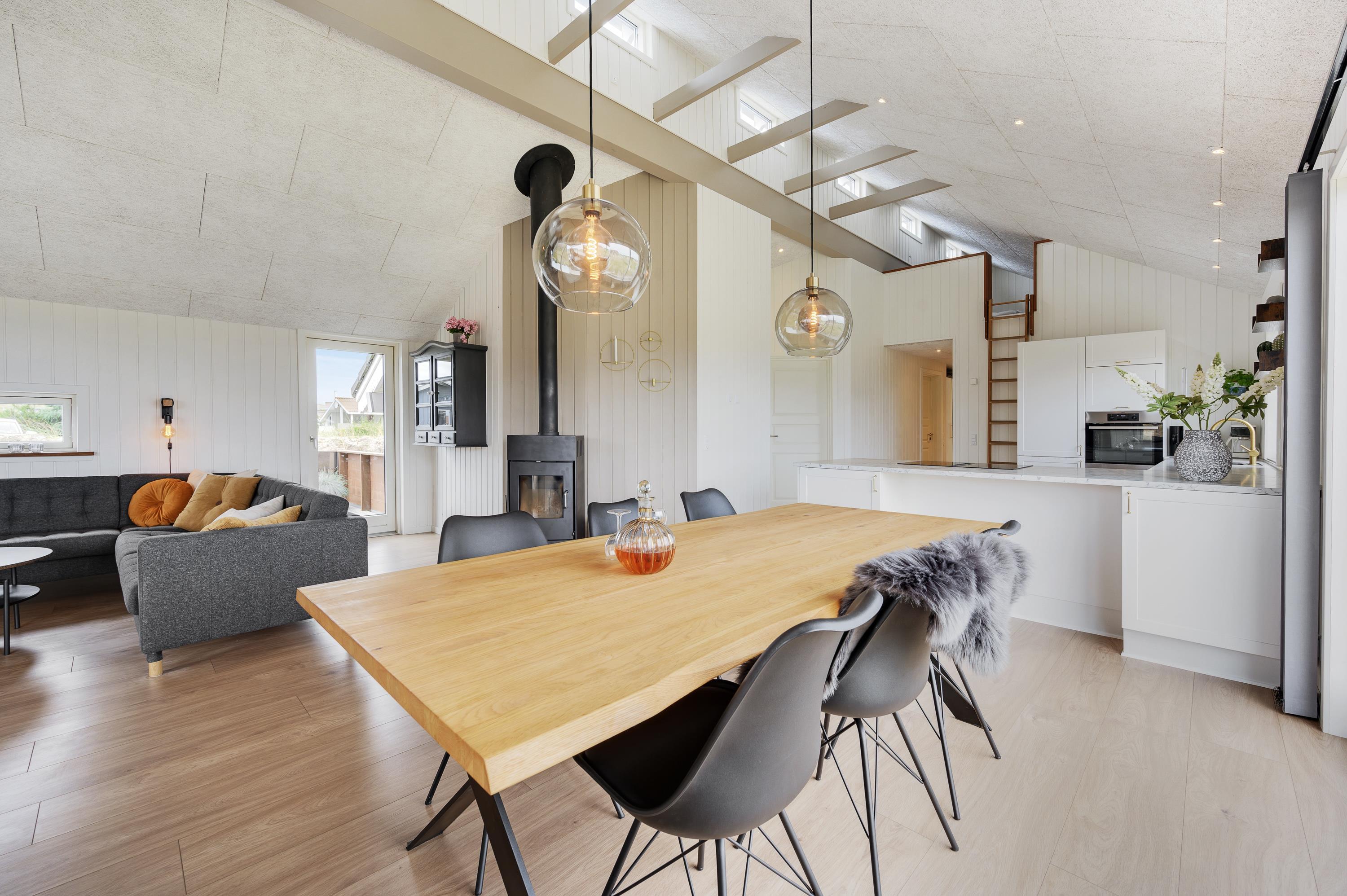 Your holiday home features modern, thoughtful furnishings. Multiple skylights and window fronts provide abundant natural light. For a restful night's sleep, the holiday home offers three bedrooms with two double beds and two single beds. Additionally, there's a comfortable mezzanine with two more cosy sleeping spaces.
