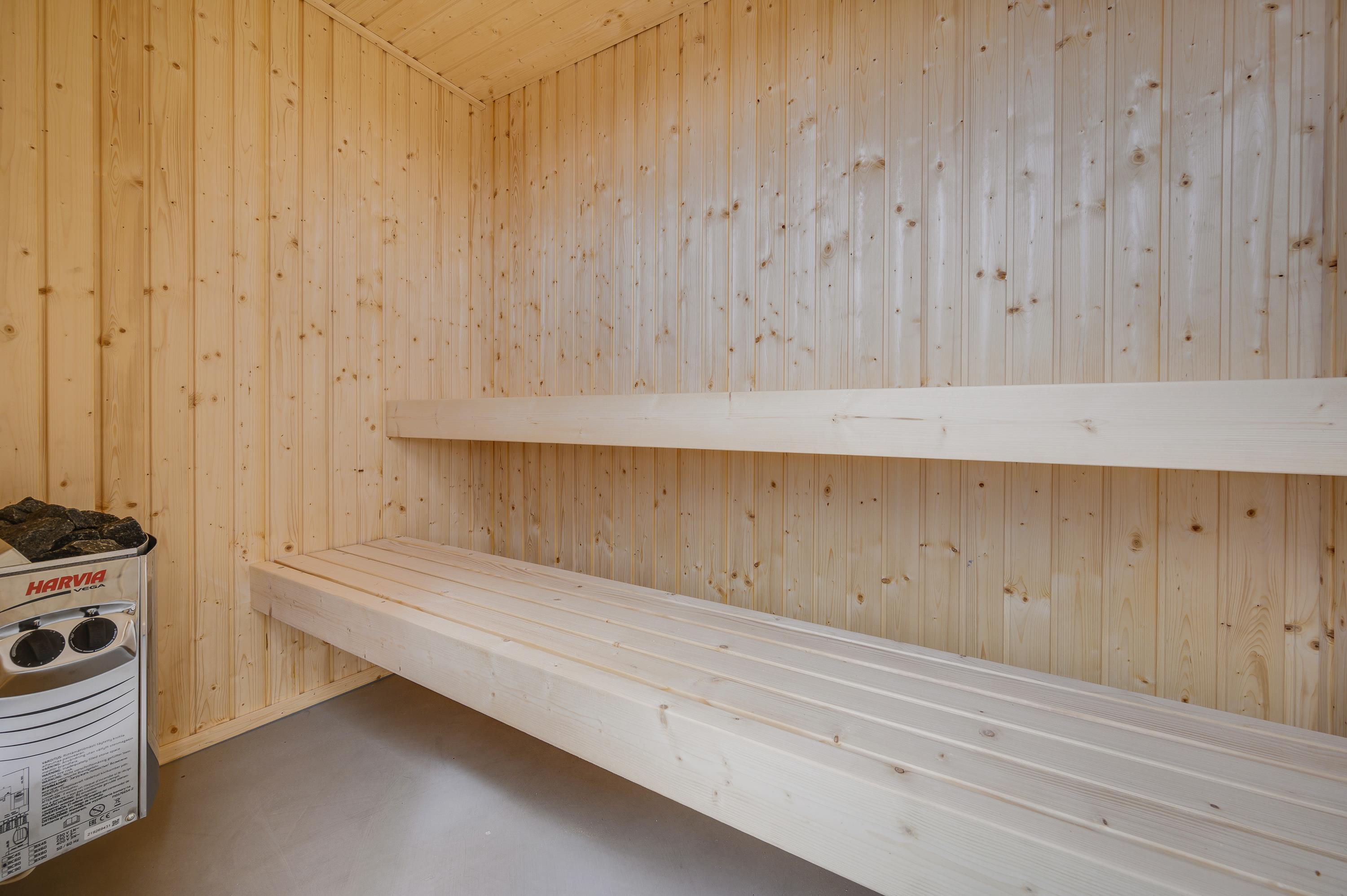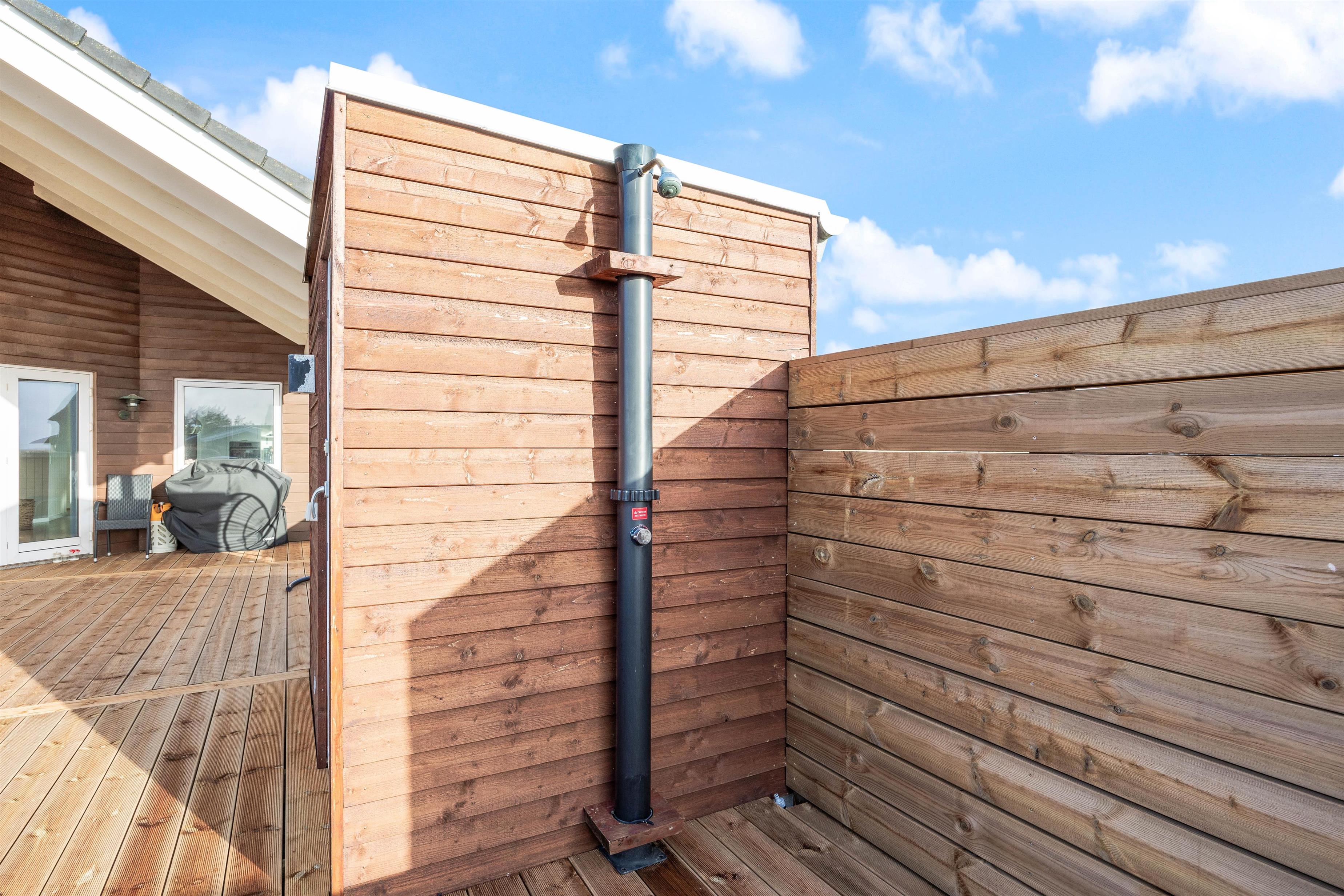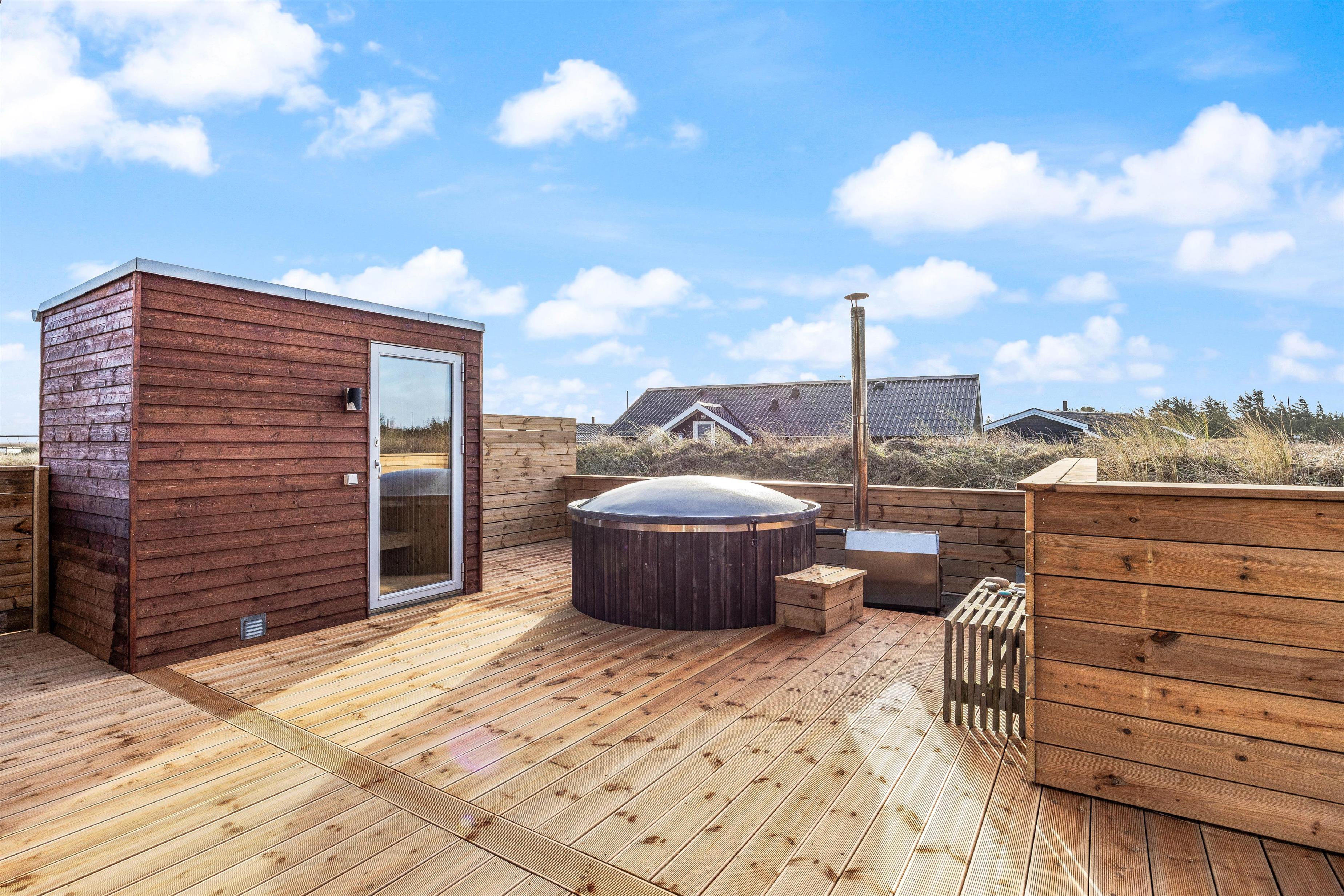 Spacious outdoor area with sauna, shower and Nordic hot tub