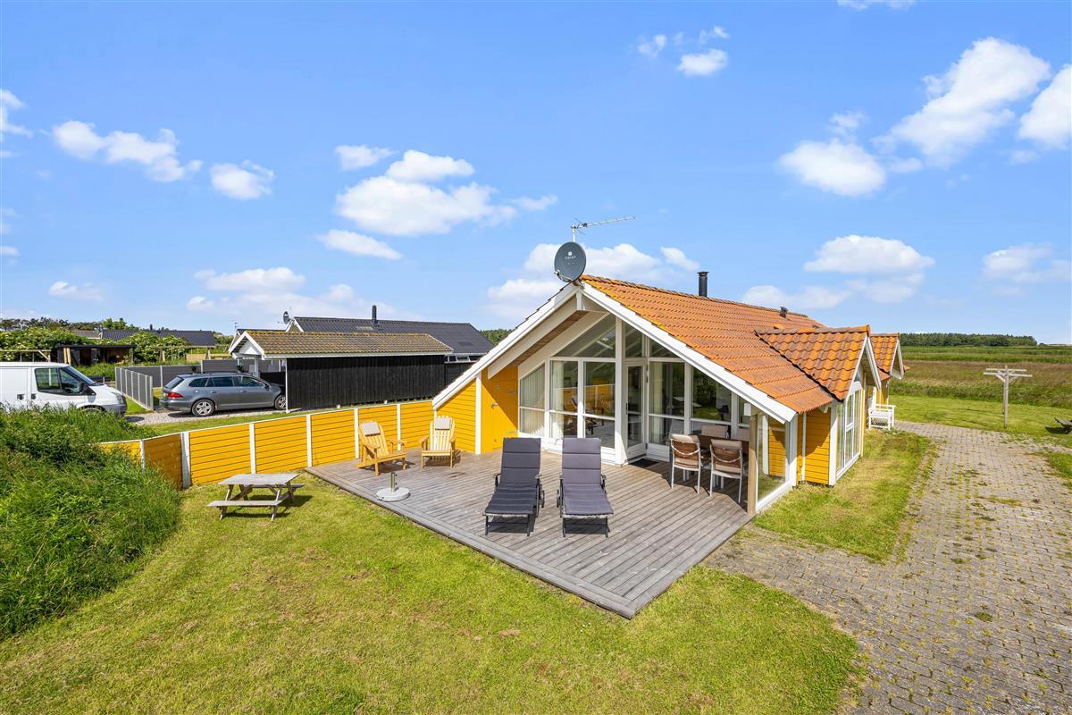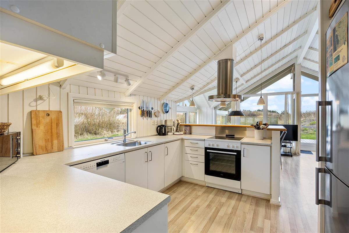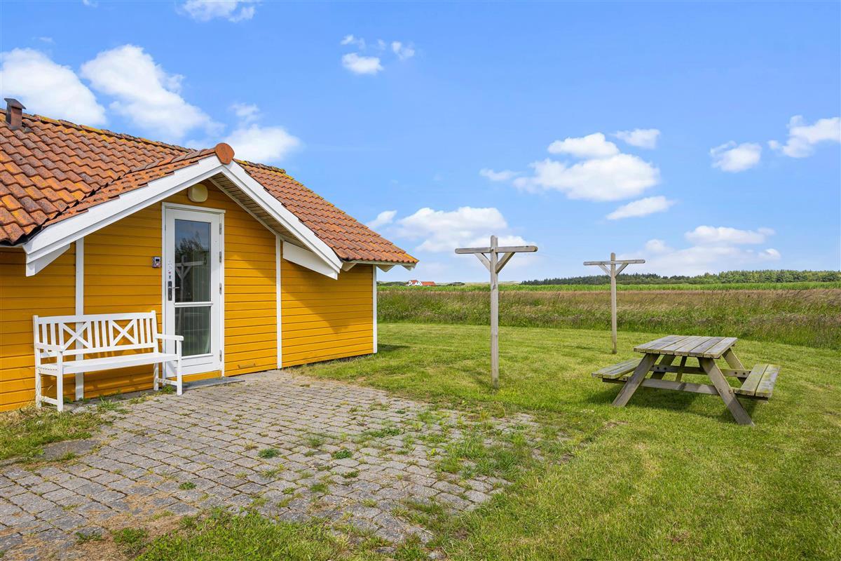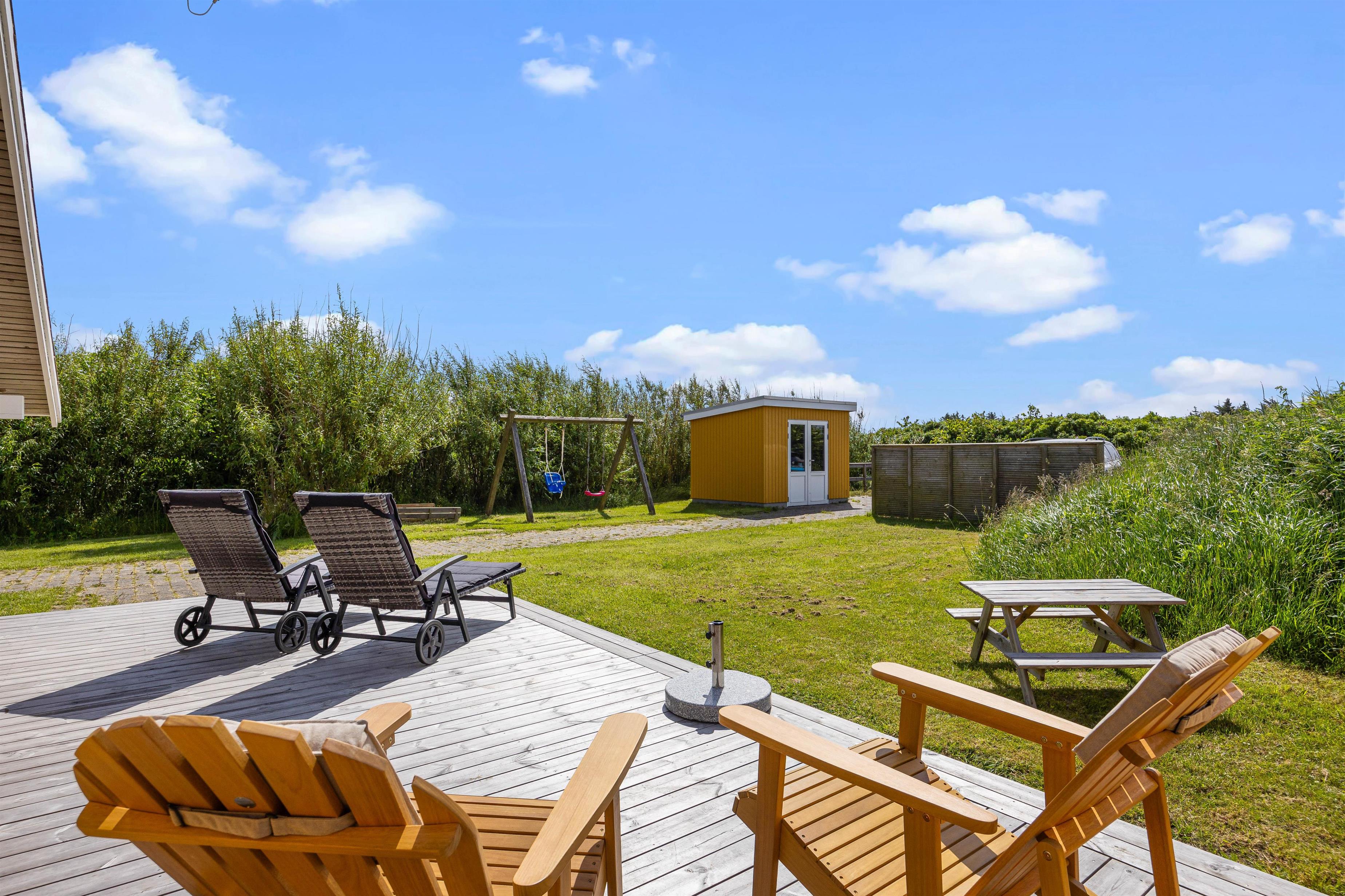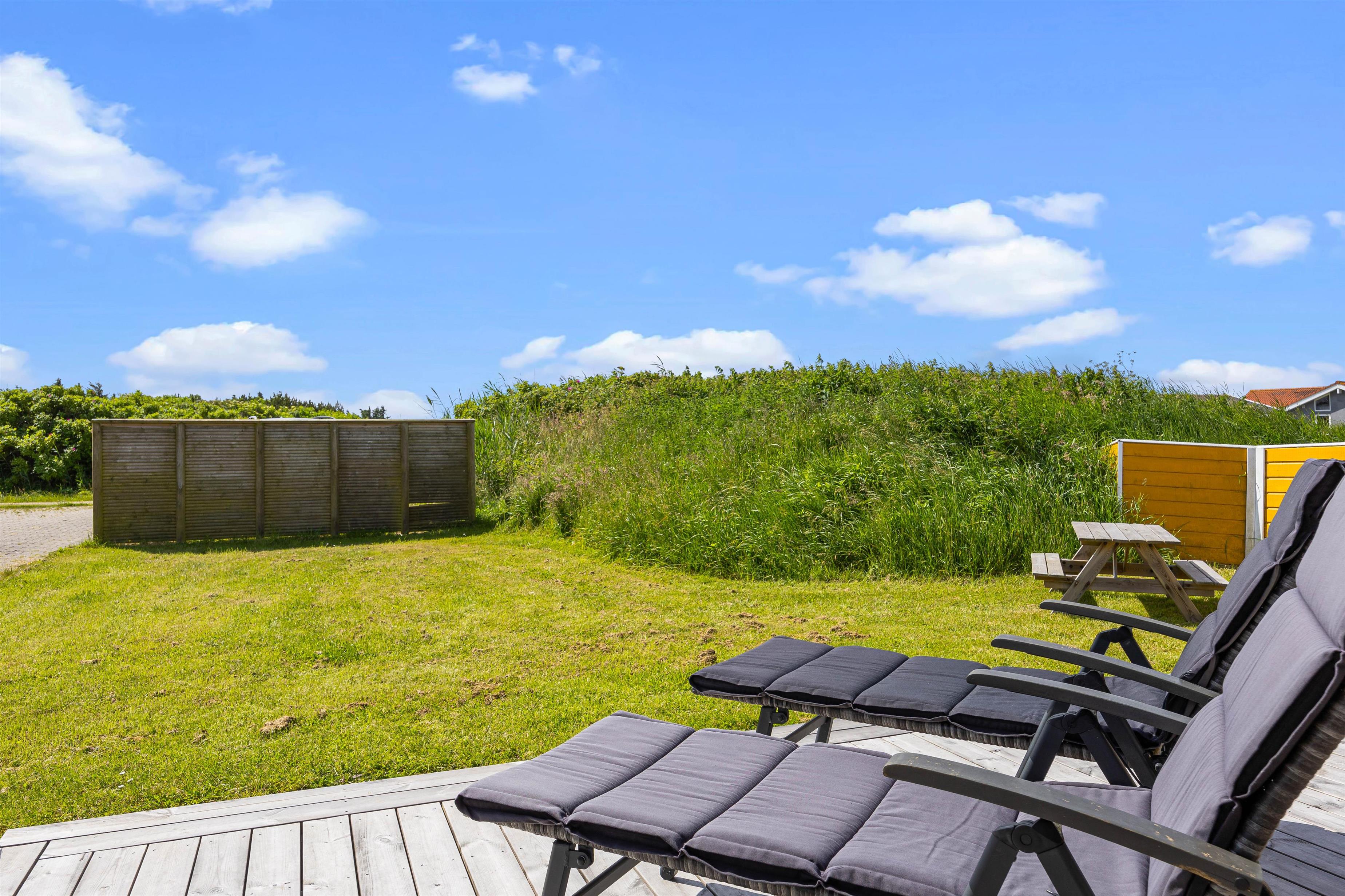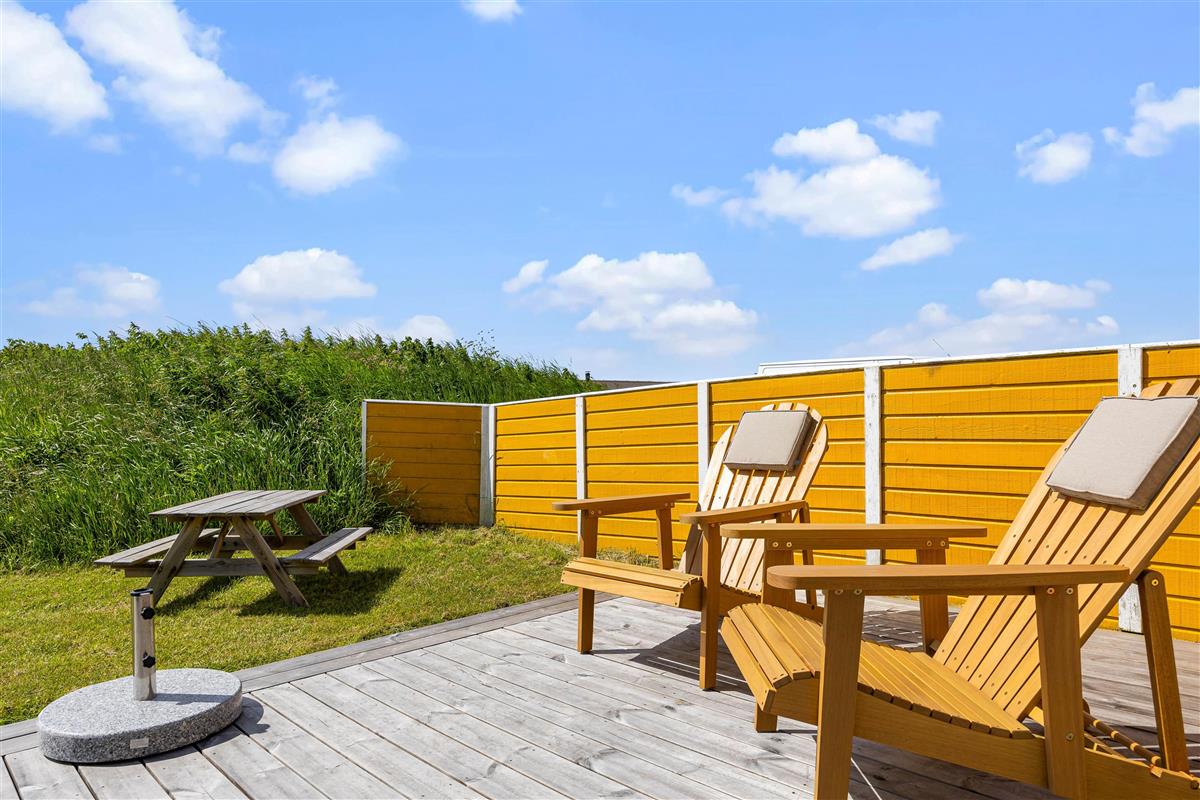 Outside, you can enjoy peace and quiet on the beautiful terrace. Garden furniture and sun loungers await you - and the partially covered terrace offers both sunny and shaded spots. Enjoy the salty breeze and beautiful views across the wide meadows to Ringkøbing Fjord.