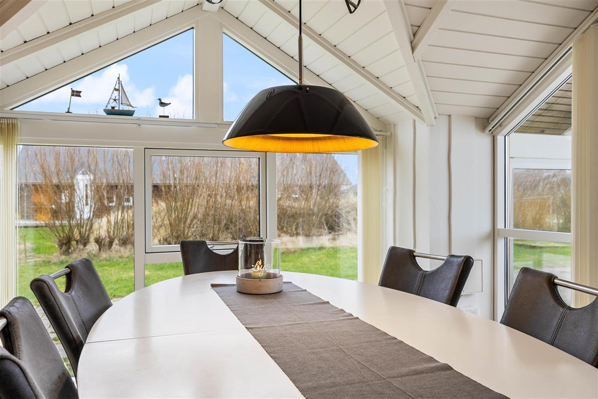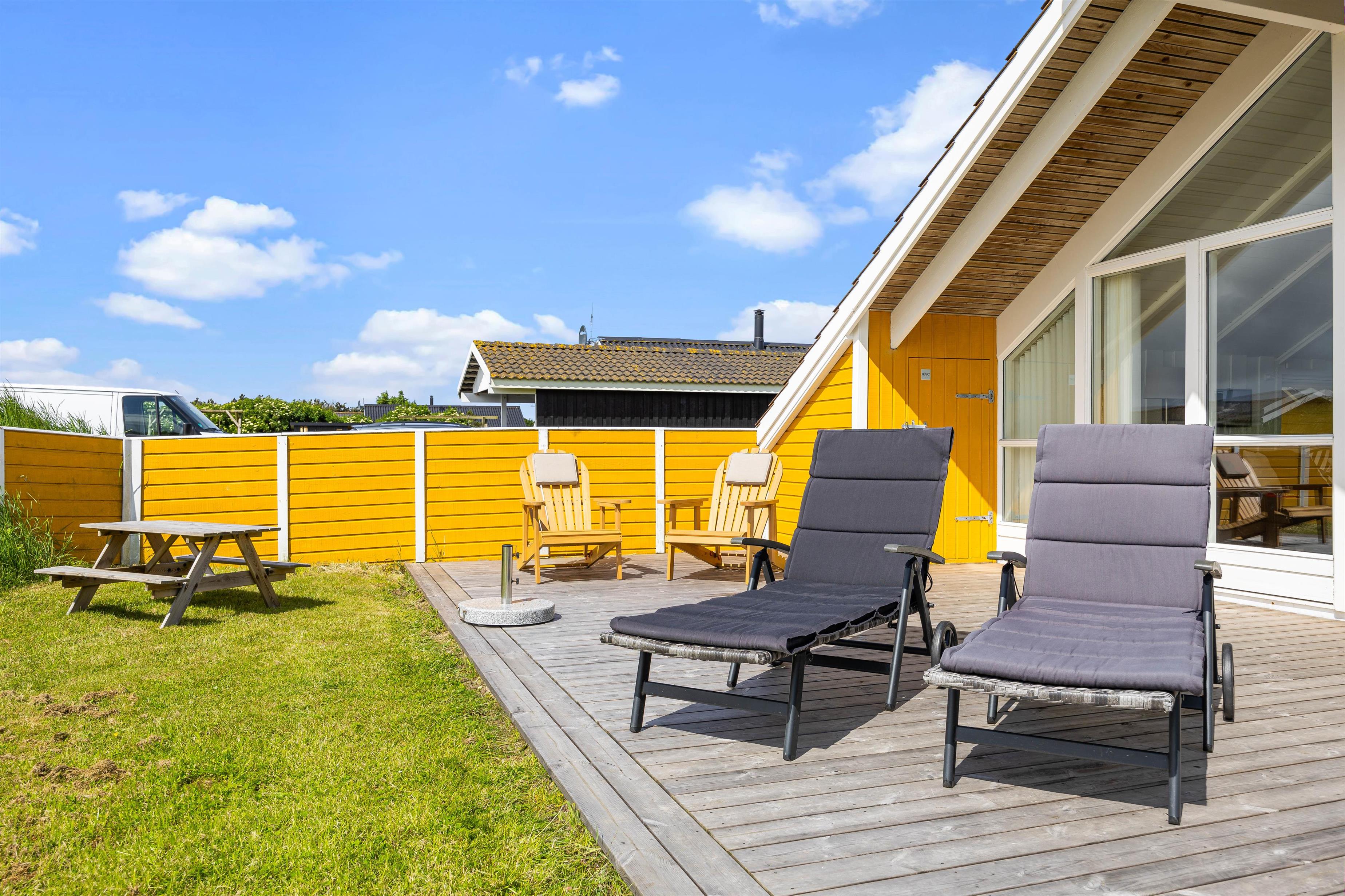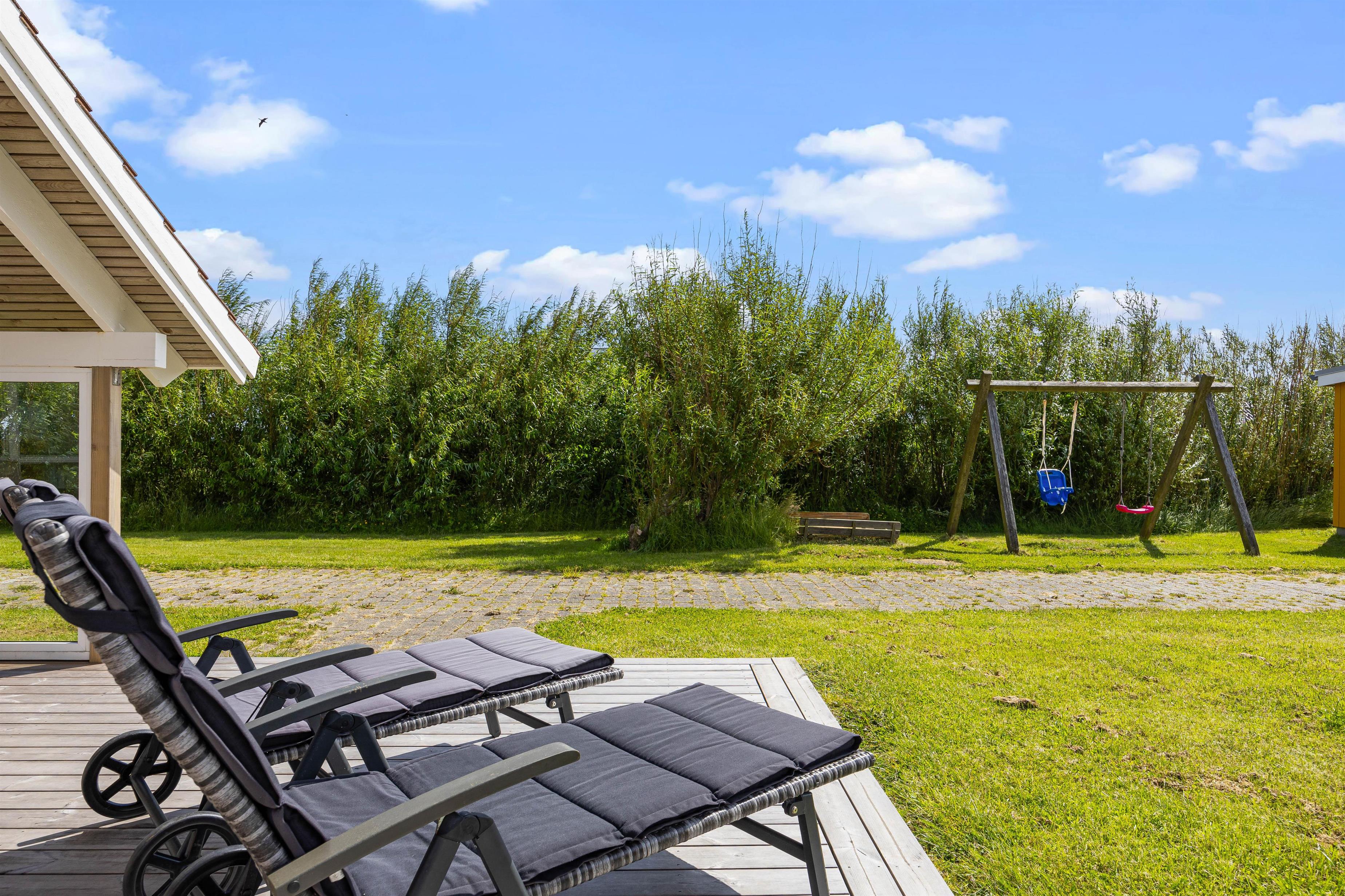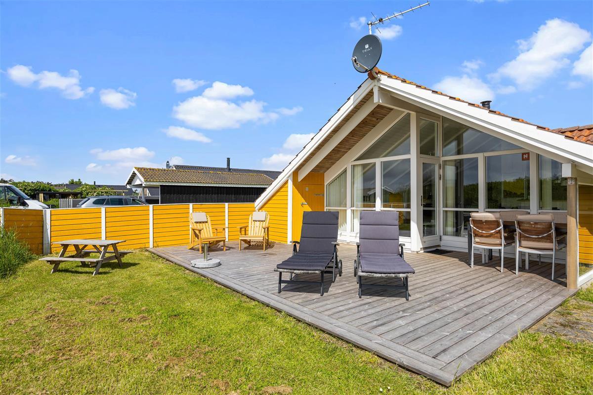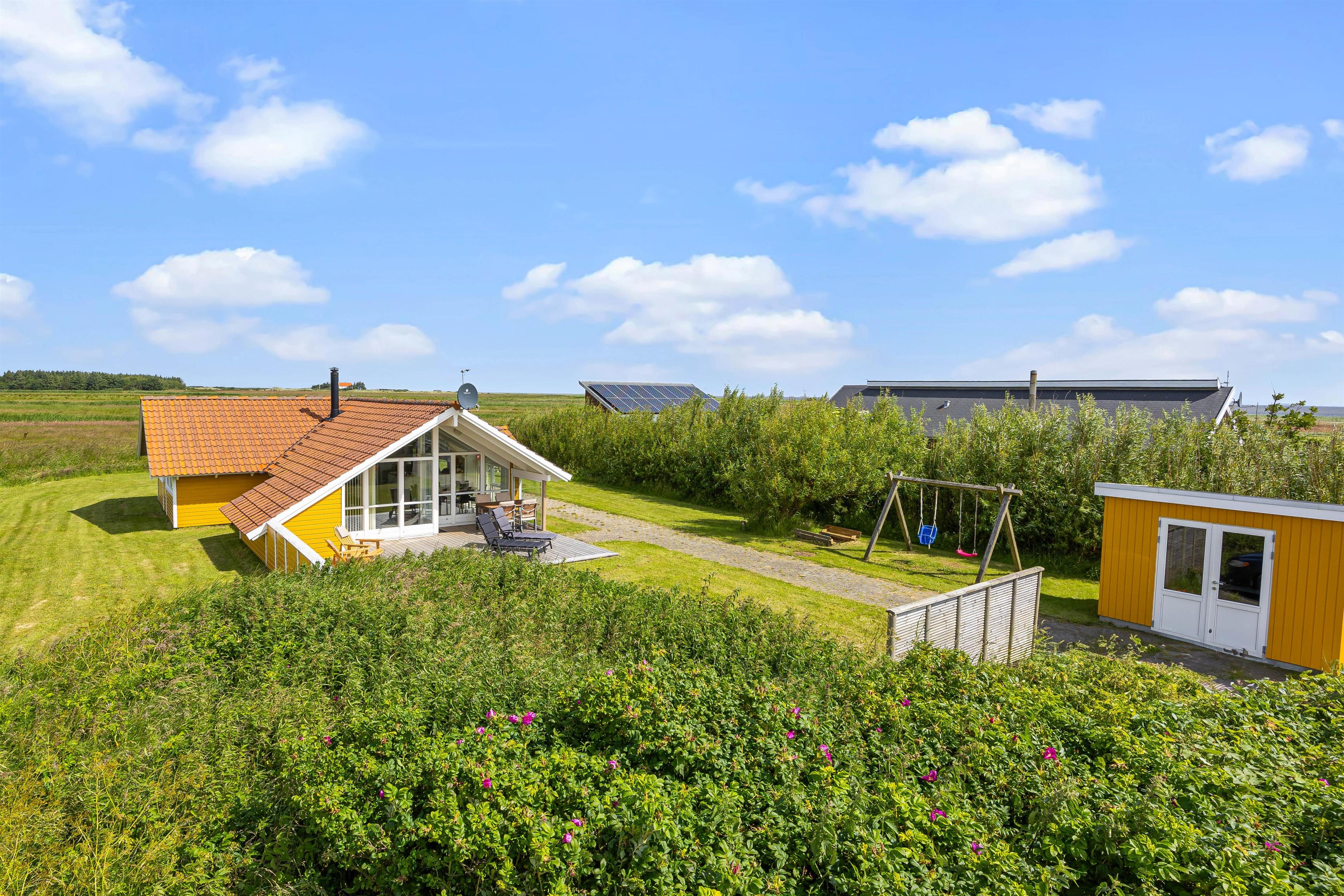 Outside, you can enjoy peace and quiet on the beautiful terrace. Garden furniture and sun loungers await you - and the partially covered terrace offers both sunny and shaded spots. Enjoy the salty breeze and beautiful views across the wide meadows to Ringkøbing Fjord.