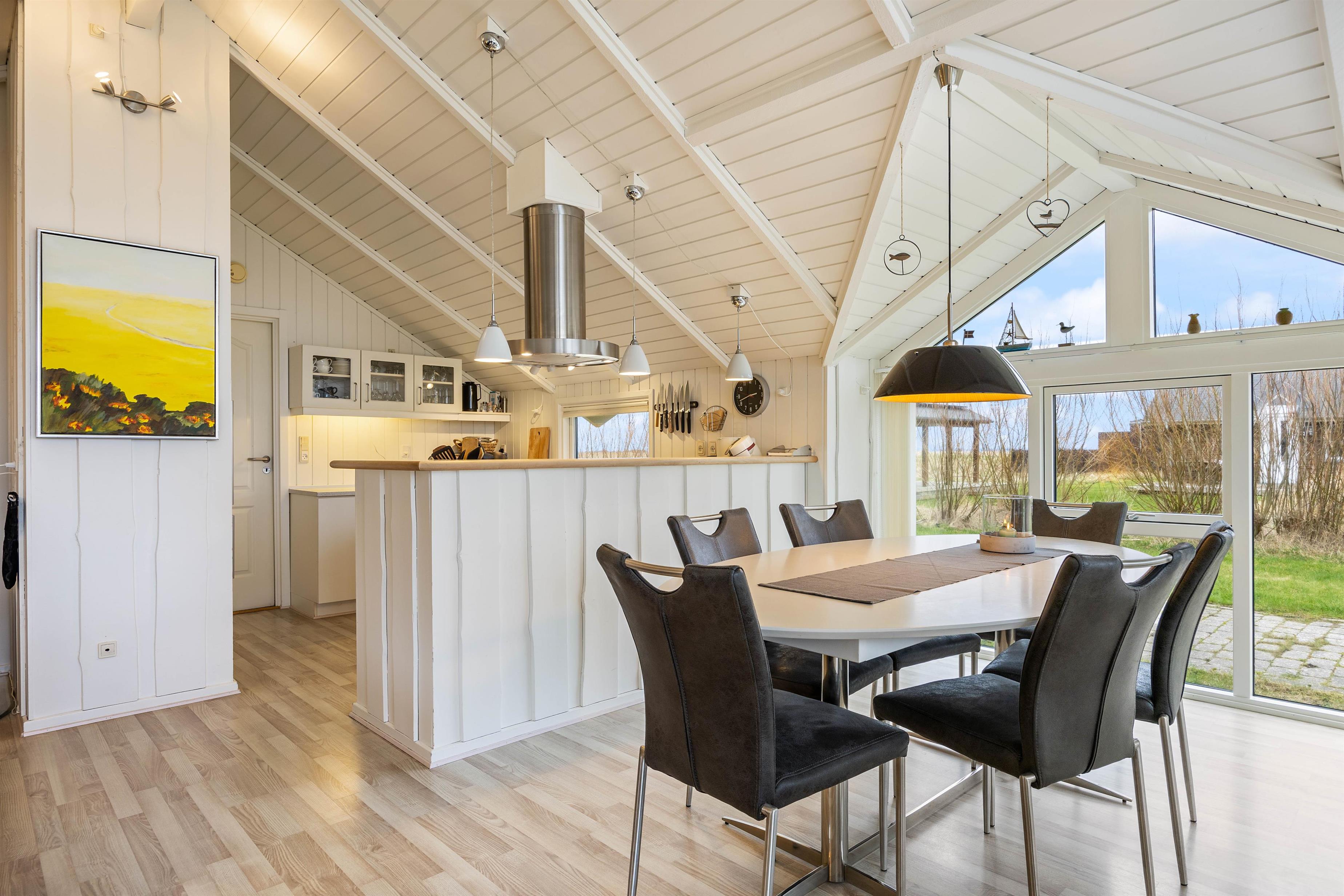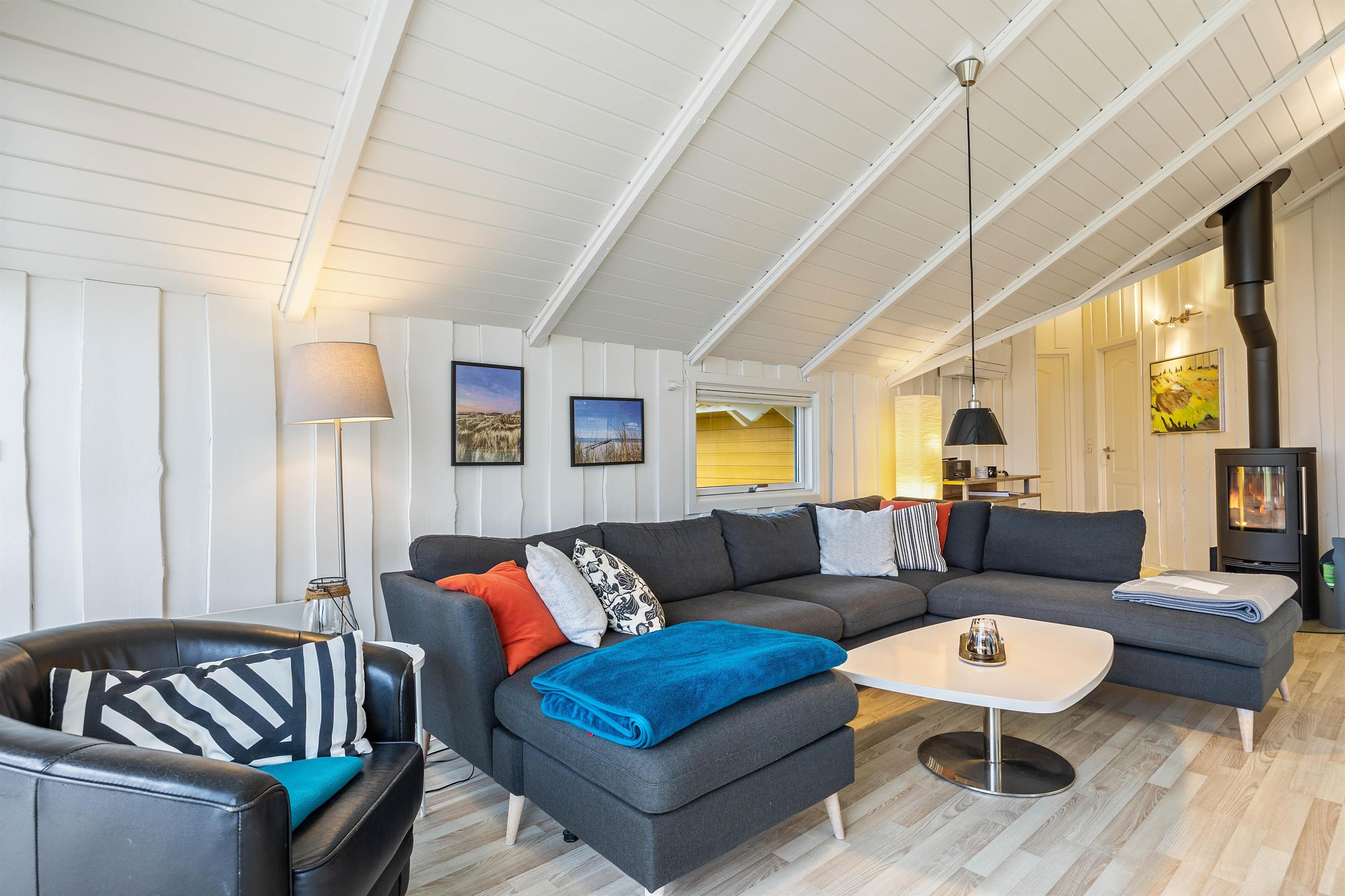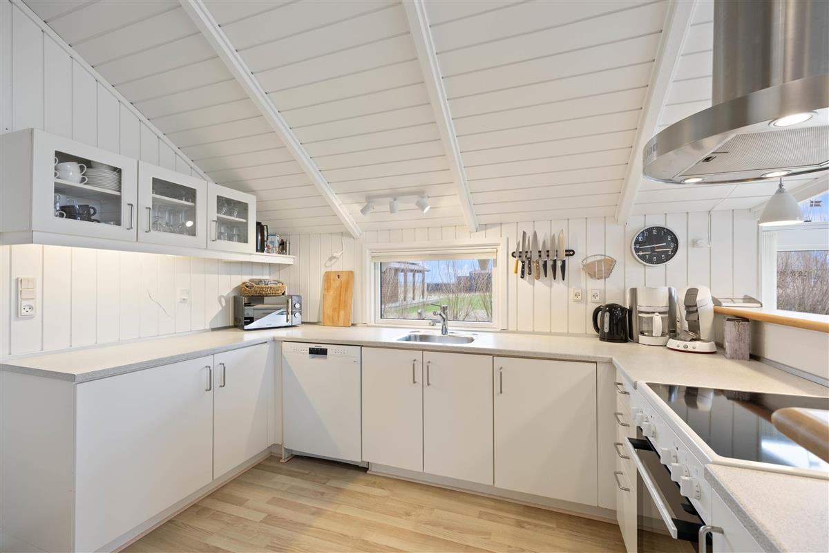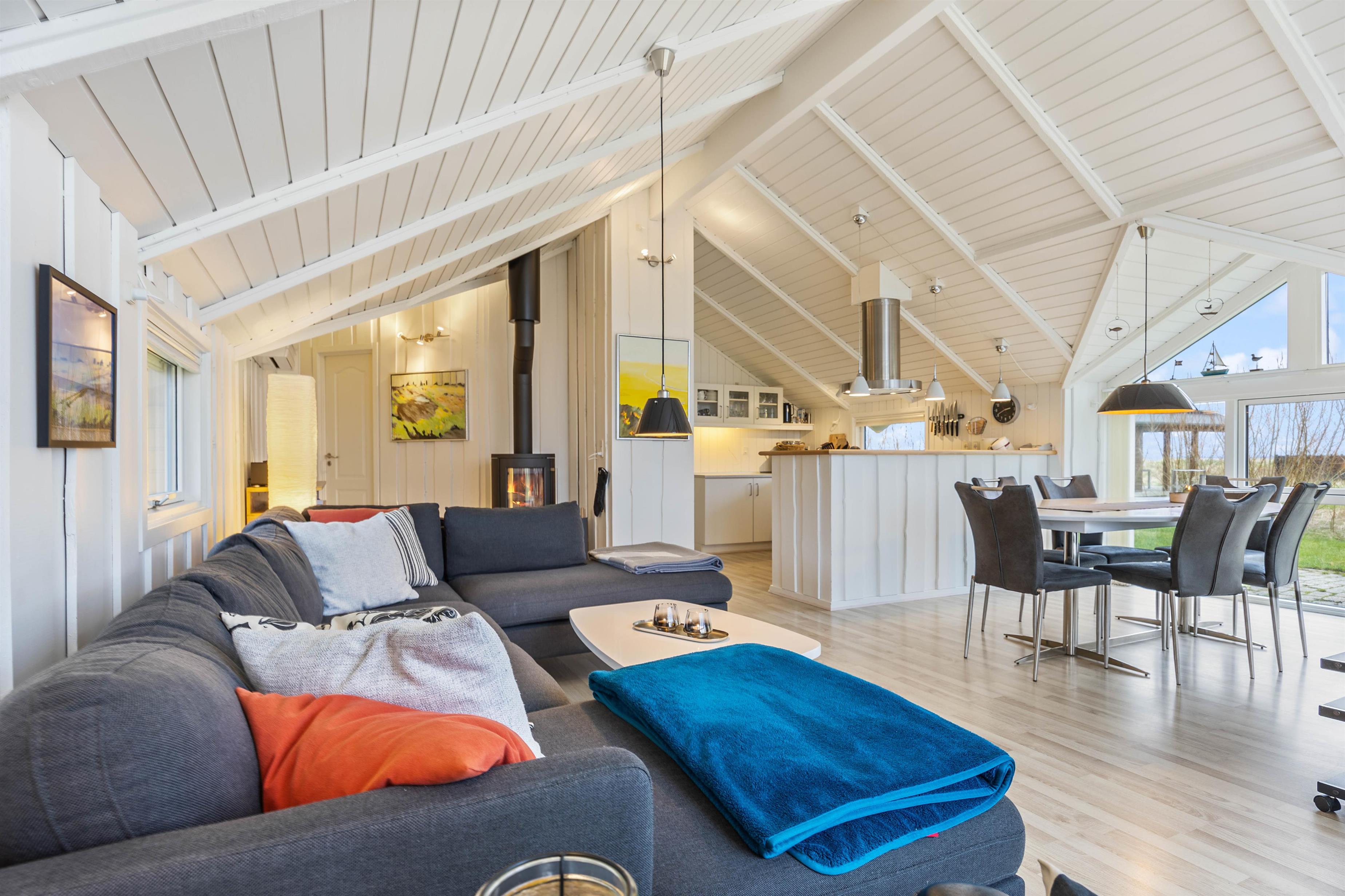 "Solsikken" is a typical Danish holiday home exuding a cosy atmosphere and was renovated in 2022. There's plenty of space for comfort and relaxation with a whirlpool and sauna. The centrepiece is the bright and sunny open-plan living, dining and kitchen area. Here you'll find ample space for shared activities, while white wood panelling and large windows create a welcoming atmosphere.