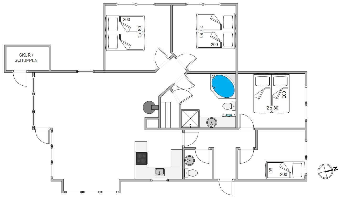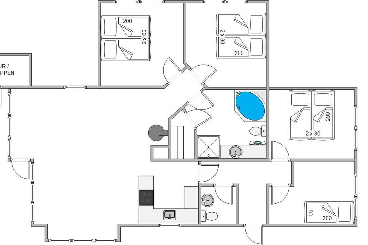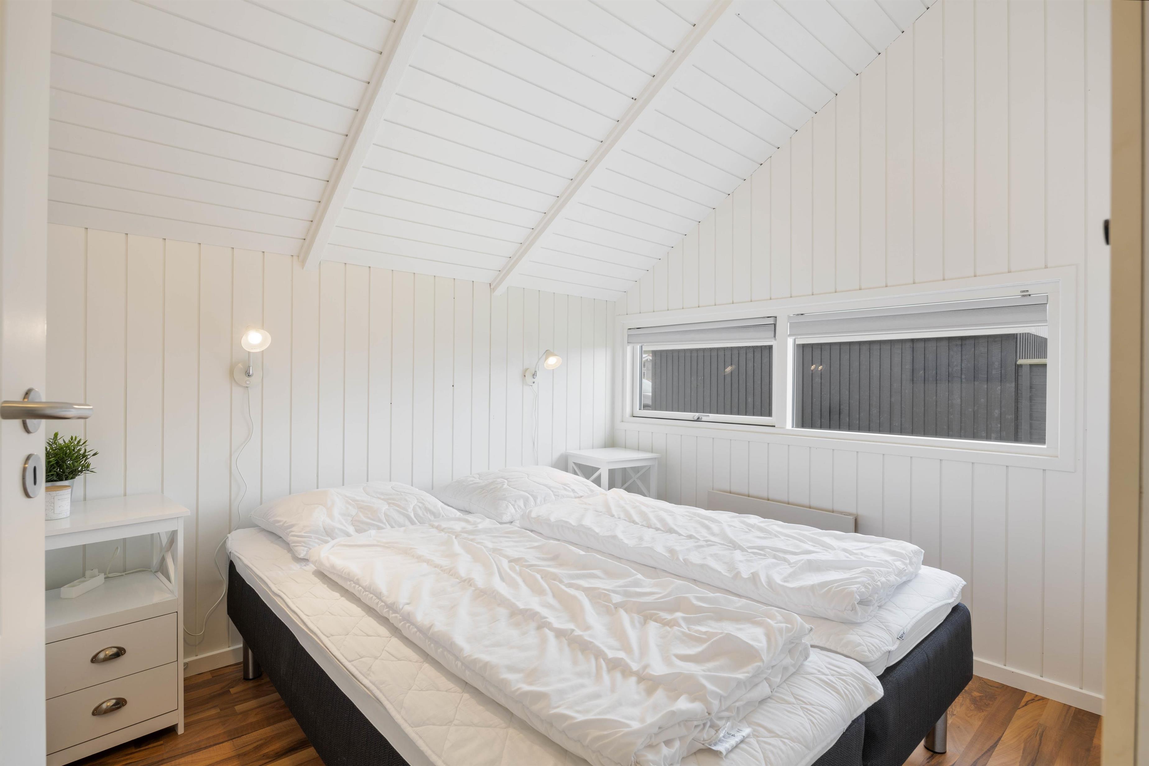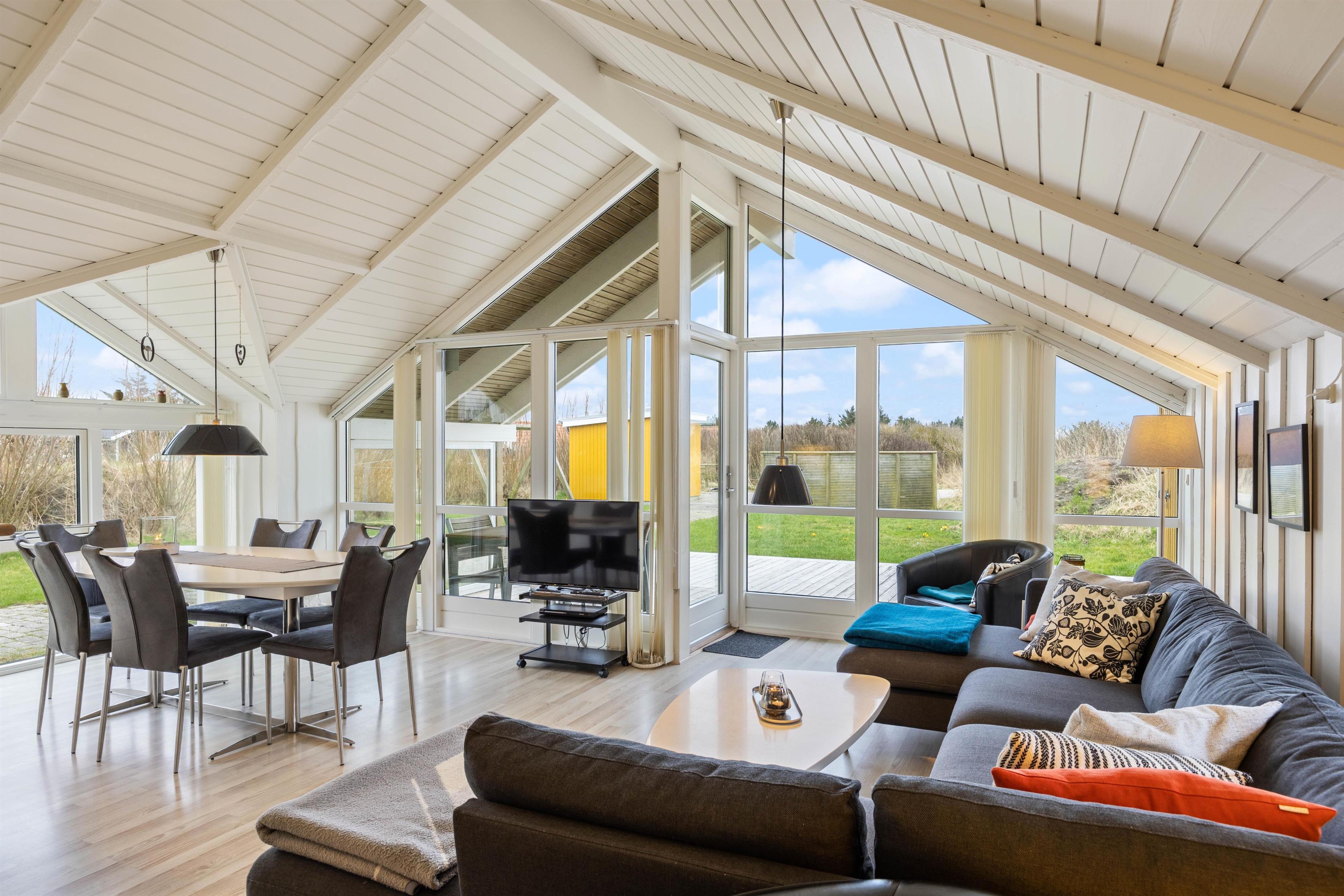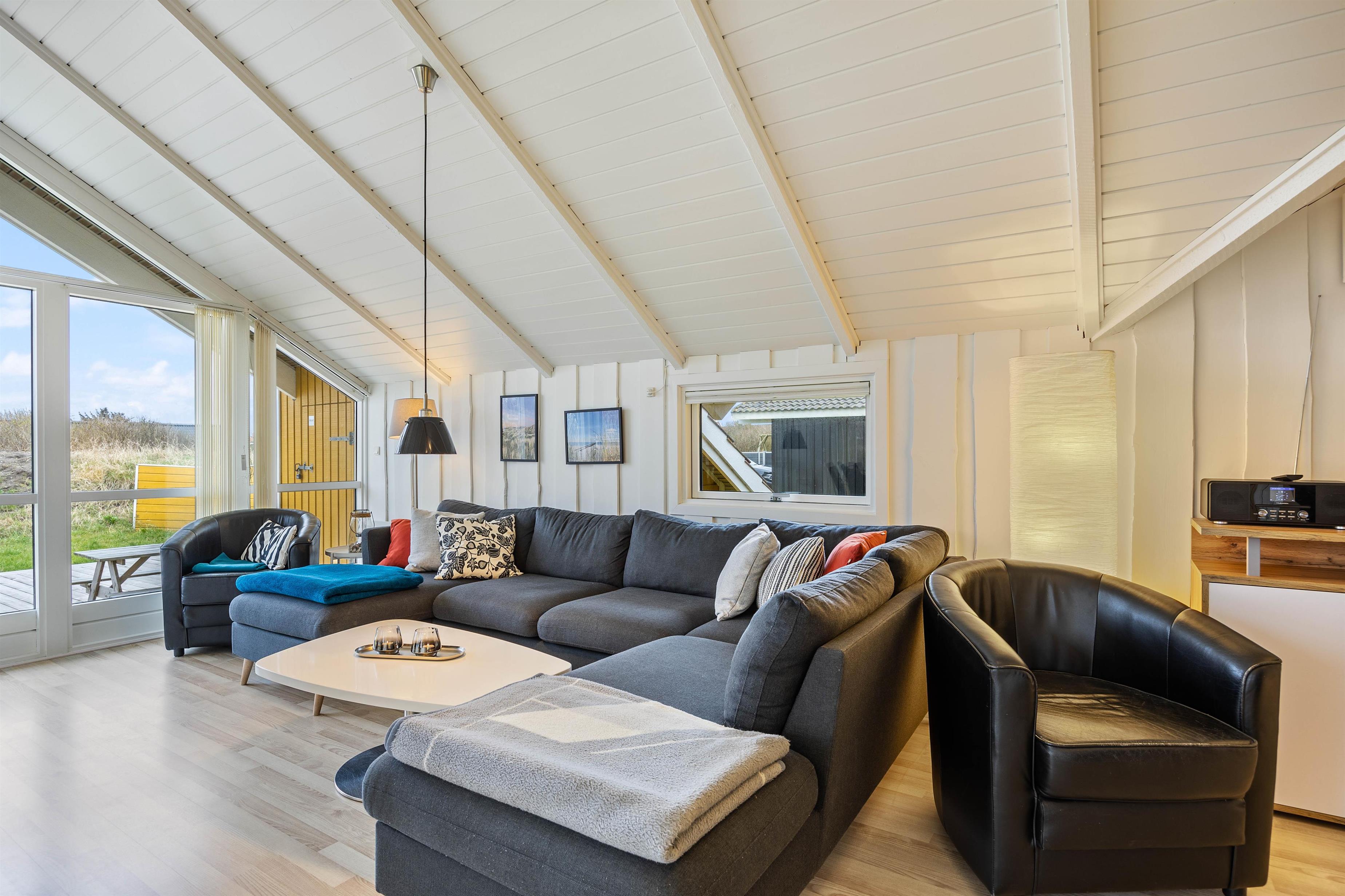 "Solsikken" is a typical Danish holiday home exuding a cosy atmosphere and was renovated in 2022. There's plenty of space for comfort and relaxation with a whirlpool and sauna. The centrepiece is the bright and sunny open-plan living, dining and kitchen area. Here you'll find ample space for shared activities, while white wood panelling and large windows create a welcoming atmosphere.