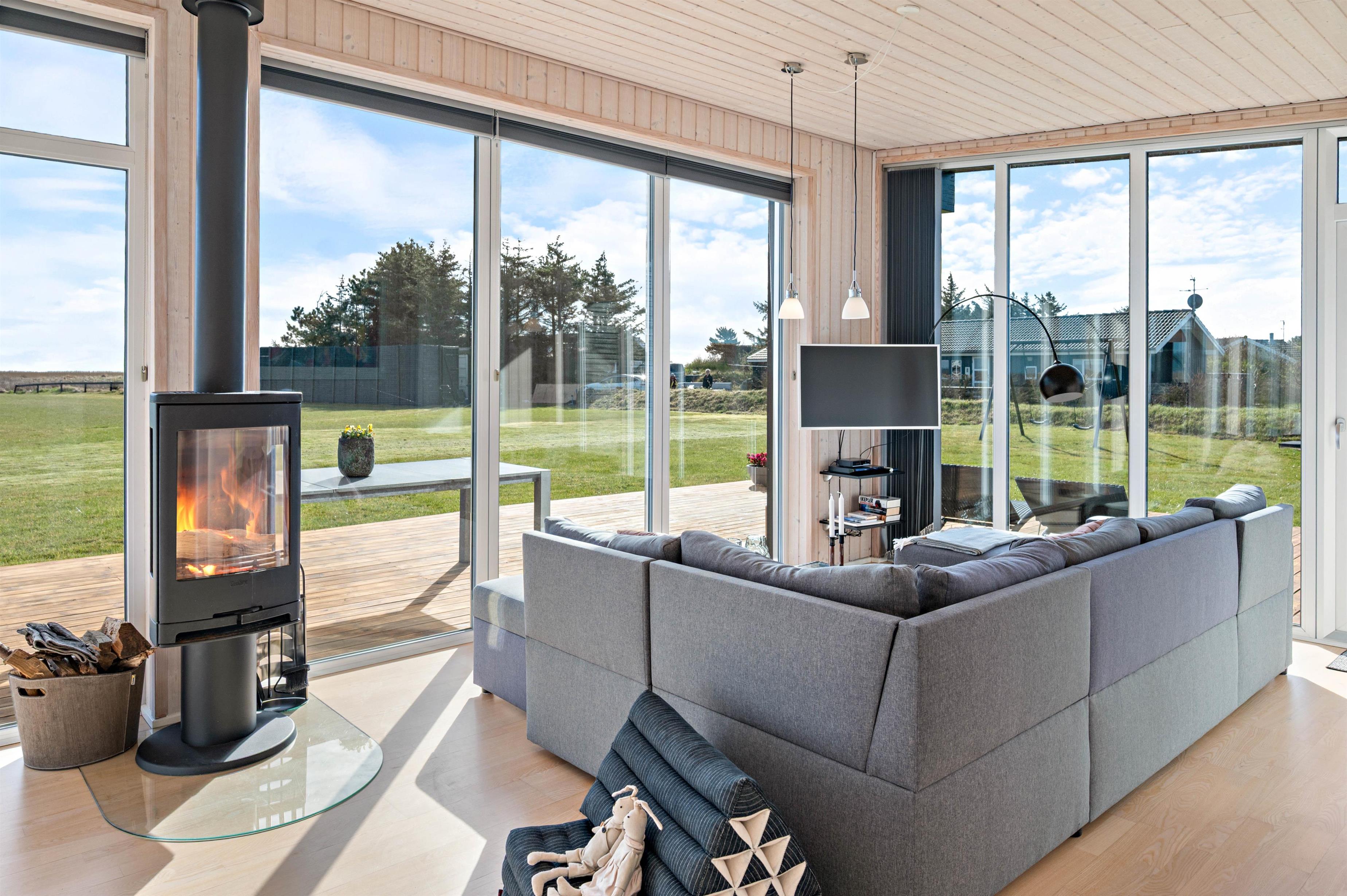 The living room and open-plan kitchen are flooded with light through large picture windows, offering views across the beautiful landscape. The wood-burning stove provides welcoming warmth on cooler days, and after an extended walk on the North Sea beach, you can relax in the whirlpool.