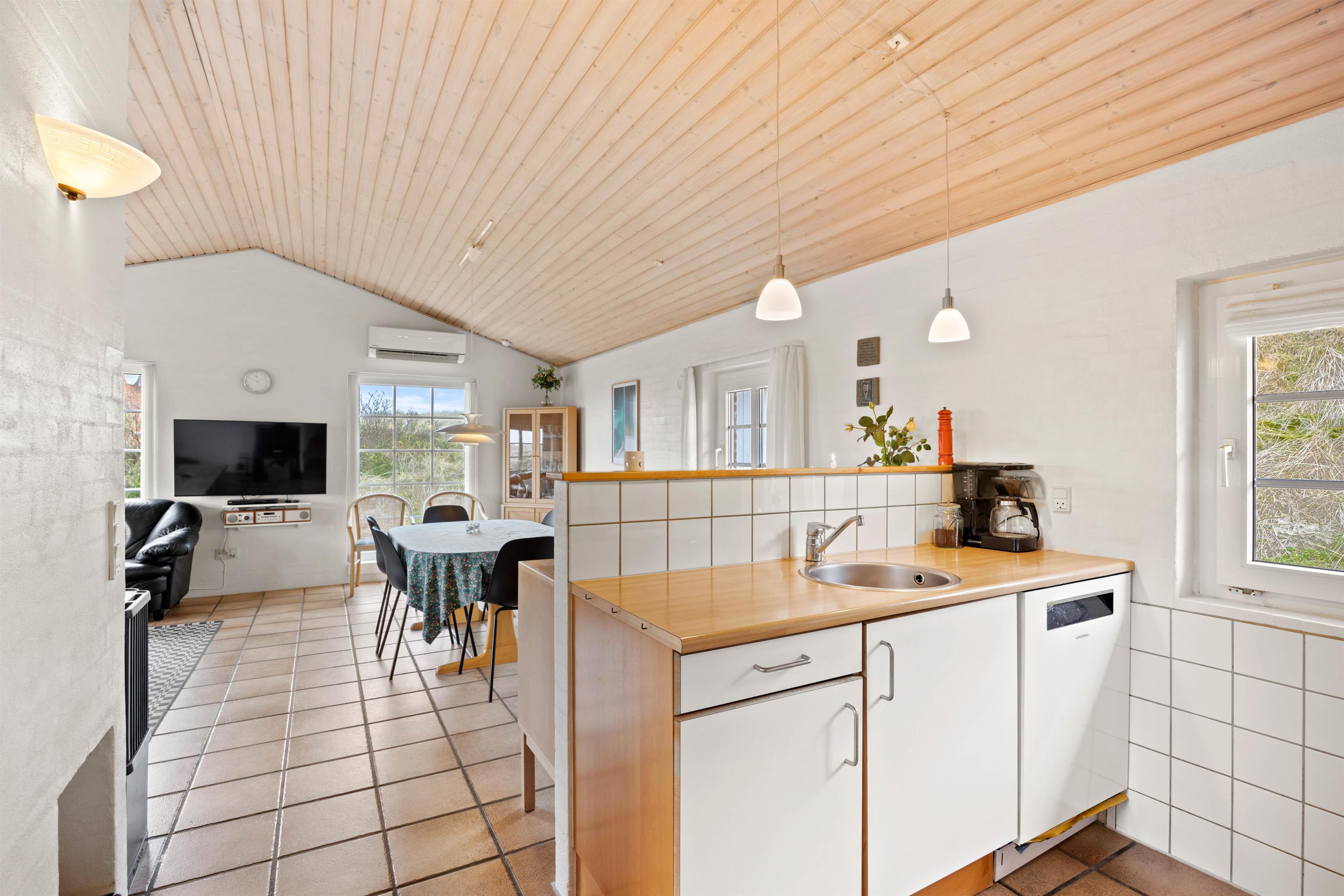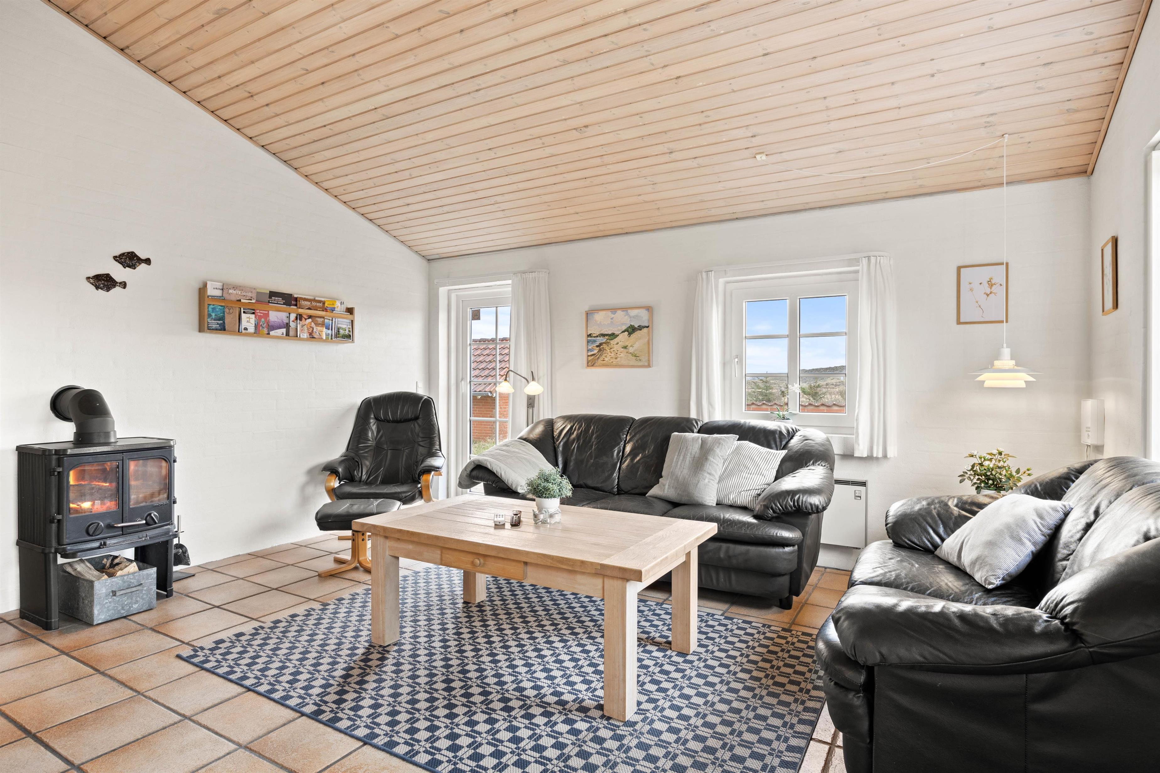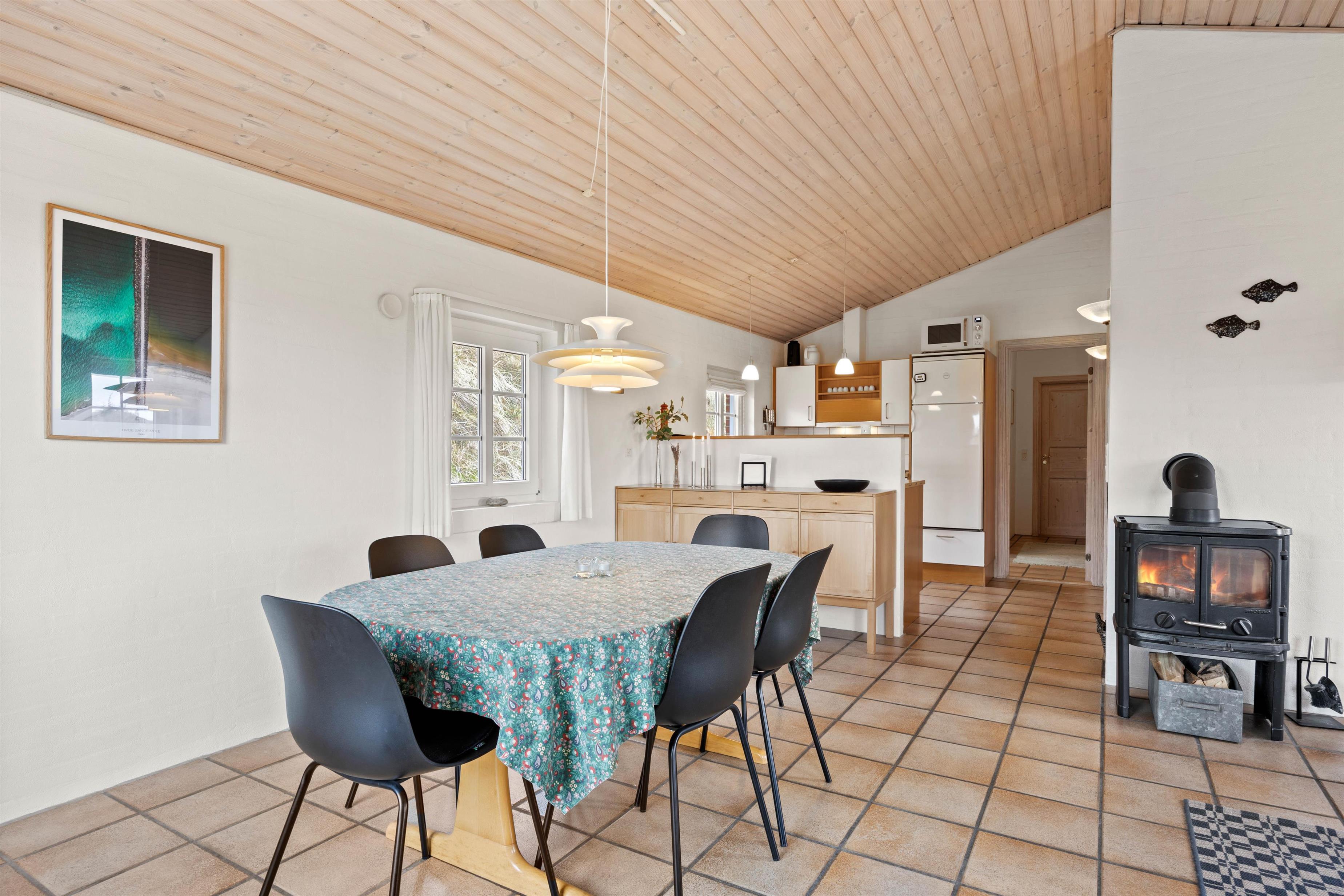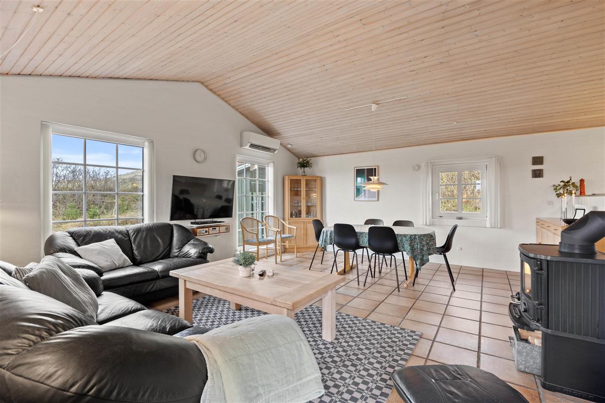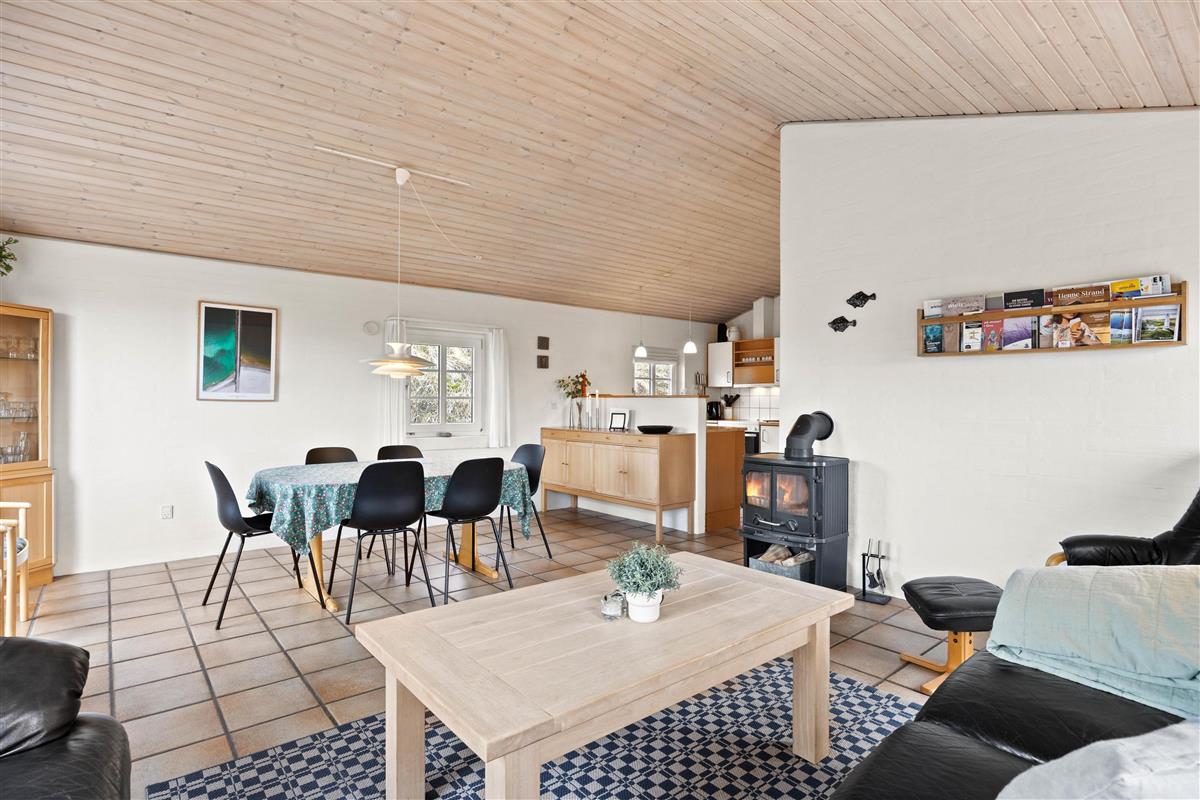 The holiday home at Vinterlejevej 7 is furnished in traditional Danish holiday home style. The open-plan living area forms the heart of the holiday home, combining the living room, dining area and kitchen to create a sociable space for family and friends. The spacious living area features a wood-burning stove, complemented by an energy-efficient heat pump for cooler days.