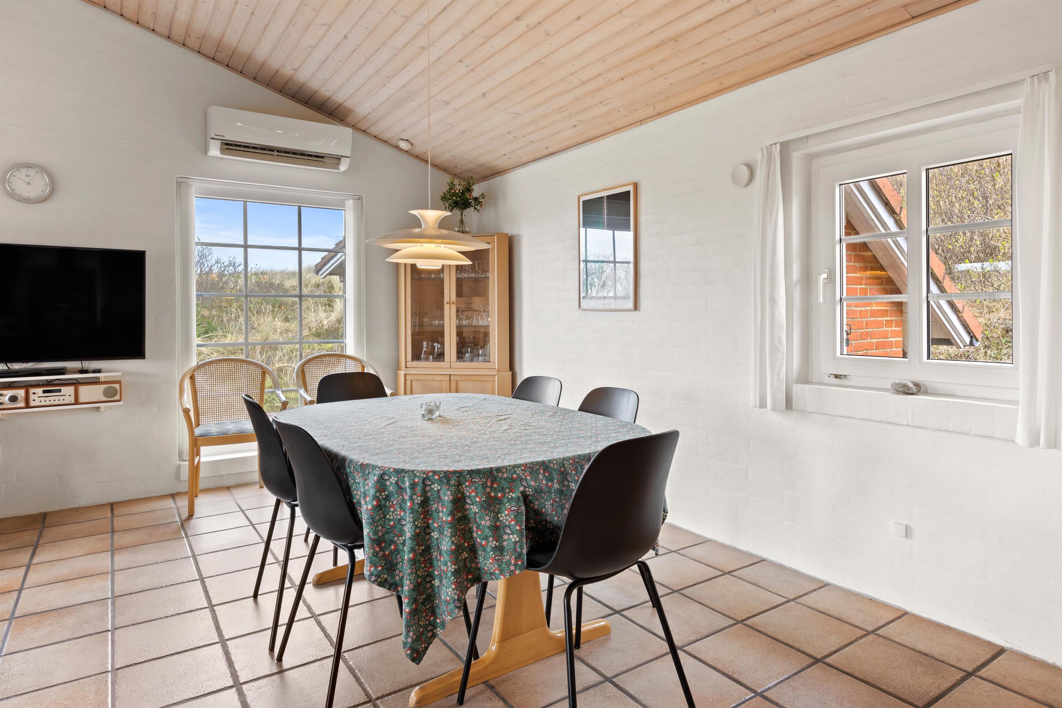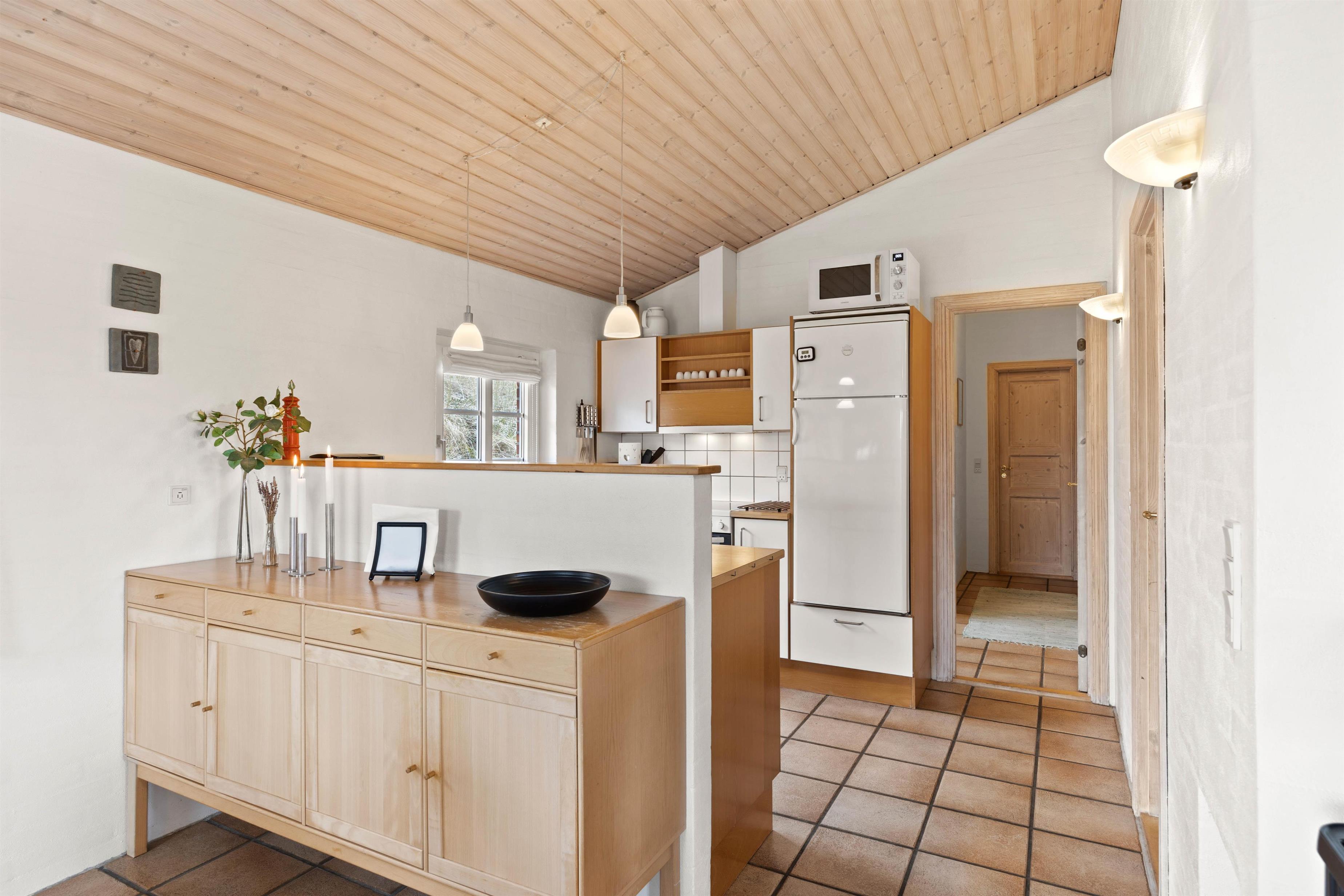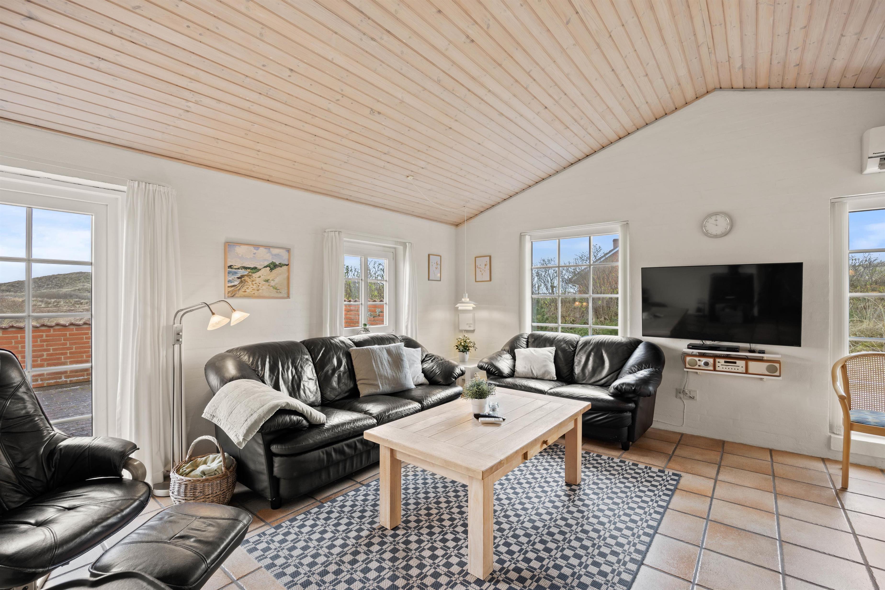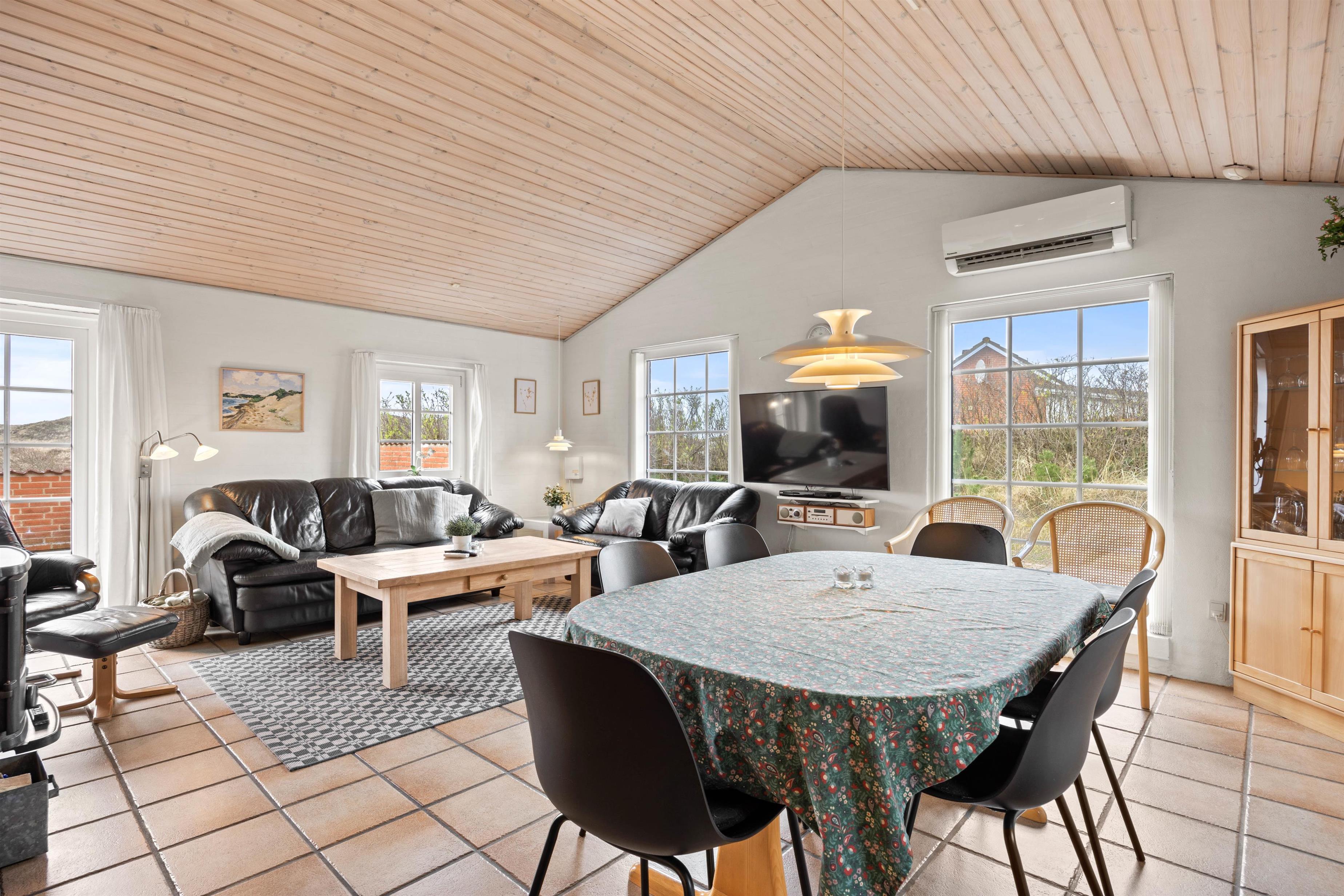 The holiday home at Vinterlejevej 7 is furnished in traditional Danish holiday home style. The open-plan living area forms the heart of the holiday home, combining the living room, dining area and kitchen to create a sociable space for family and friends. The spacious living area features a wood-burning stove, complemented by an energy-efficient heat pump for cooler days.