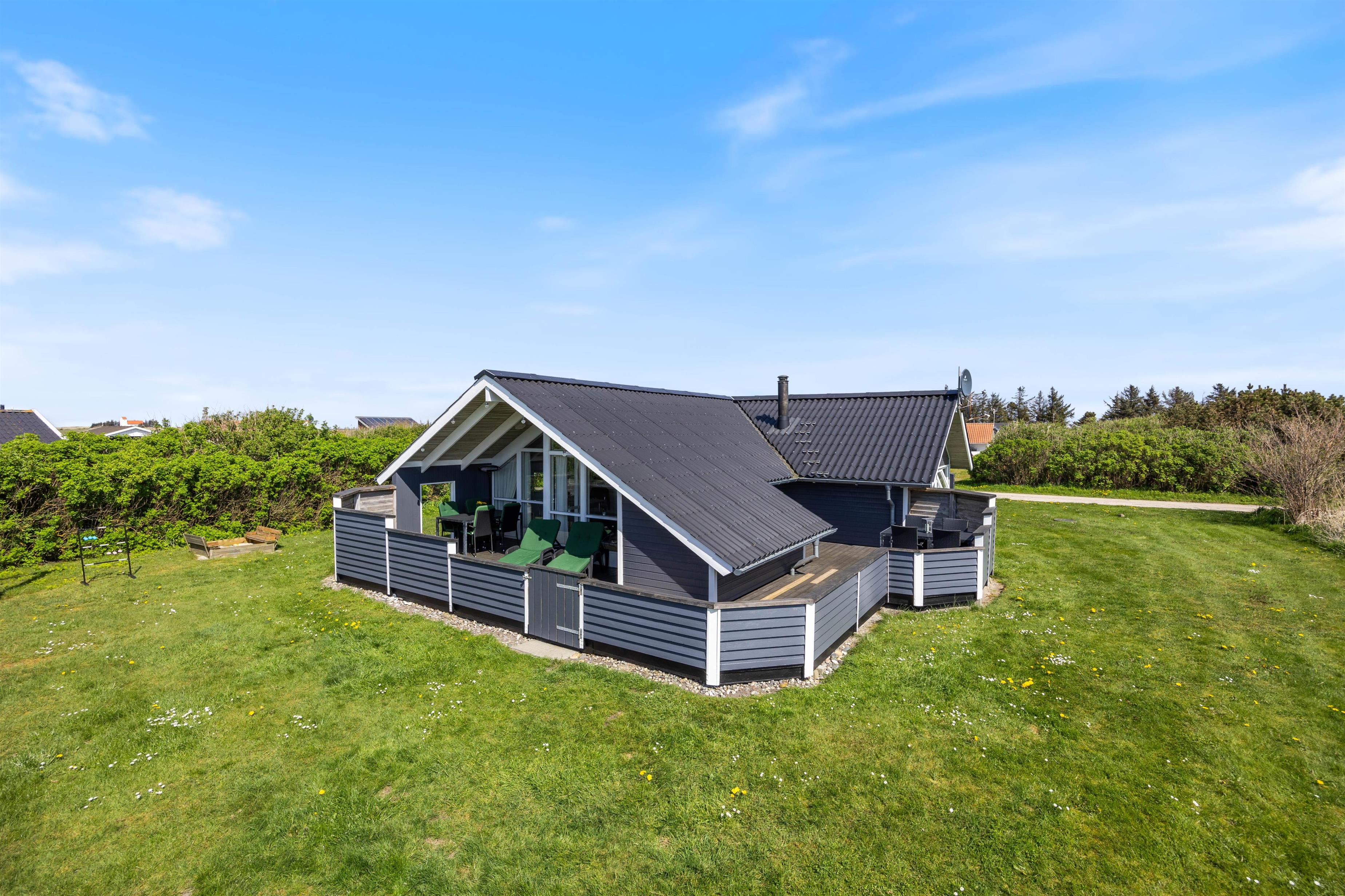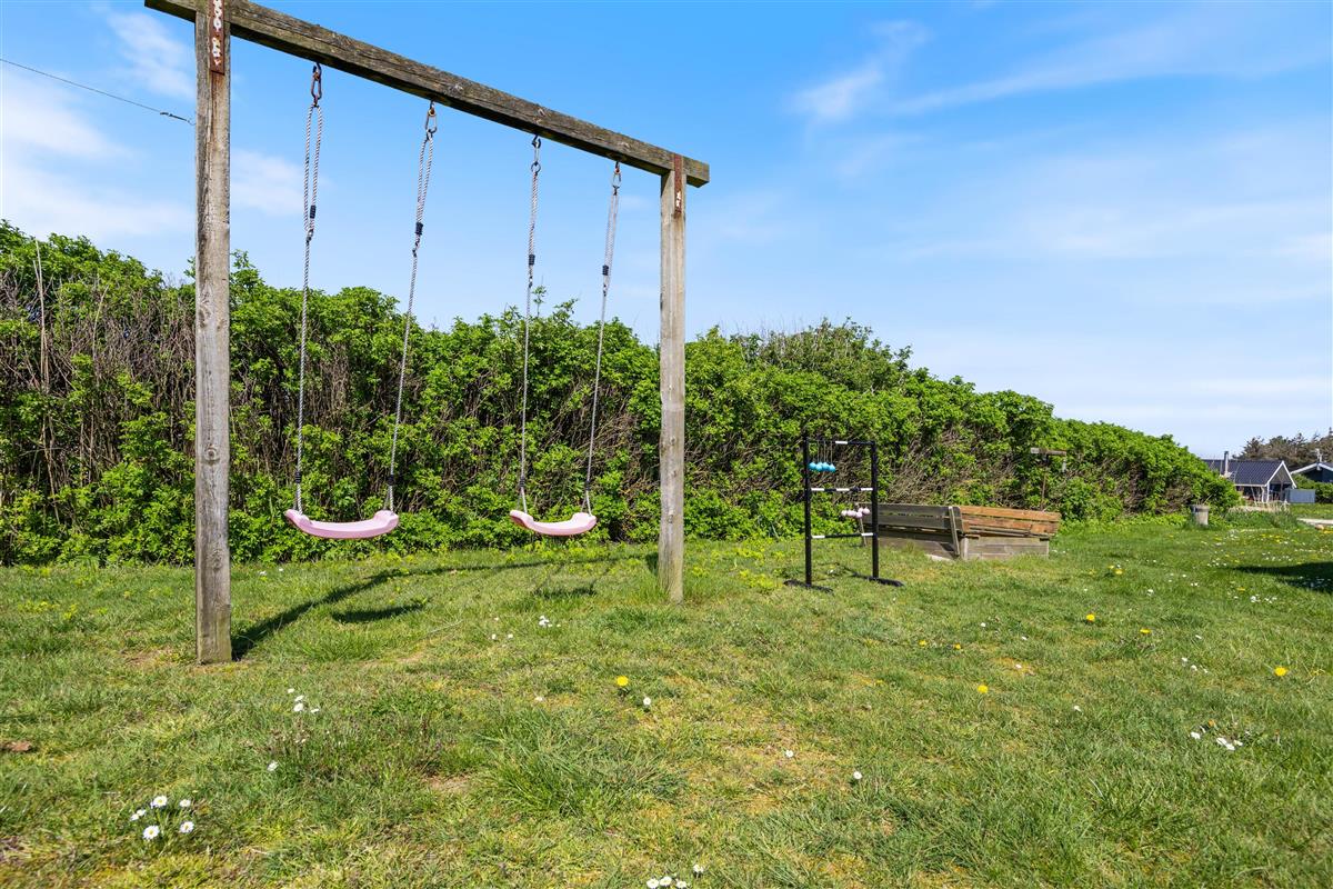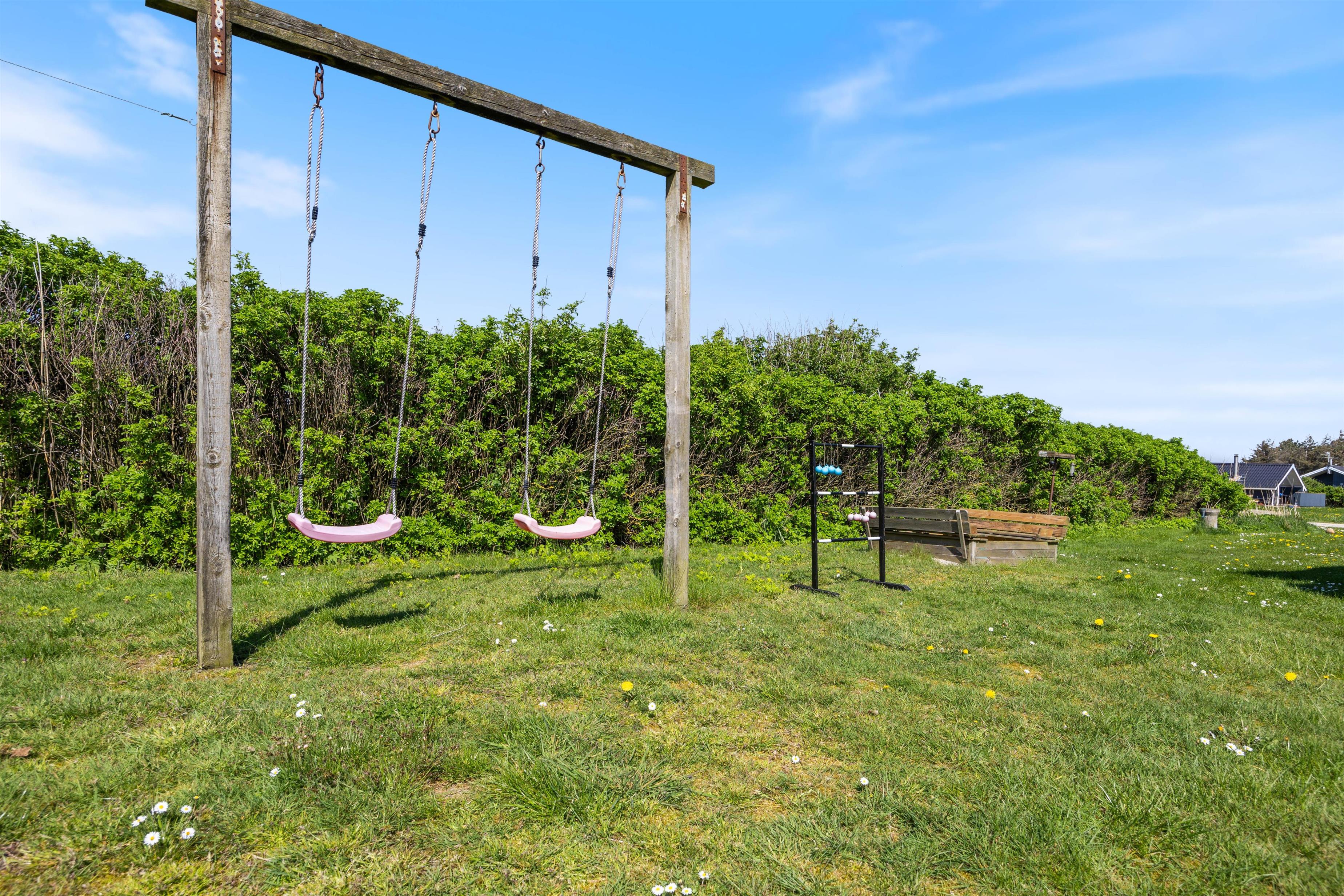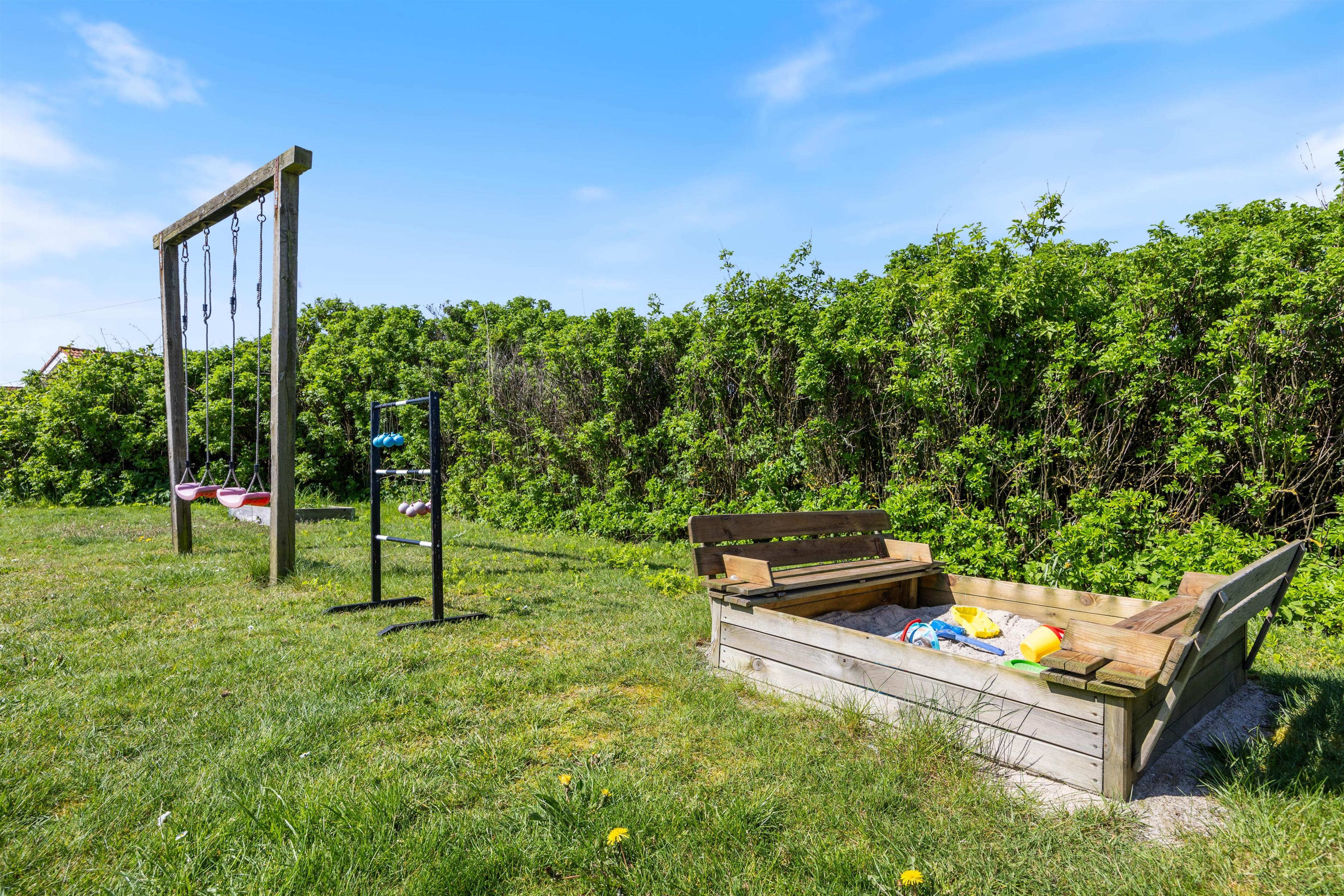 This holiday home features a lovely enclosed terrace. The western section is partially covered, while the northern section is partially screened. The southern area offers a sheltered seating space. The lawn extends to 1,204 square metres and, to the delight of younger guests, includes a swing and sandbox.