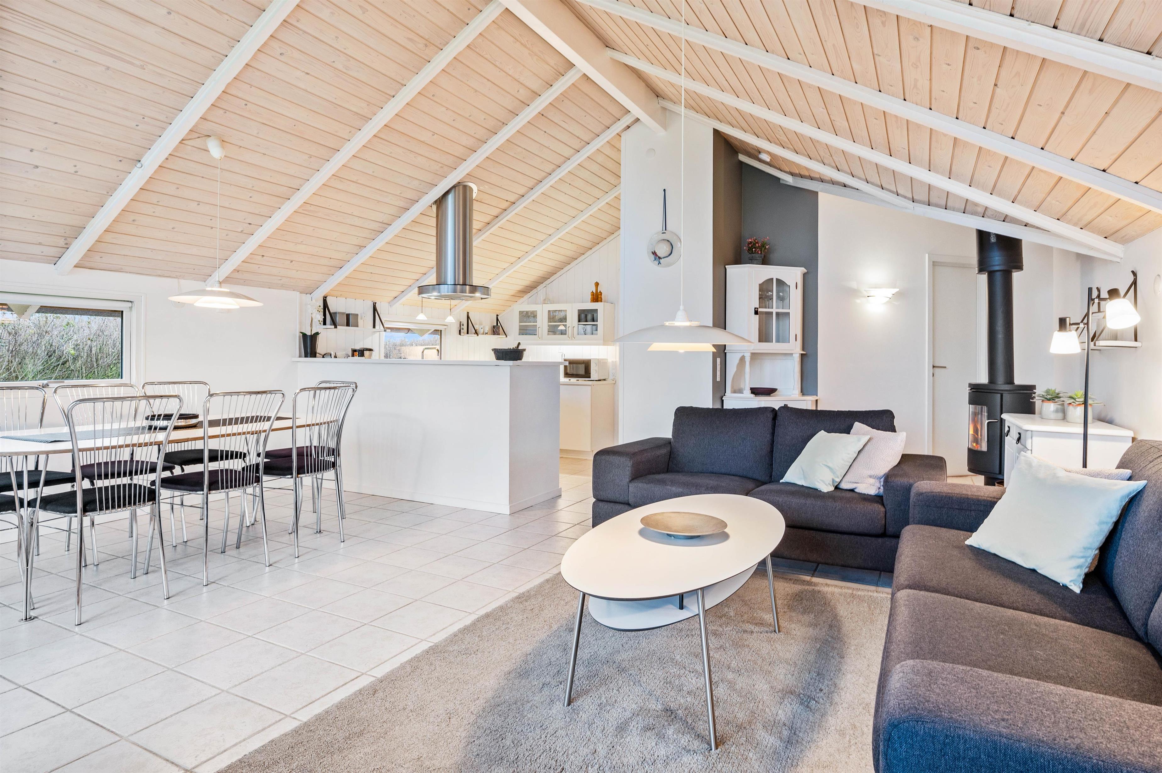 The living room boasts high ceilings and offers a wood-burning stove and flatscreen TV. German channels are received via satellite, with Danish channels through VIA Sat. From the living room, you can access the west-facing terrace. The holiday home also includes a washing machine and tumble dryer.