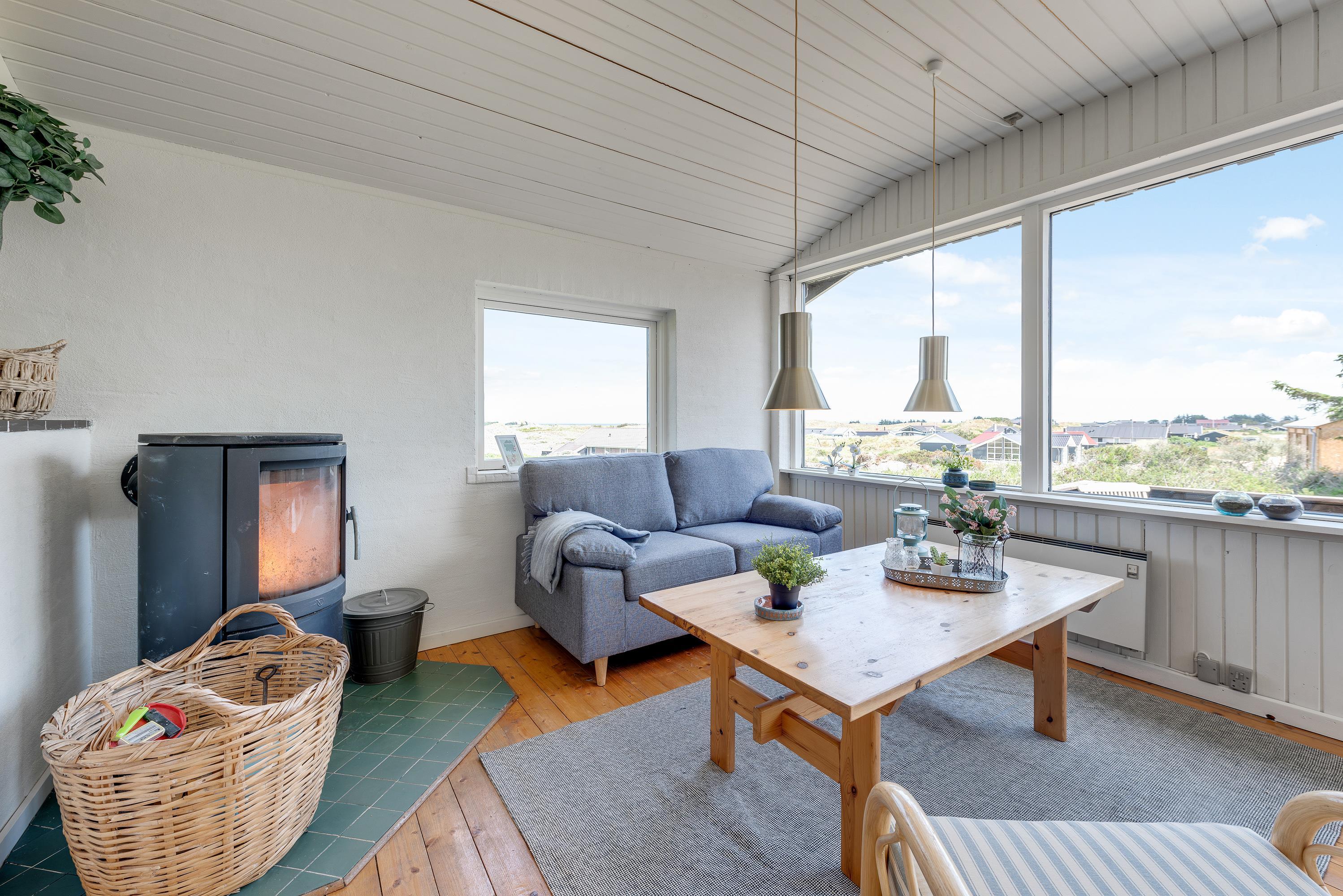 Beautiful interior with large windows and wood-burning stove