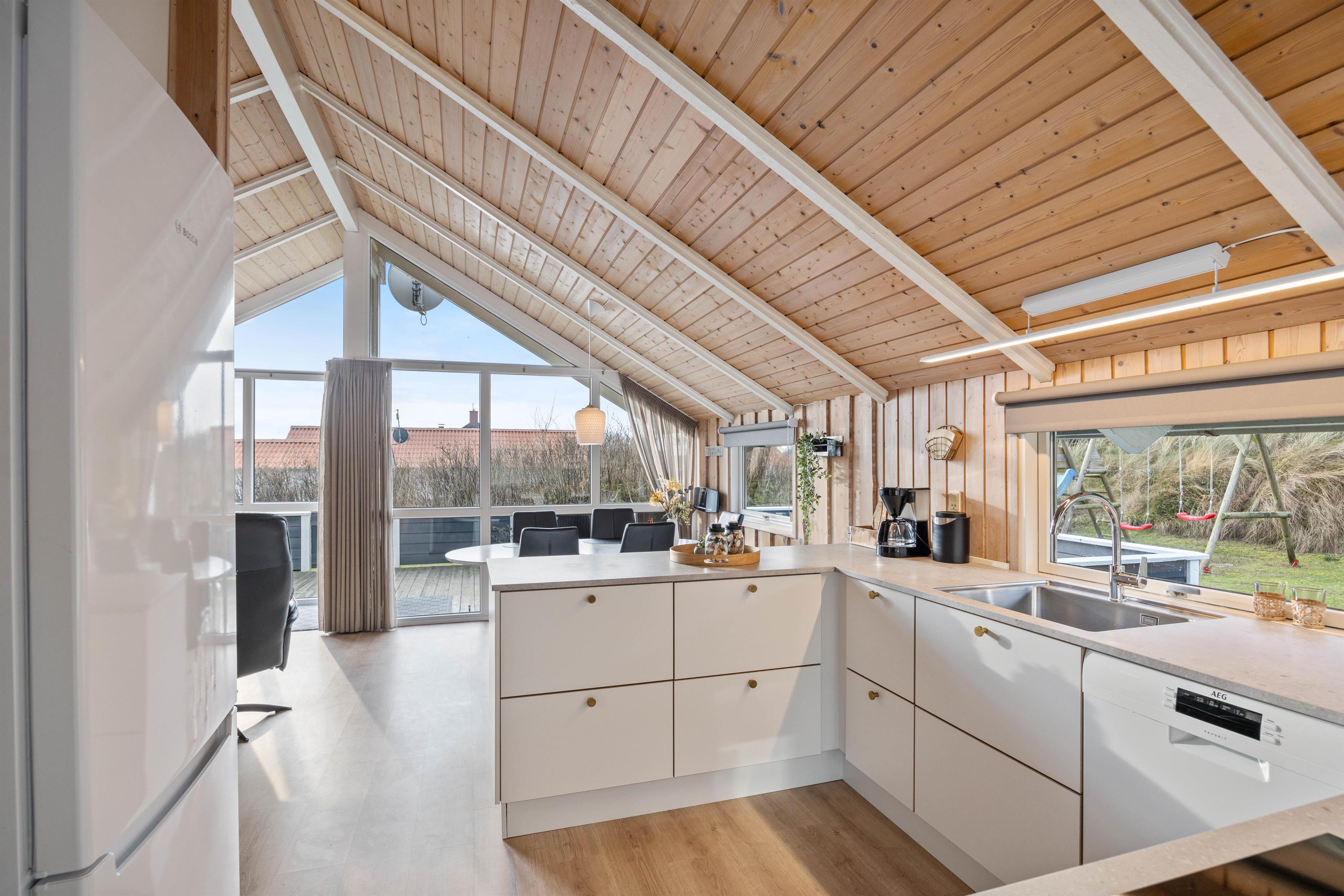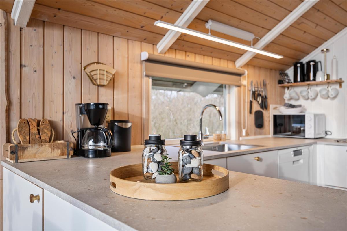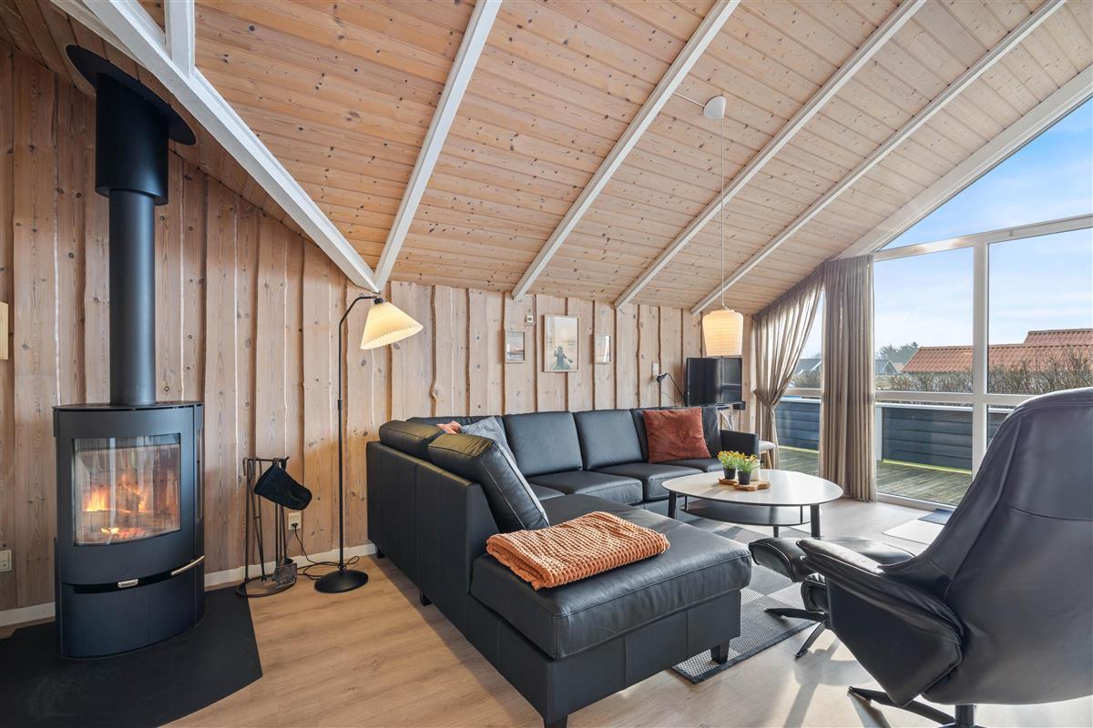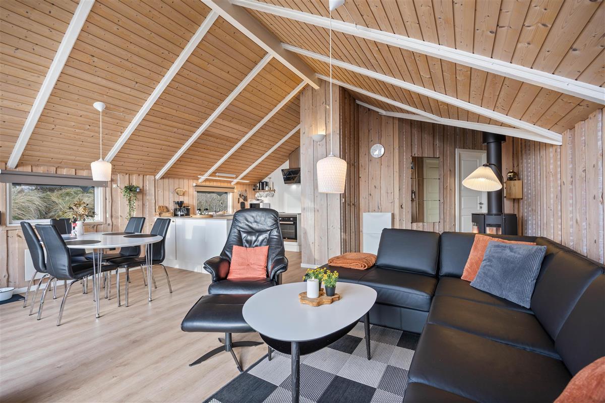 This holiday home, featuring wooden flooring throughout, immediately feels welcoming. The living room's large windows flood the space with natural light, offering beautiful views of the surrounding nature from the comfortable sofa. In the evenings, gather here for a cosy film night. The wood-burning stove adds extra hygge (Danish cosiness), while the energy-efficient heat pump provides additional heating.