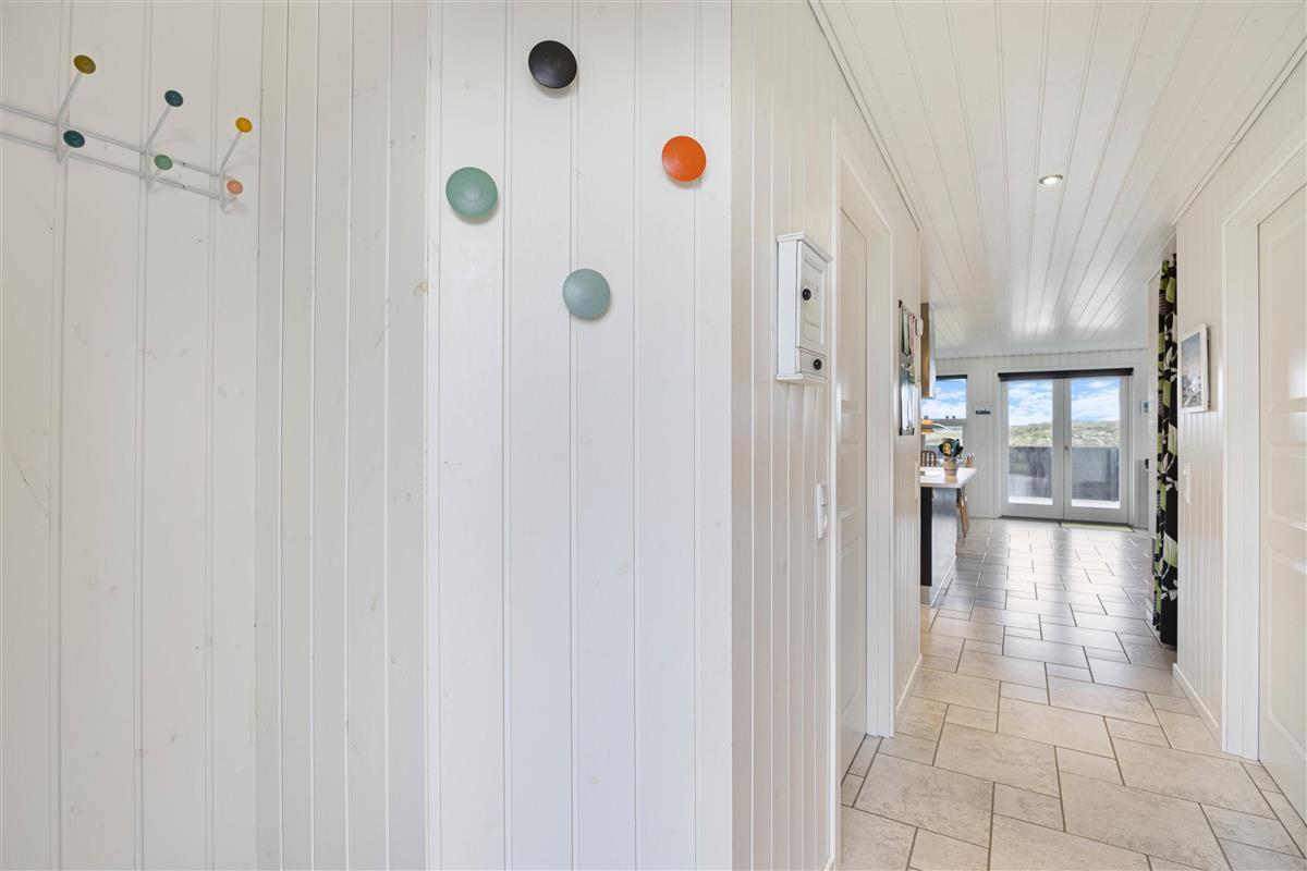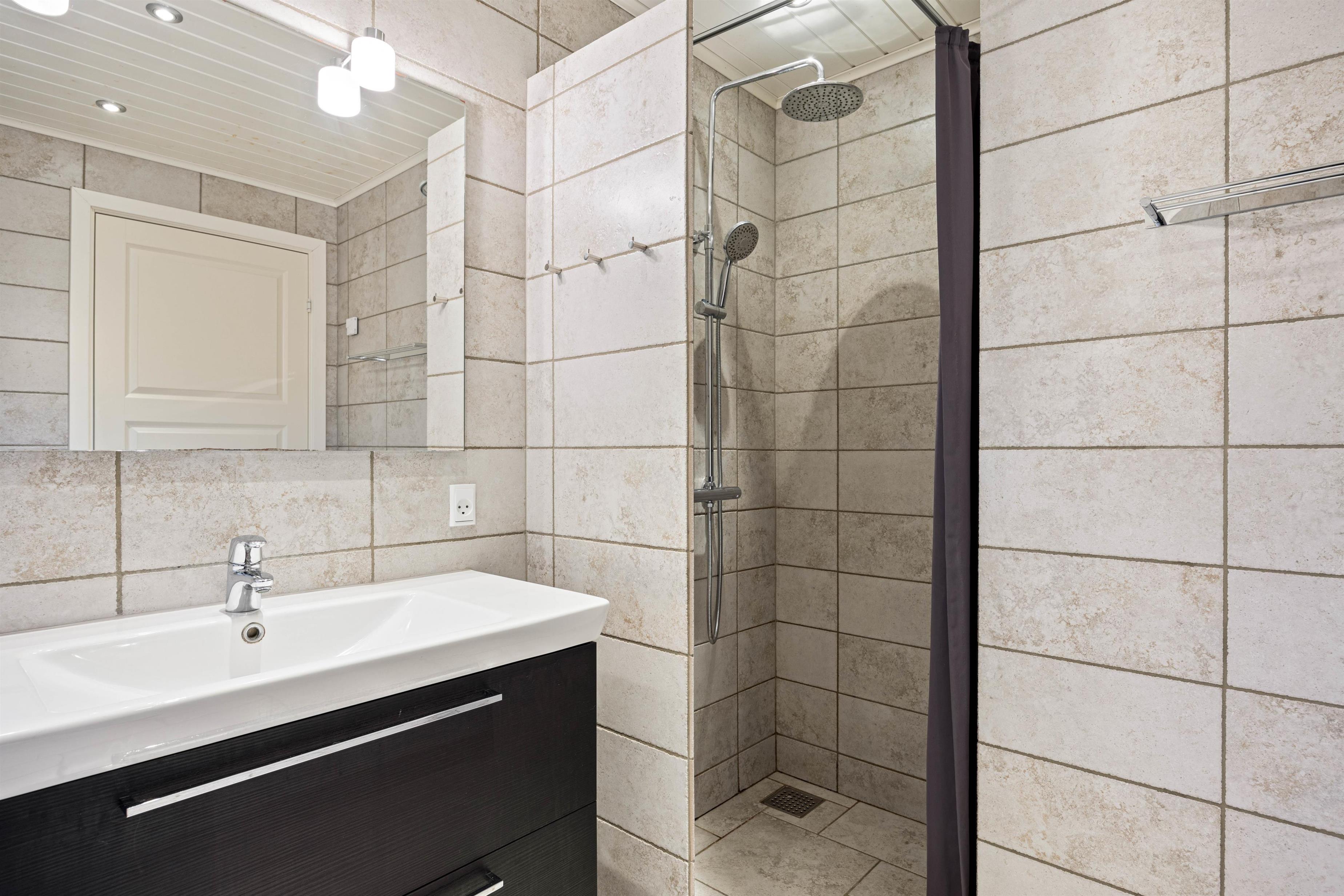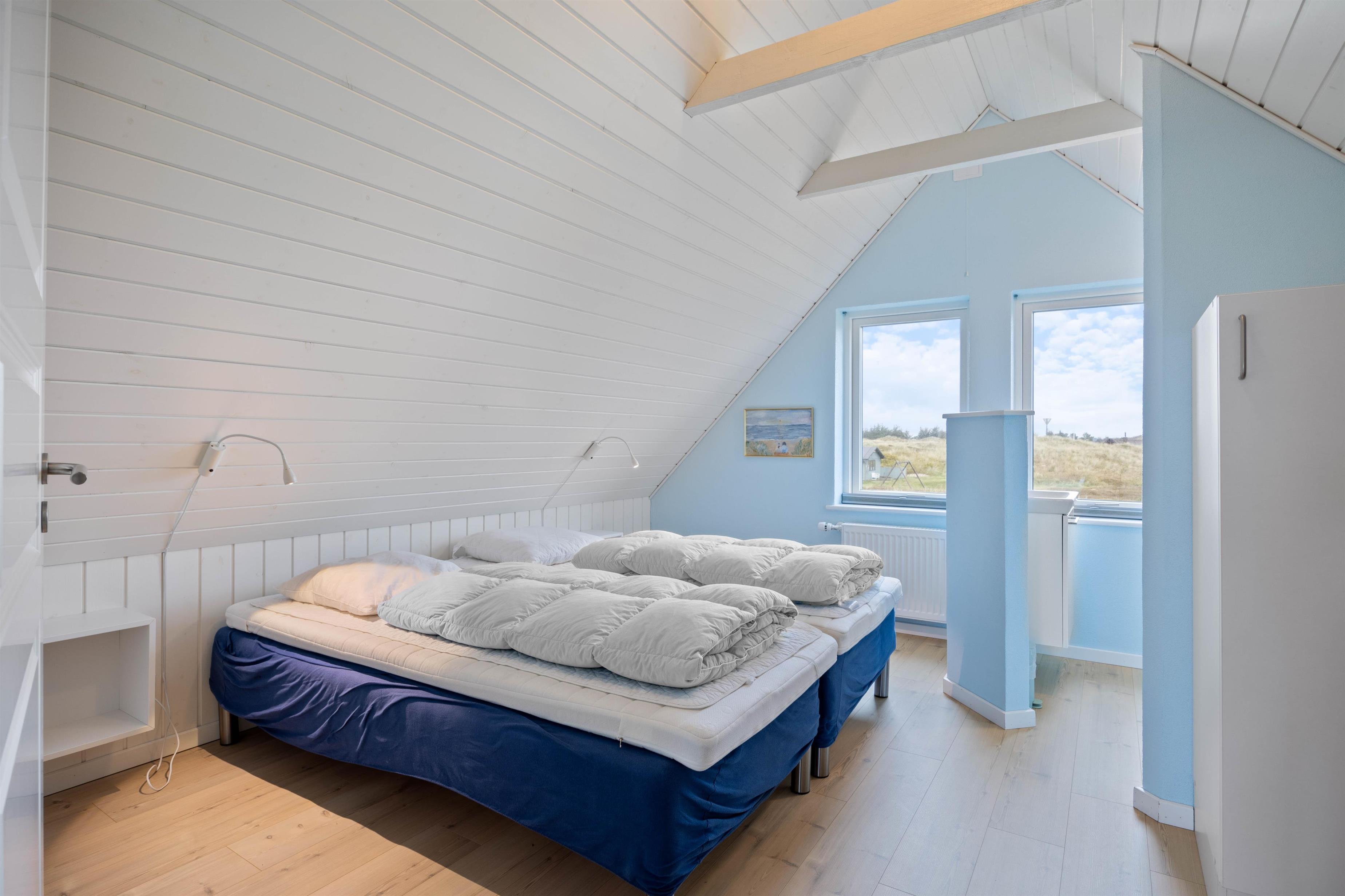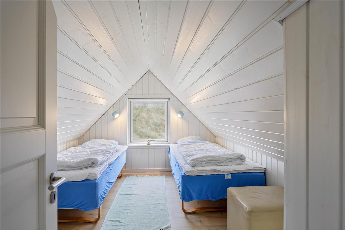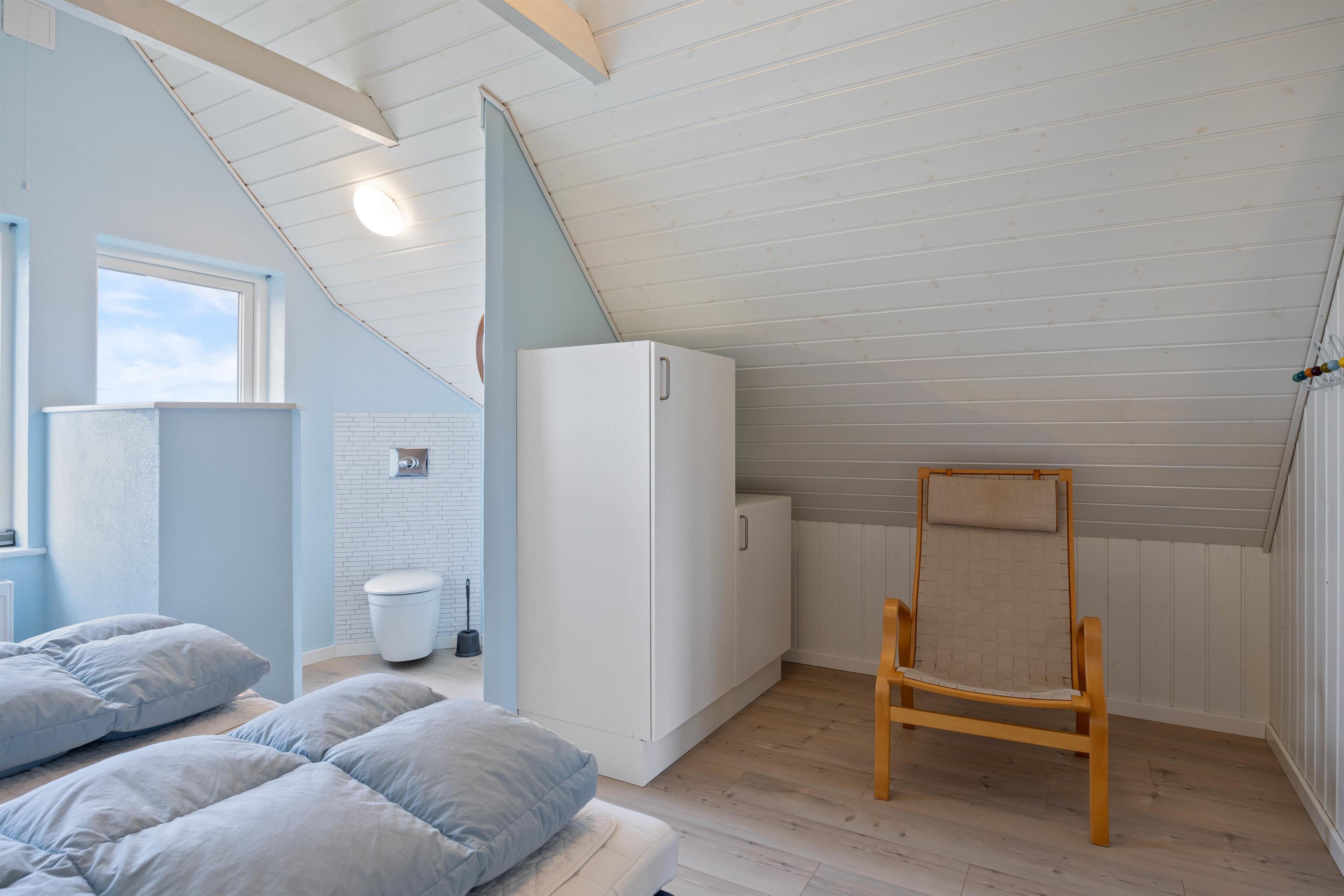 Following the stairs to the upper floor, you'll discover a second cosy living room with access to a balcony offering spectacular panoramic views towards the fjord. There are also two additional bedrooms and a convenient guest WC. Please note that the guest WC is not separated from the bedroom by a door. The other bedroom has twin beds and very low, sloping ceilings - perfect for younger children to sleep comfortably.