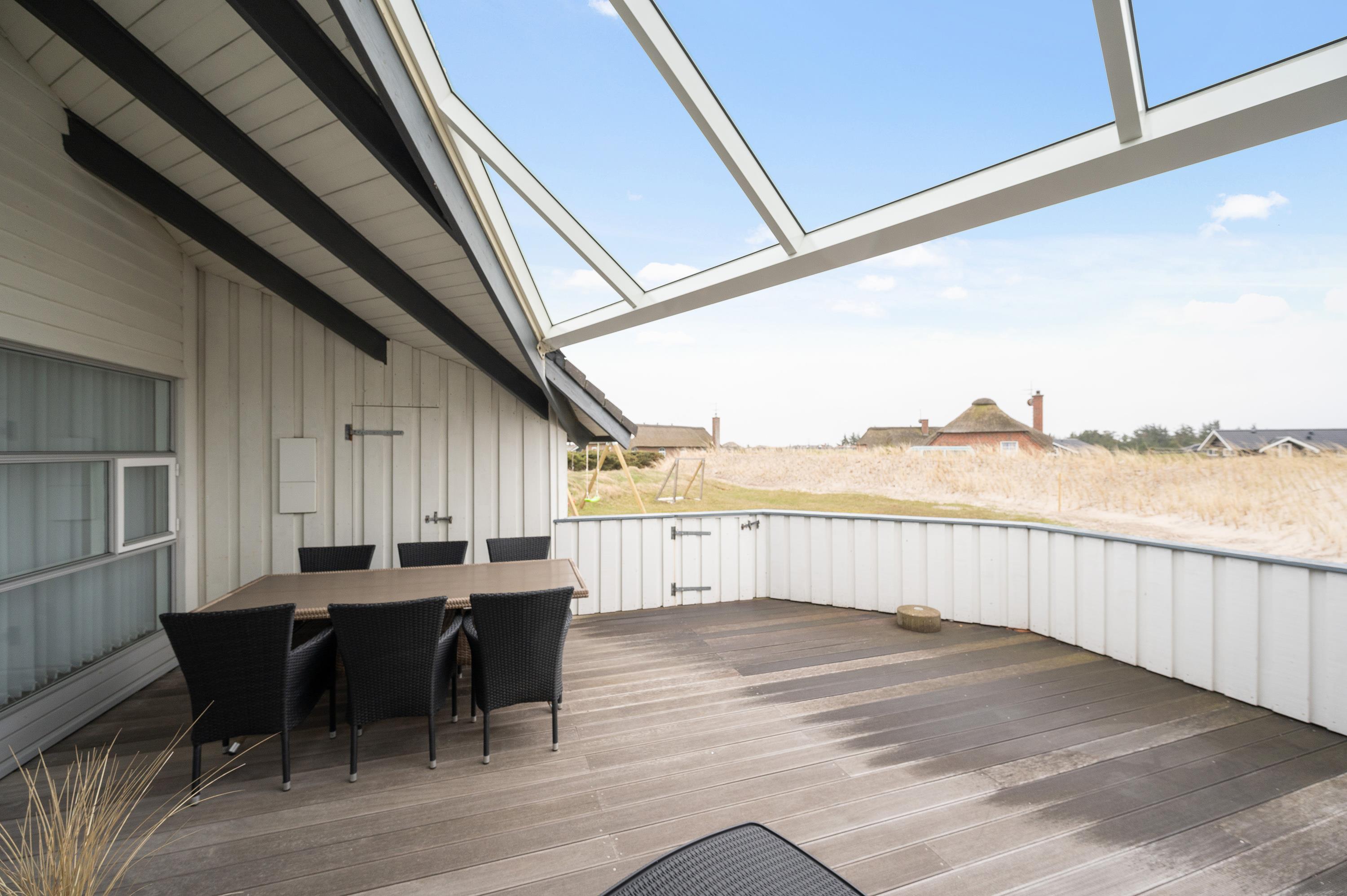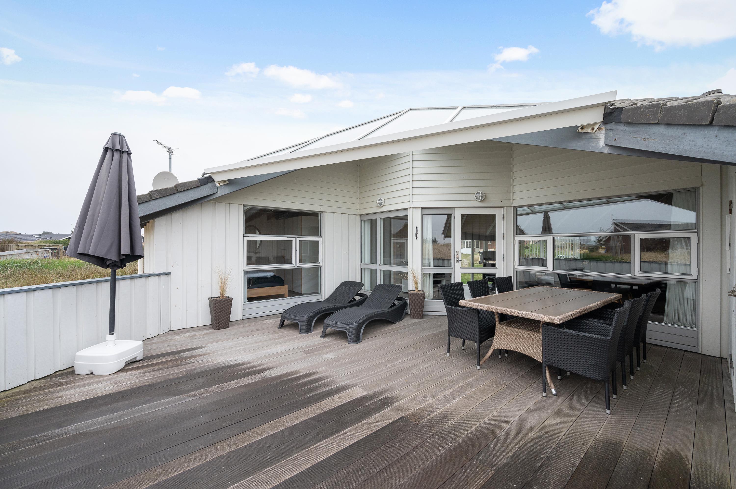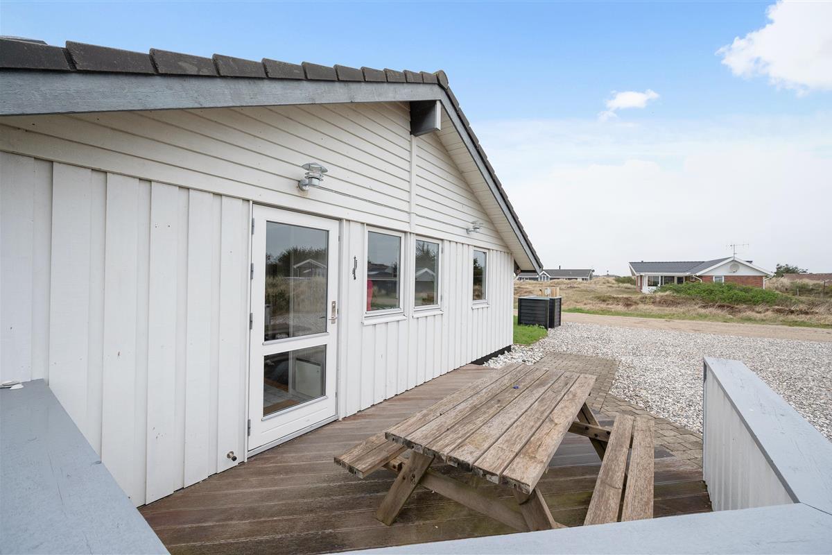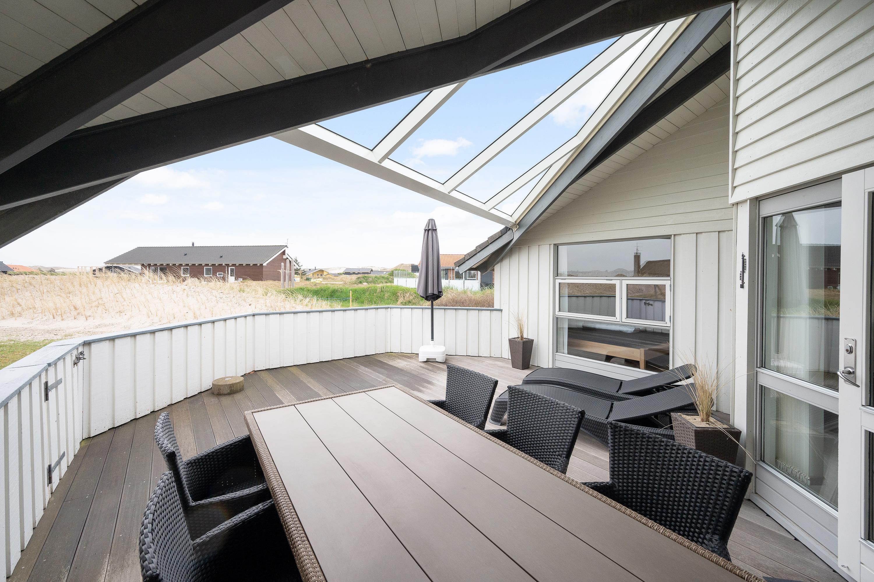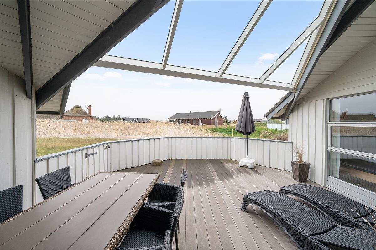 The enclosed and partially covered terrace is directly accessible from the comfortable living area. Here, comfortable garden furniture and sun loungers invite you to enjoy barbecue evenings and relax in the sunshine. Savour a cool glass of wine and unwind as the sun sets over the Haurvig dunes.