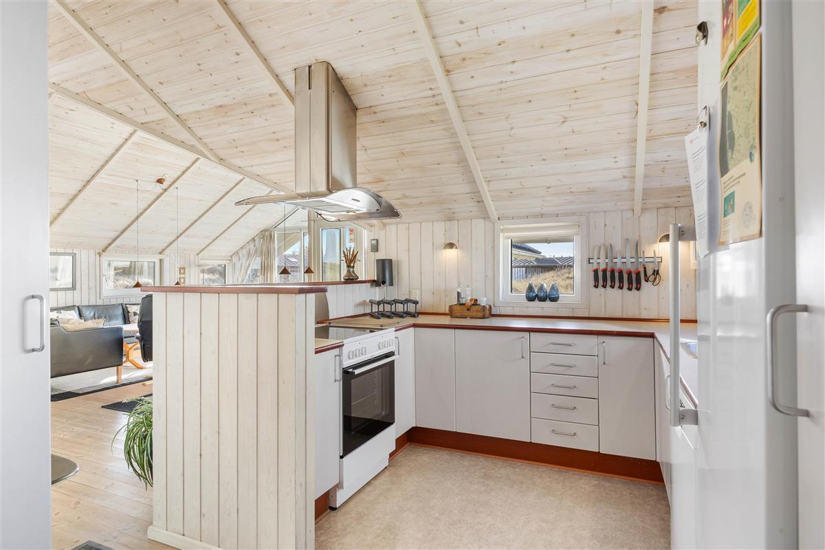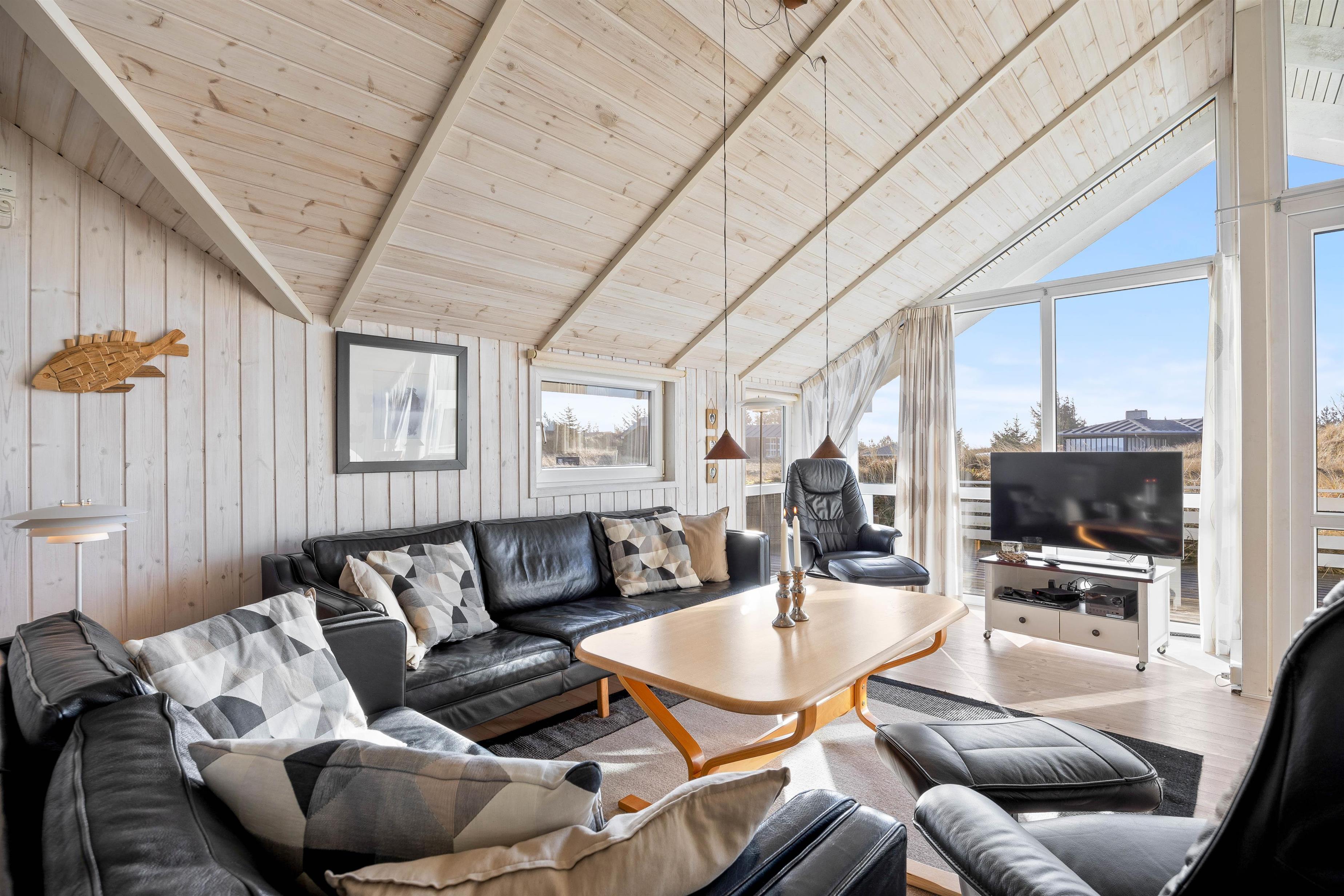 You'll feel welcome from the moment you step inside. The holiday home radiates classic Danish holiday atmosphere with light wooden floors and walls, abundant natural light, and typical Scandinavian furnishings. The wood-burning stove creates an especially cosy ambiance, though you can also use the energy-efficient heat pump for heating.