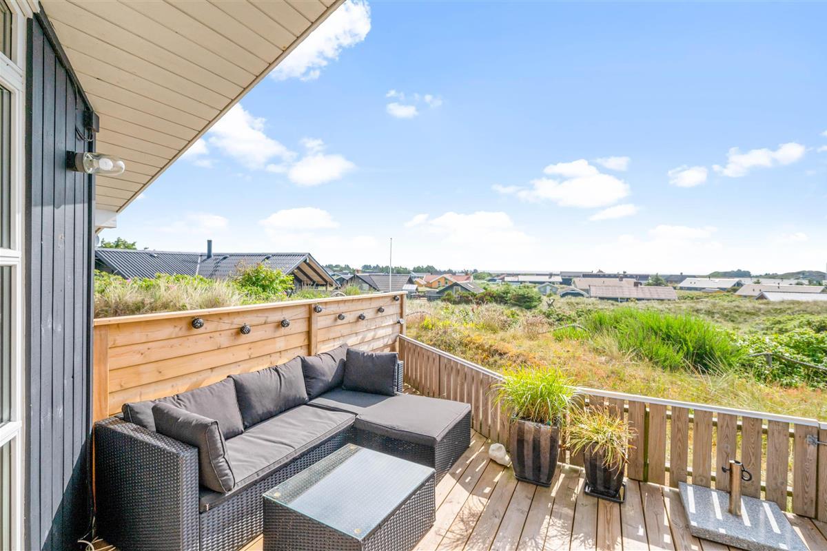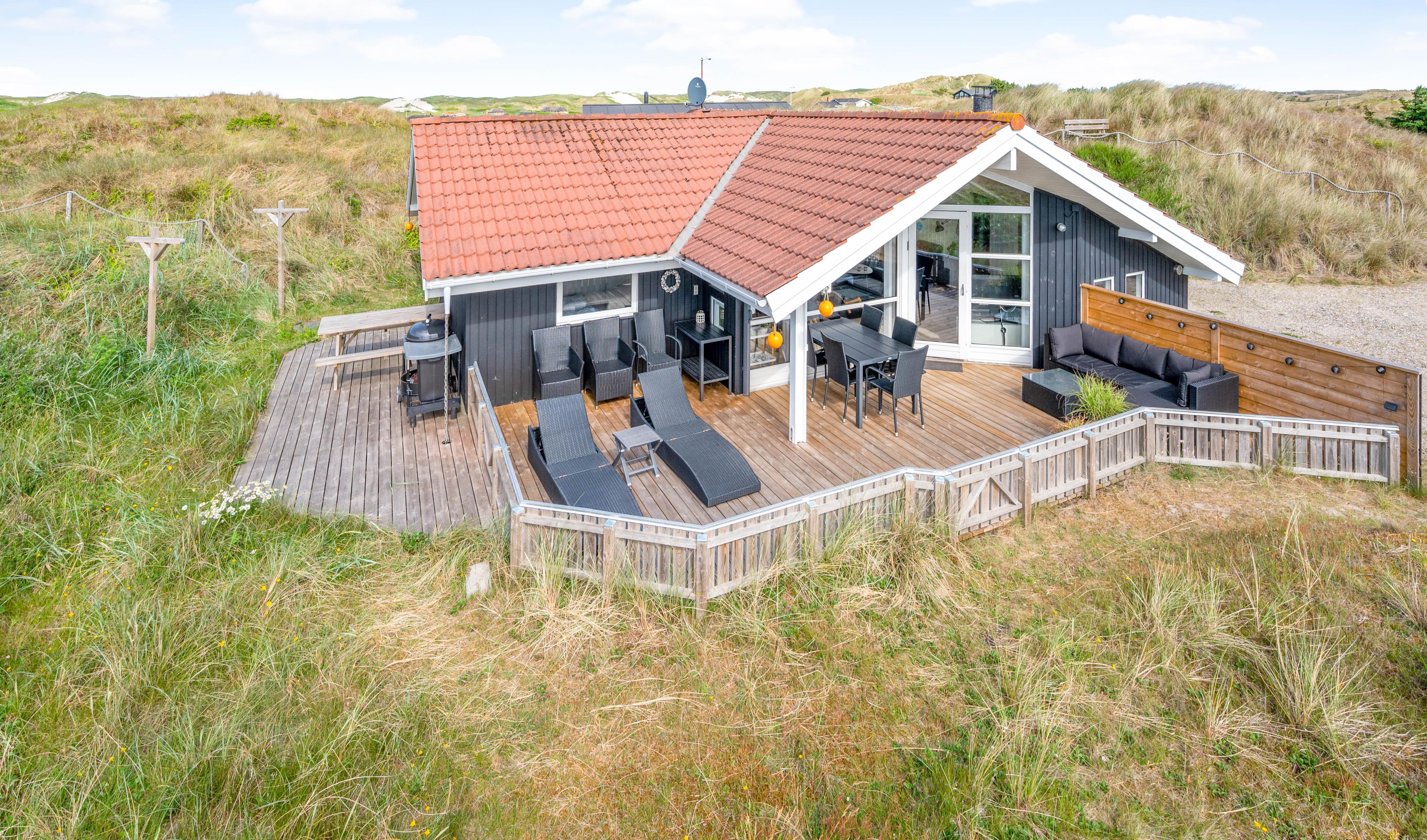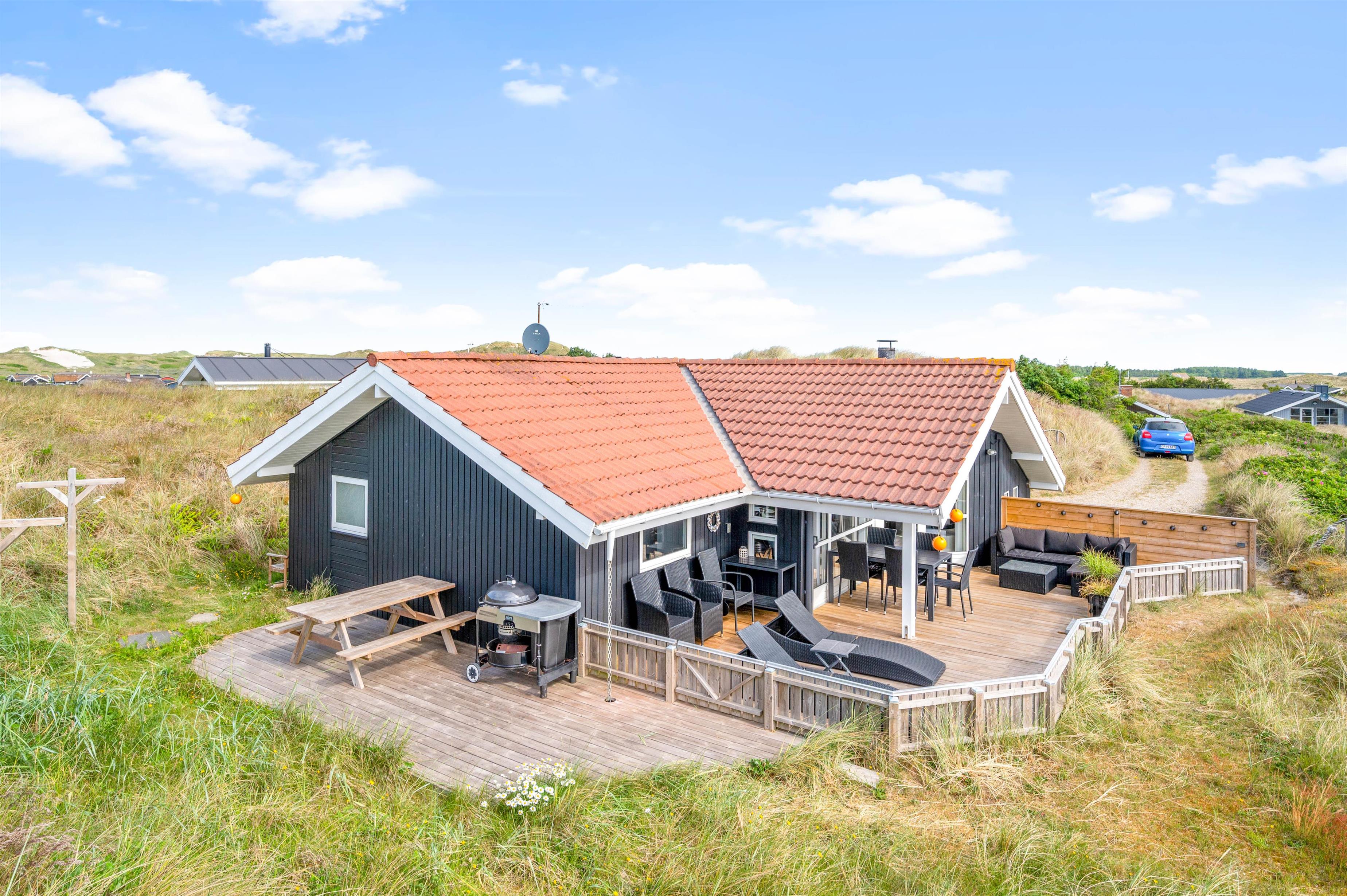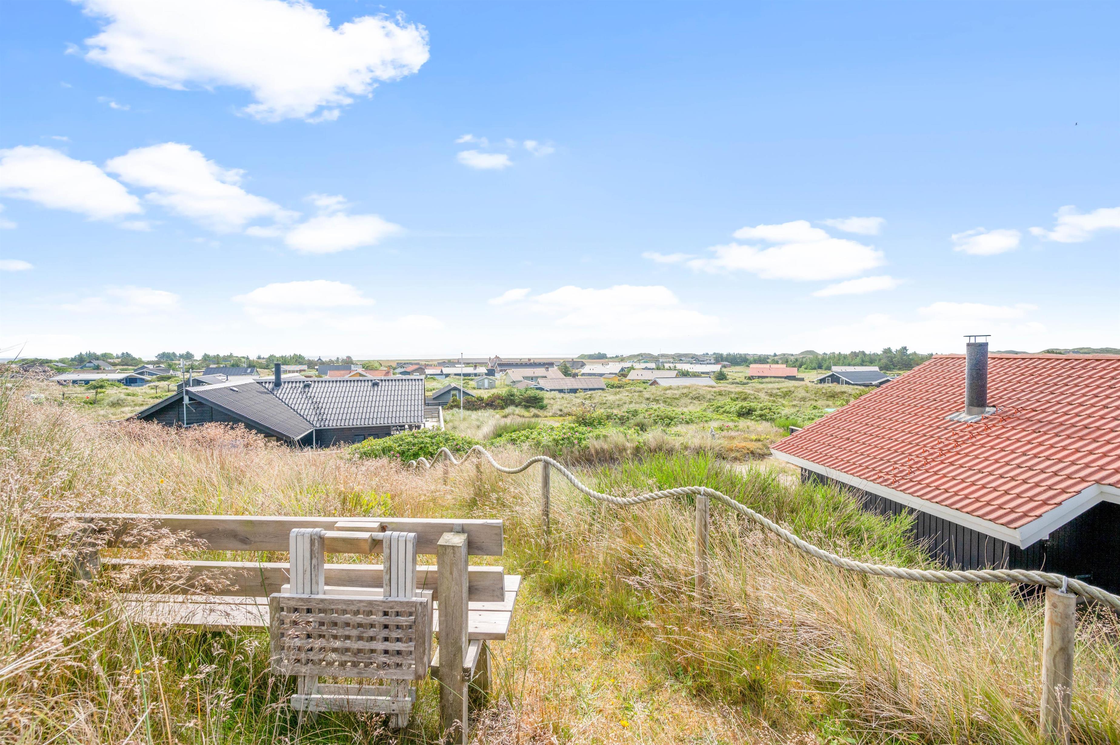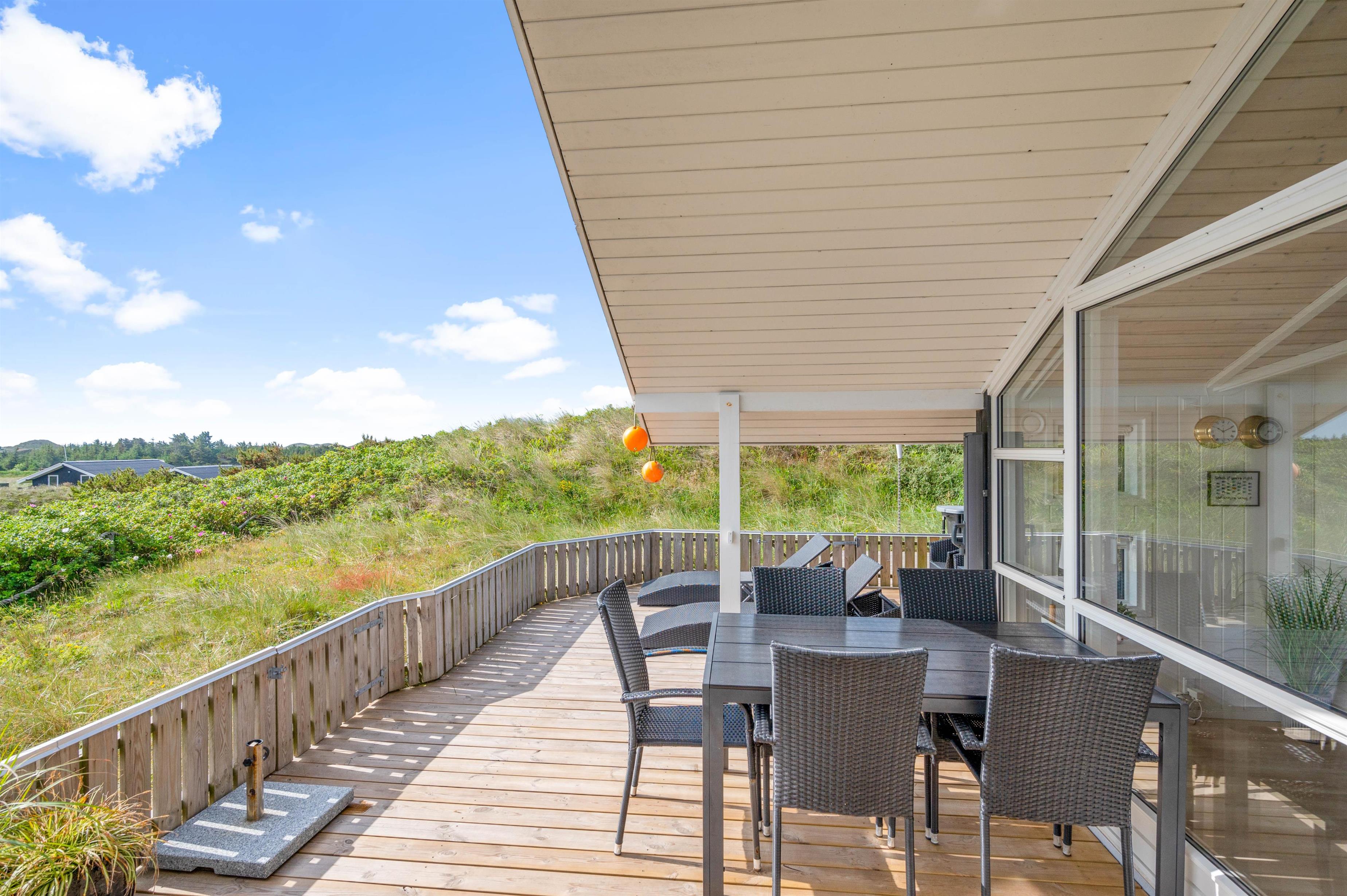 This holiday home sits on a peaceful dune plot in Haurvig. Here you can relax on the terrace while enjoying the sunshine and fresh air. The terrace is enclosed and partially covered, making it perfect for long family barbecue evenings. Even in less favourable weather, you can sit outside and appreciate the views. On the small dune next to the house, there's a viewing bench offering beautiful vistas across Ringkøbing Fjord.