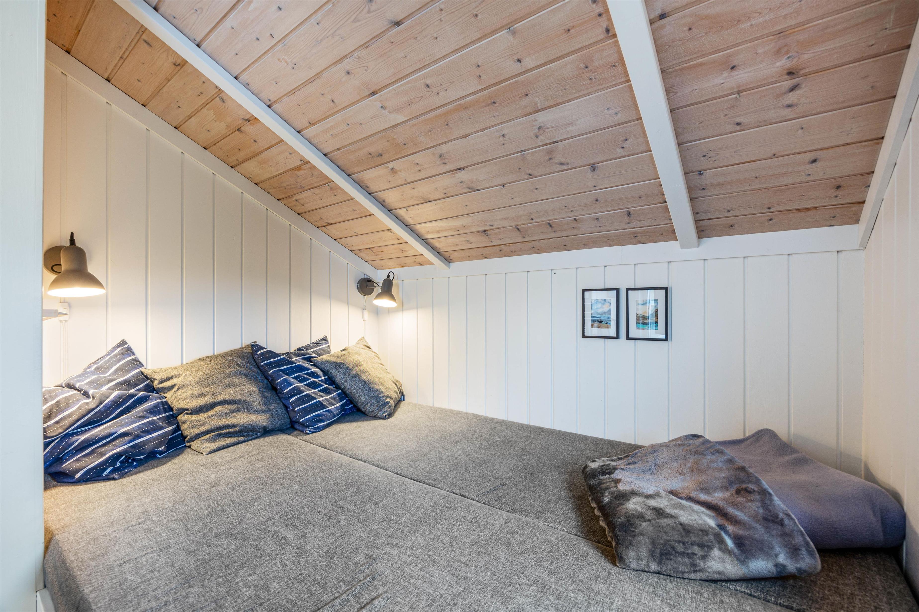 Alongside the wood-burning stove, there's a traditional sleeping nook that can be darkened with curtains. This nook is ideal for children to create their own 'den'.