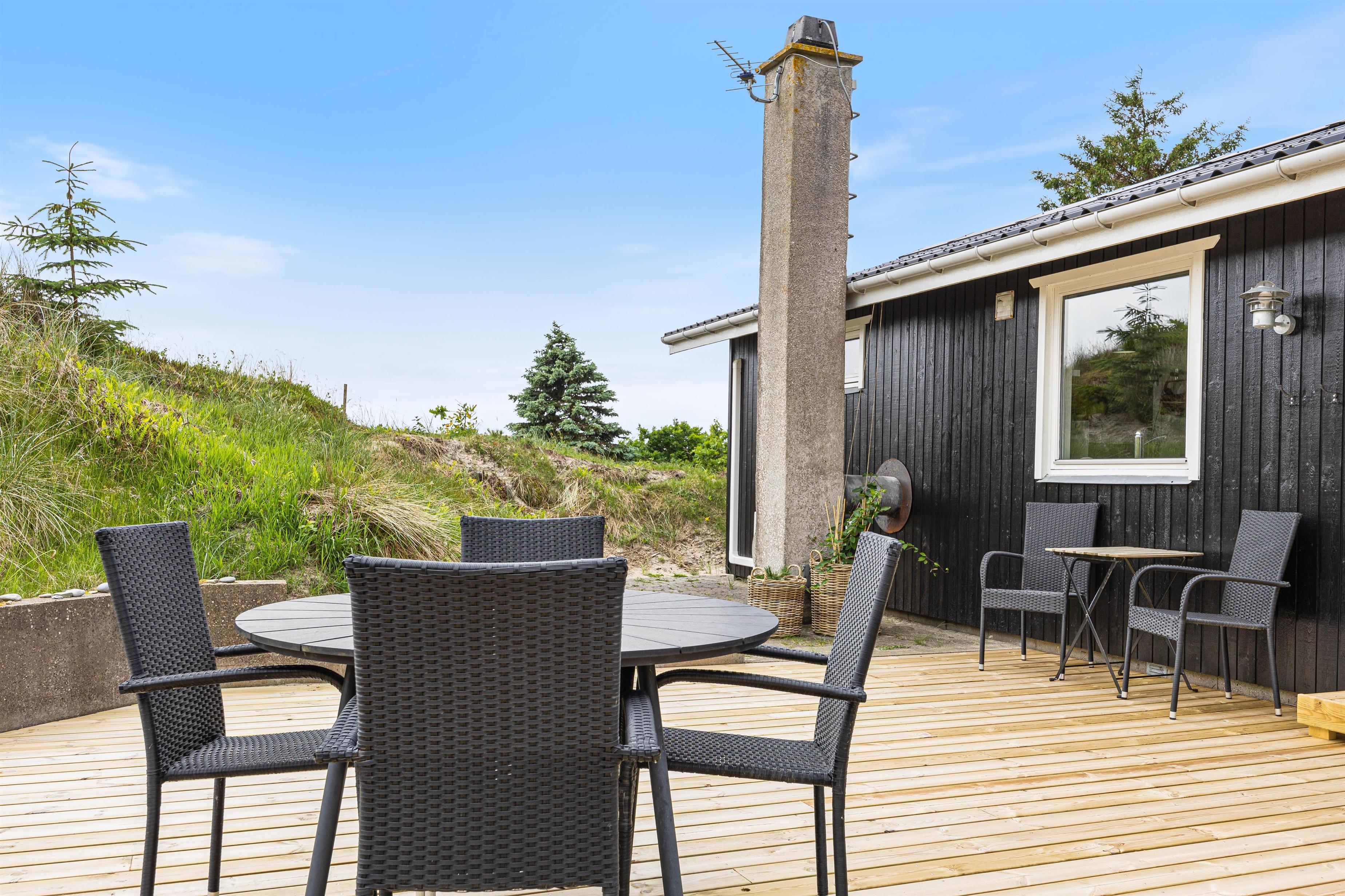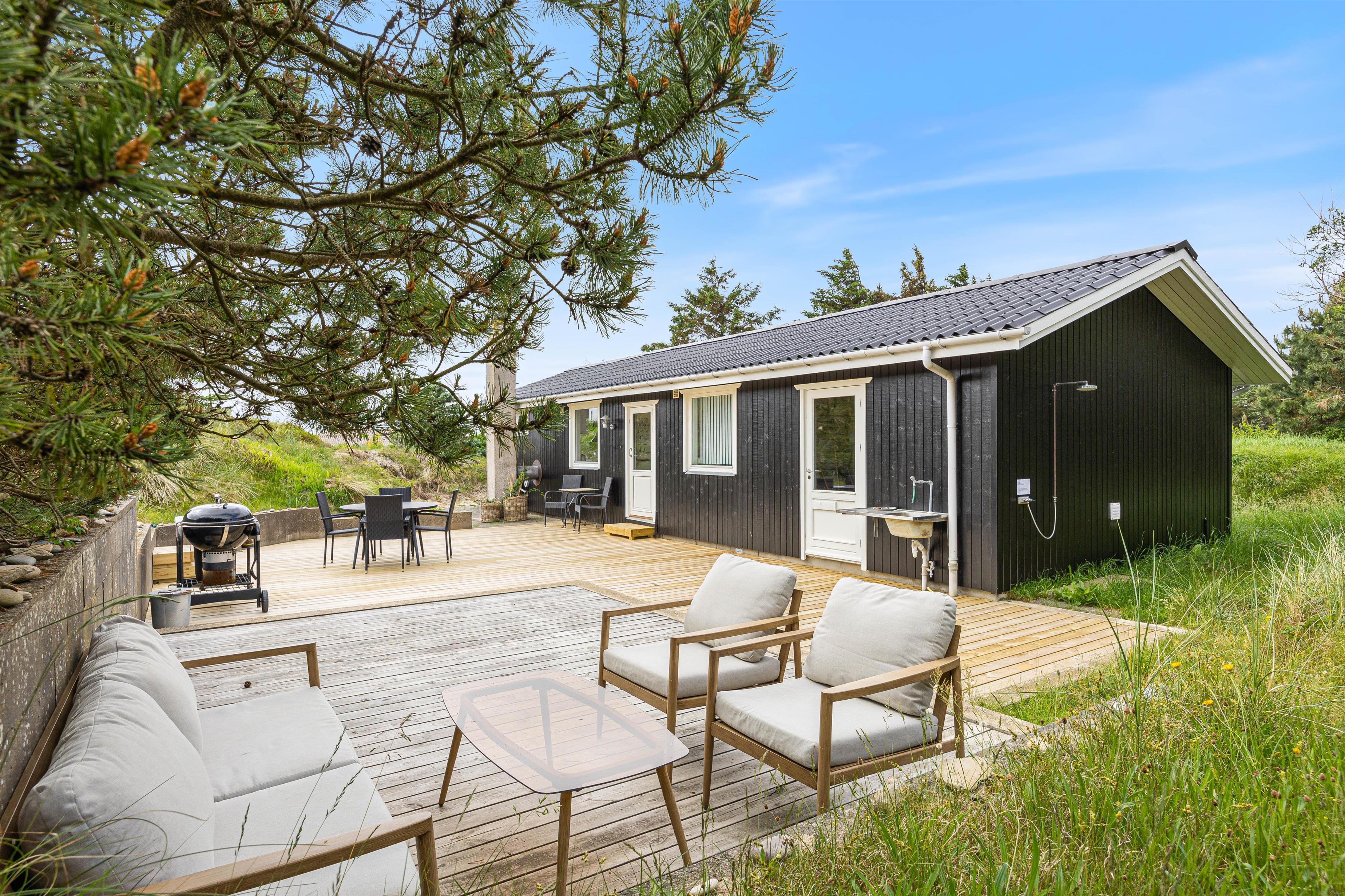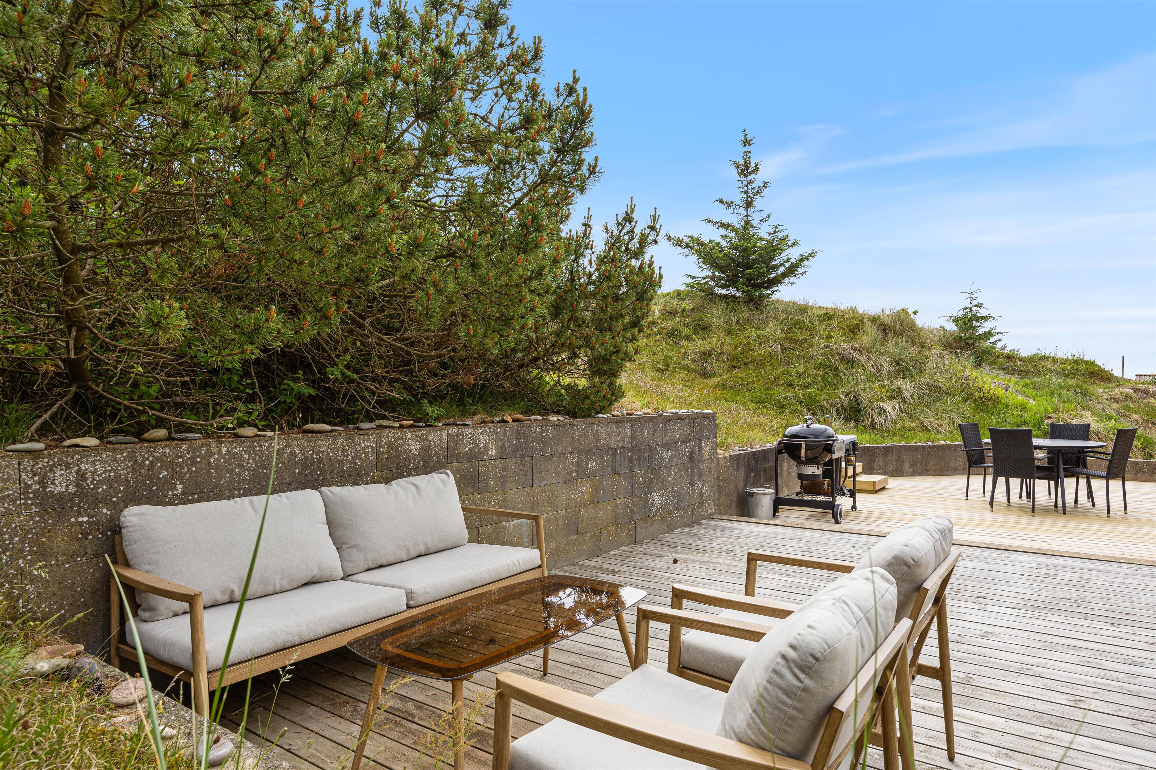 This charming holiday home is situated on an idyllic dune plot at Kr. Madsens Vej 73, surrounded by beautiful nature and heathland. The comfortable furnishings, delightful terraces and excellent location provide ideal conditions for an unforgettable holiday between fjord and sea.