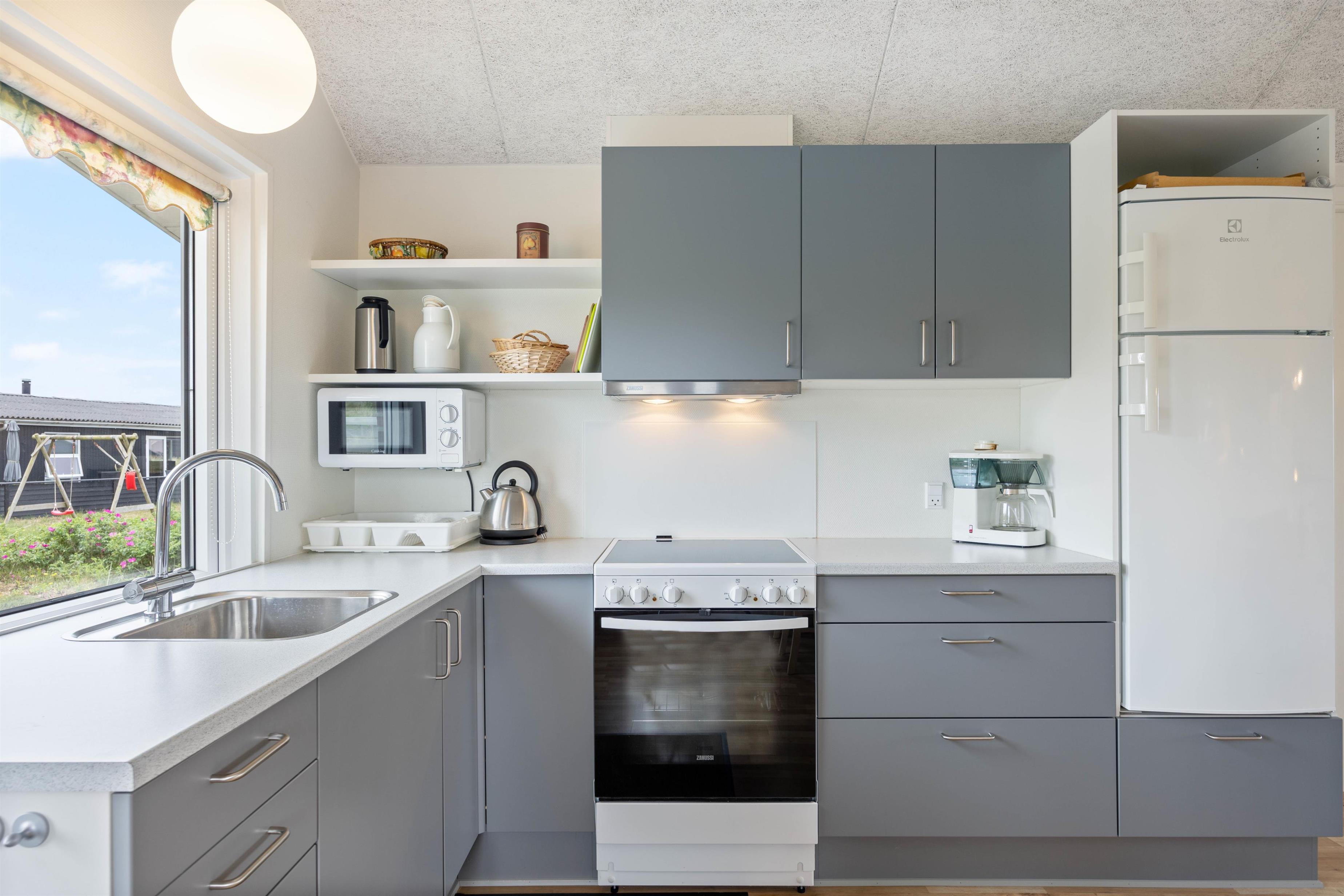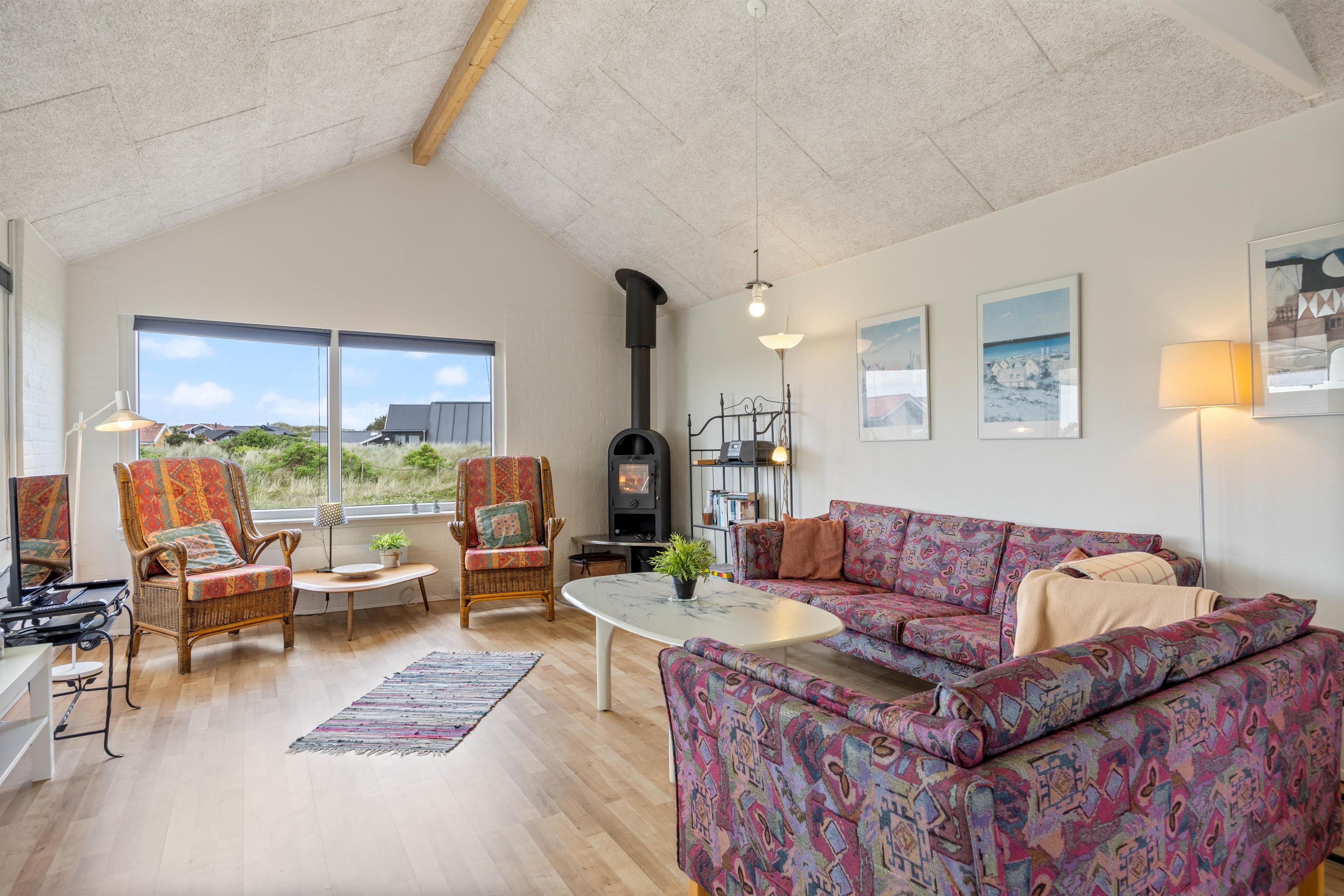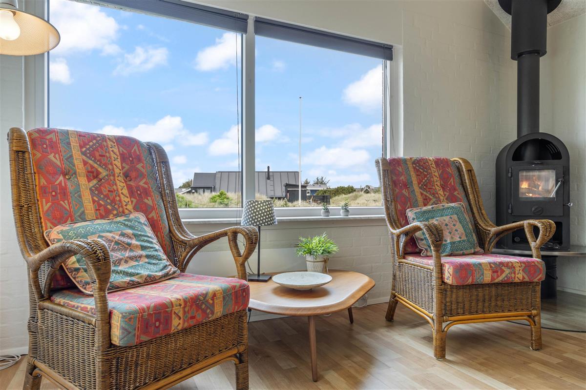 The holiday home is filled with natural light, thanks to large windows throughout the holiday home. The living area has been furnished with careful attention to detail. The beautiful wood-burning stove in the corner provides both wonderful holiday ambiance and warmth. Adjacent comfortable armchairs offer the perfect spot to settle down with a book.