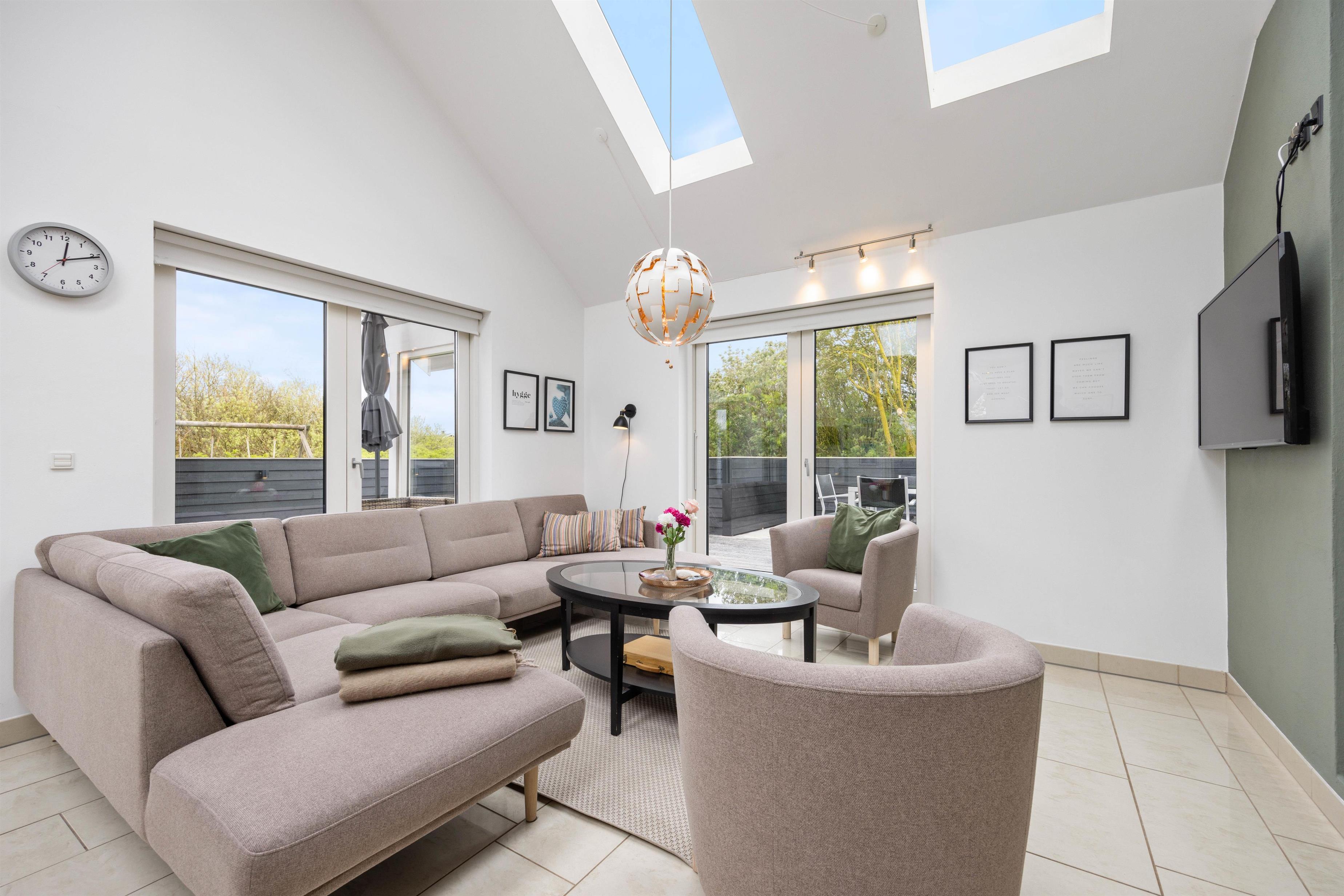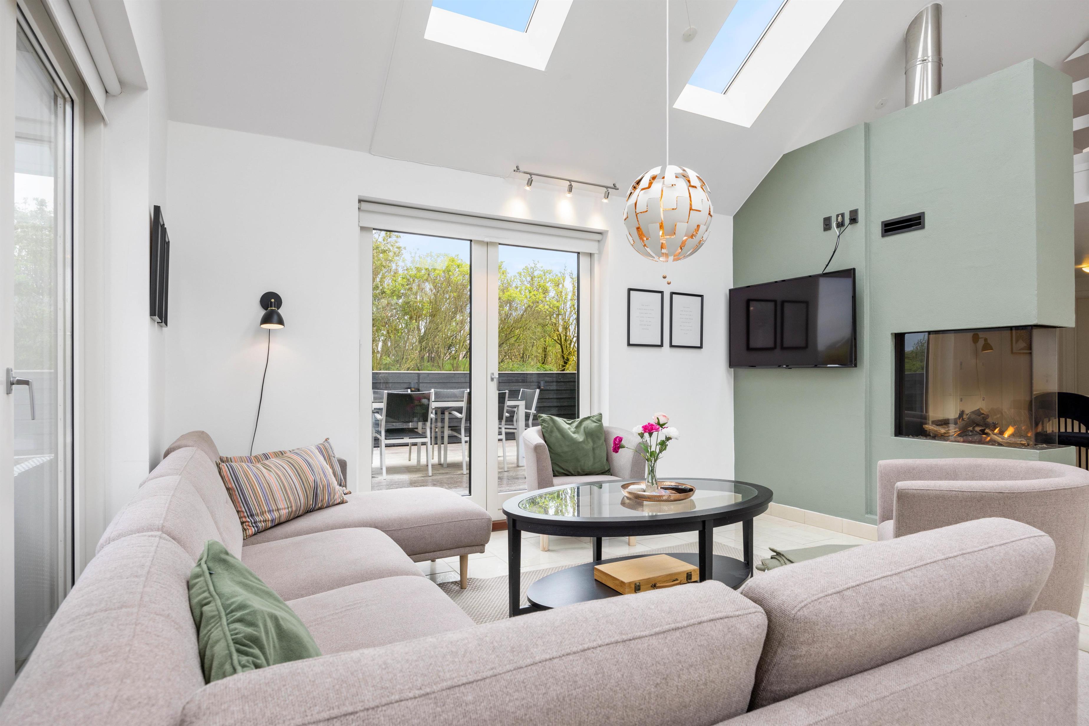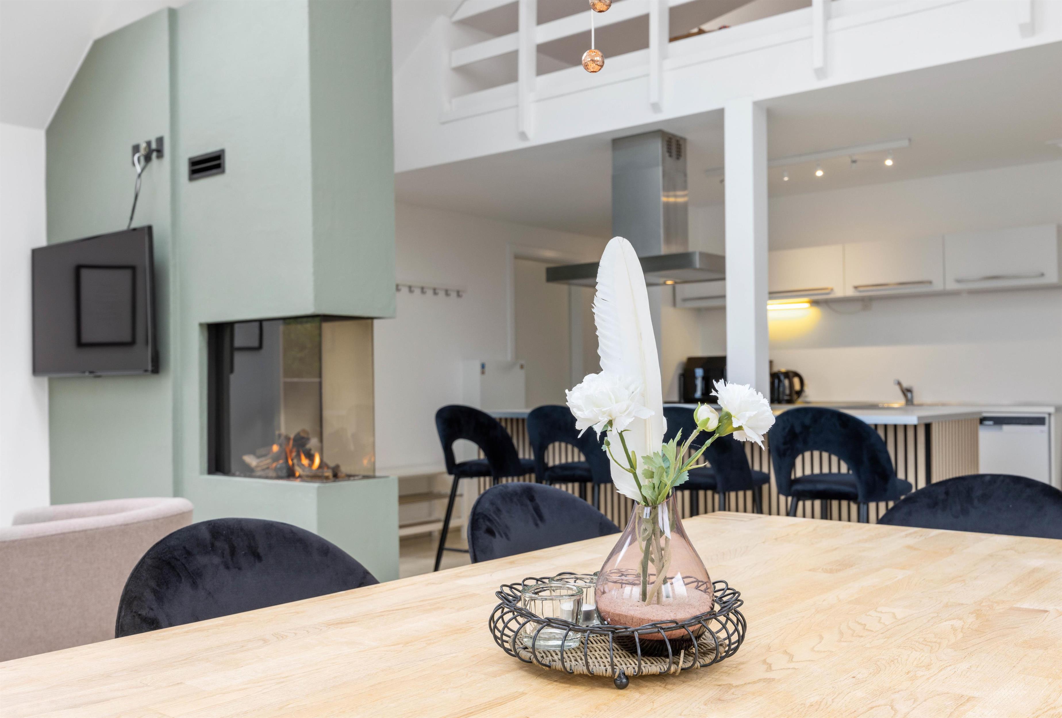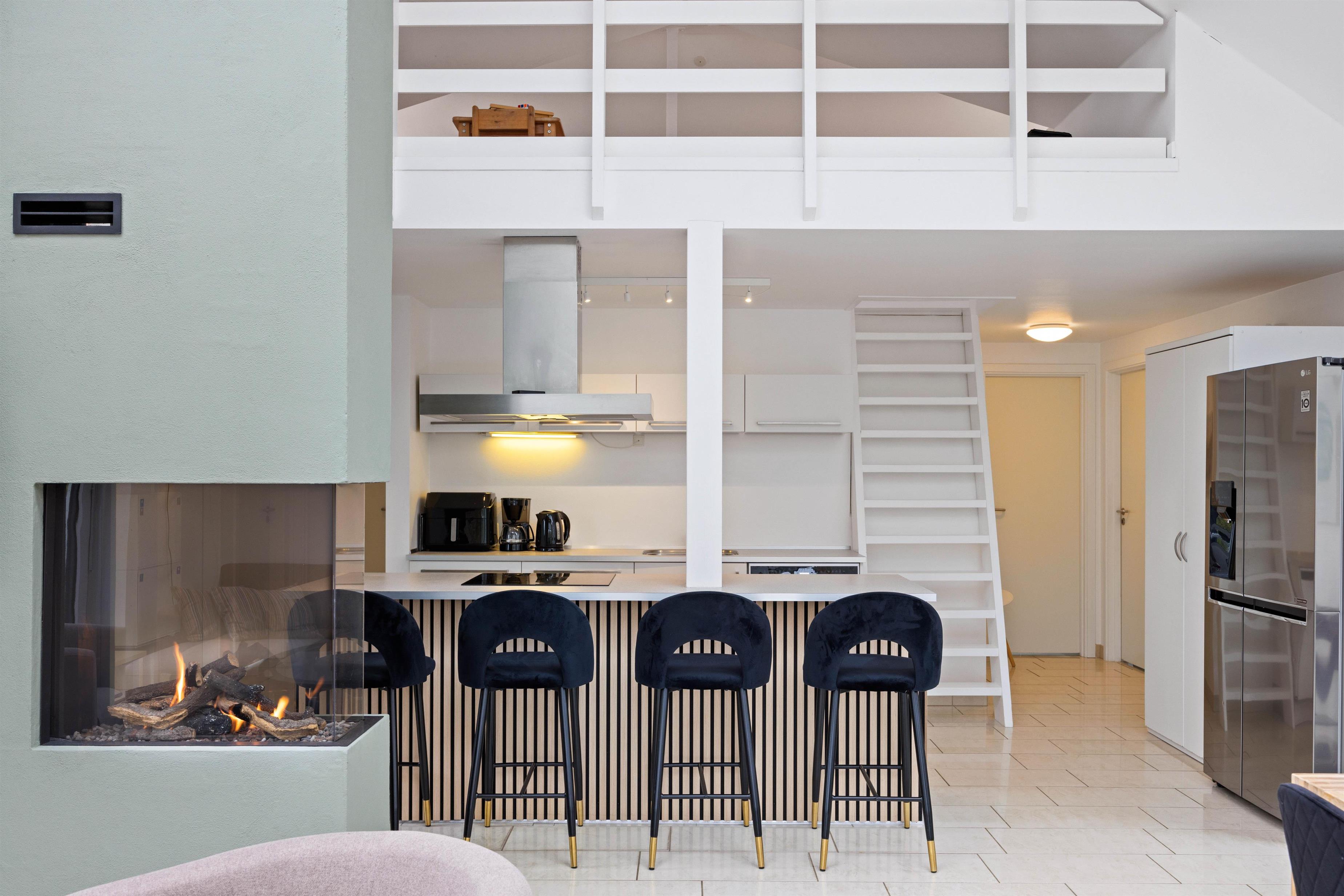 The modern kitchen flows into the living area, creating an inviting space for spending quality holiday time together. The excellent gas stove provides cosy warmth and beautiful light in the evening, generating similar heat to a traditional wood-burning stove. Gas for the fire is not included in the rental price. The large panoramic windows and skylights ensure beautiful natural light and create a pleasant atmosphere throughout.