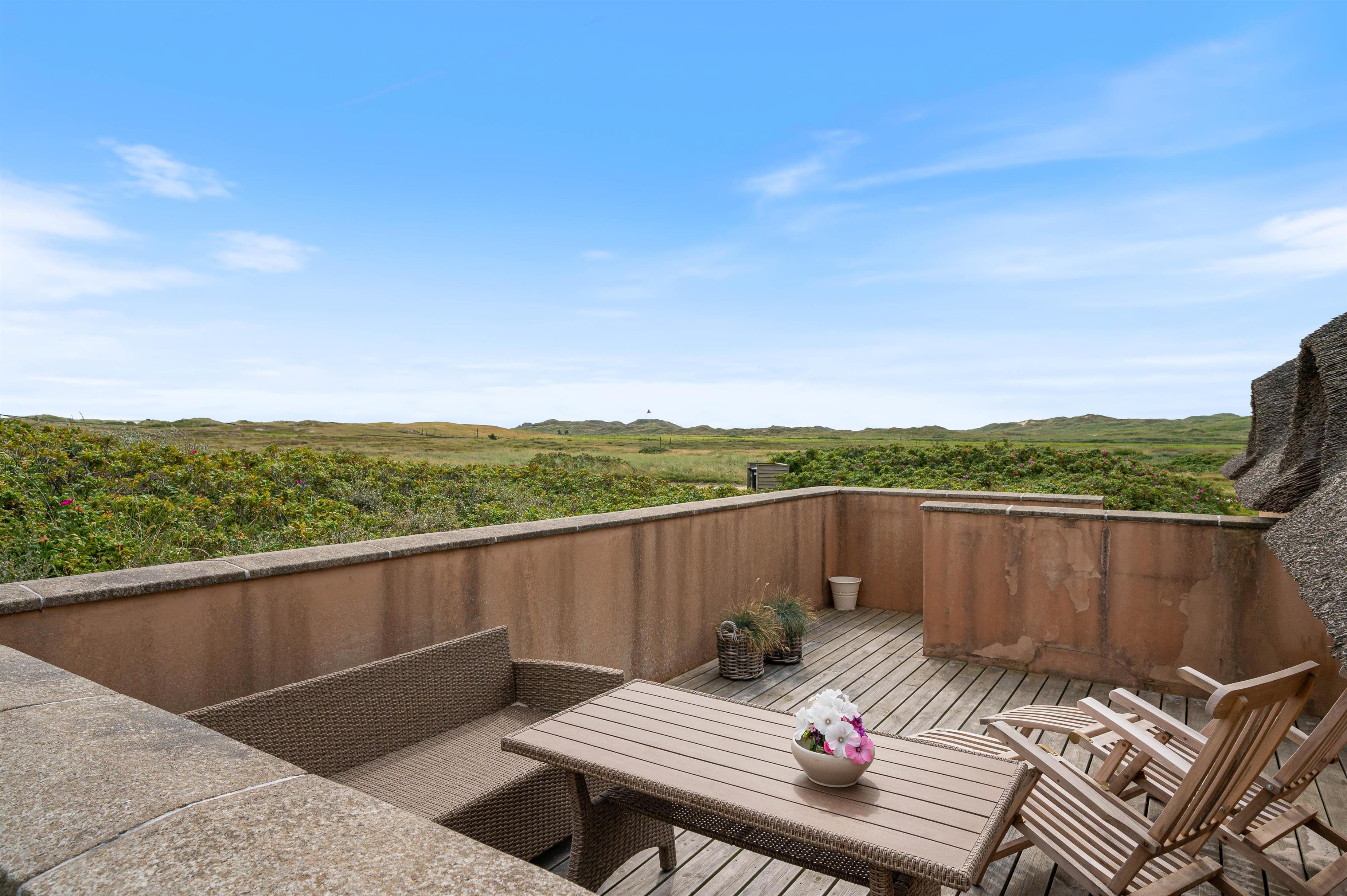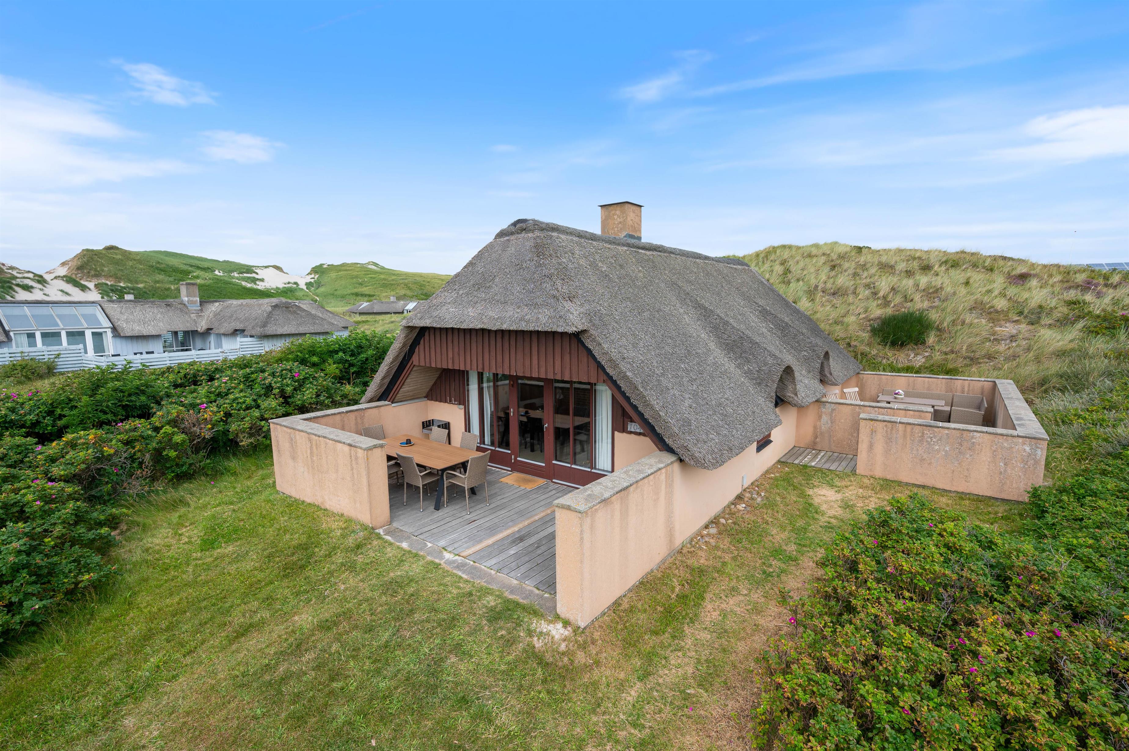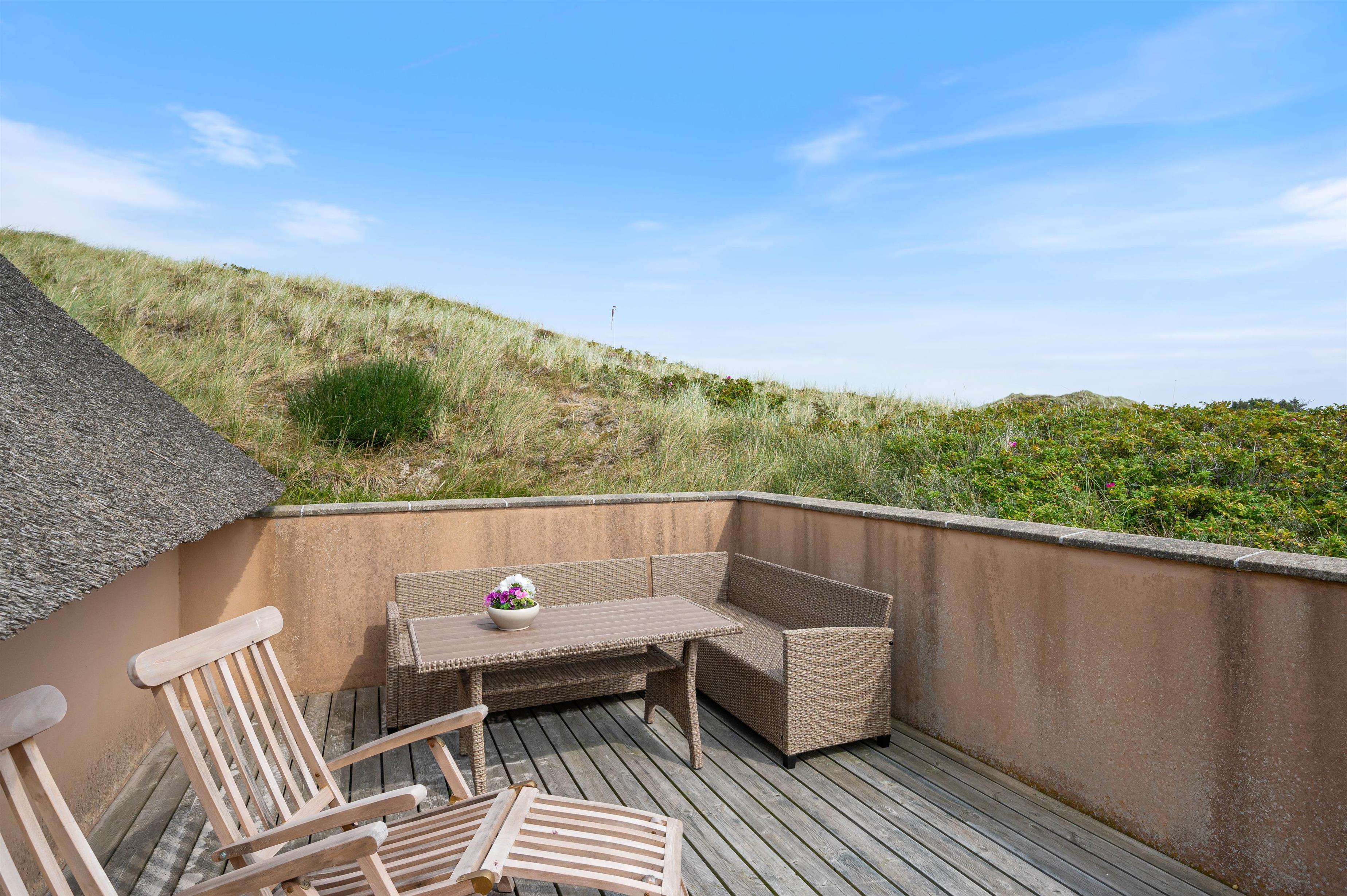 The holiday home at Vesterledevej 104 sits on a beautifully planted, hilly dune plot offering wonderful panoramic views across the neighbouring nature reserve. Thanks to its edge-of-development position, you can enjoy privacy and tranquility. The partially sheltered terrace offers garden furniture for relaxation and sun loungers for catching rays.