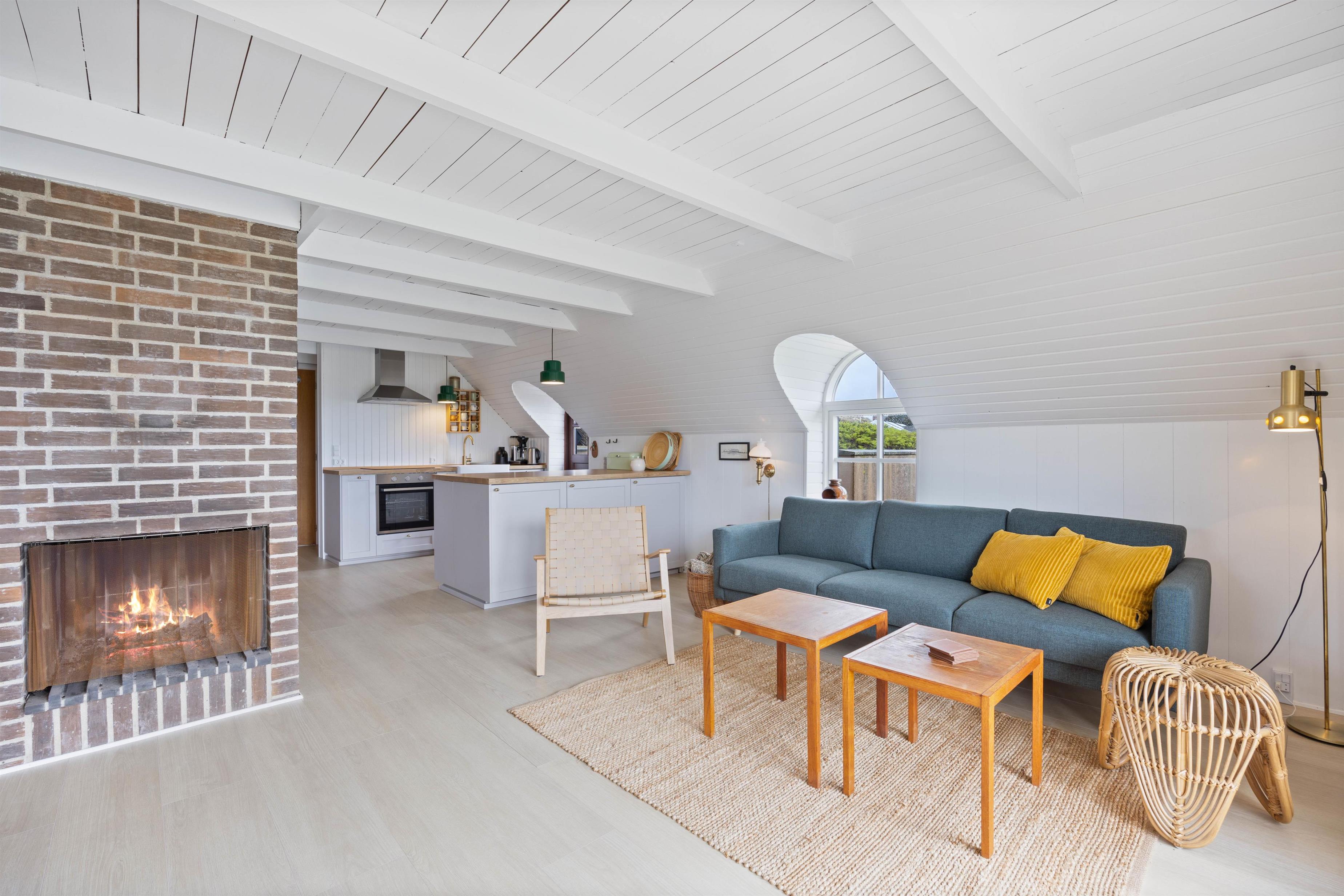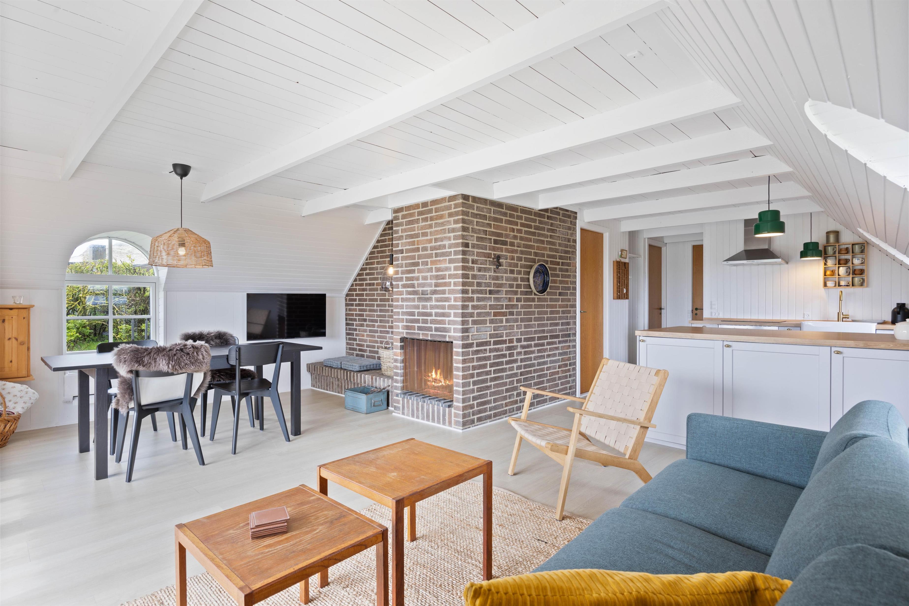 The living room, decorated in typical Danish style with light, natural colours and plenty of wood, invites you to linger. Make yourself comfortable with your favourite book by the wood-burning stove, watch television or play cards together. Alternatively, there's an energy-efficient heat pump for heating, ensuring your ideal comfort temperature.