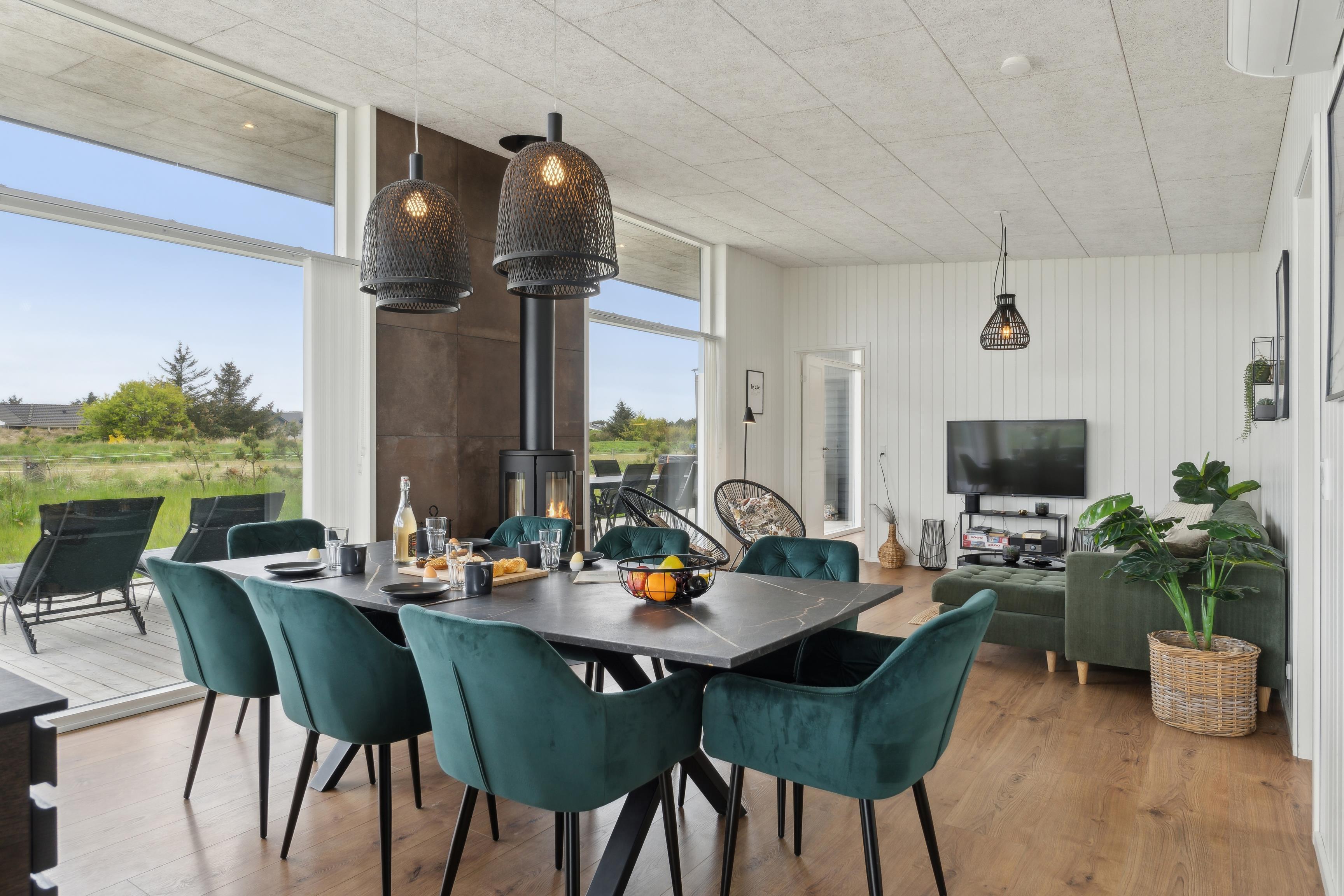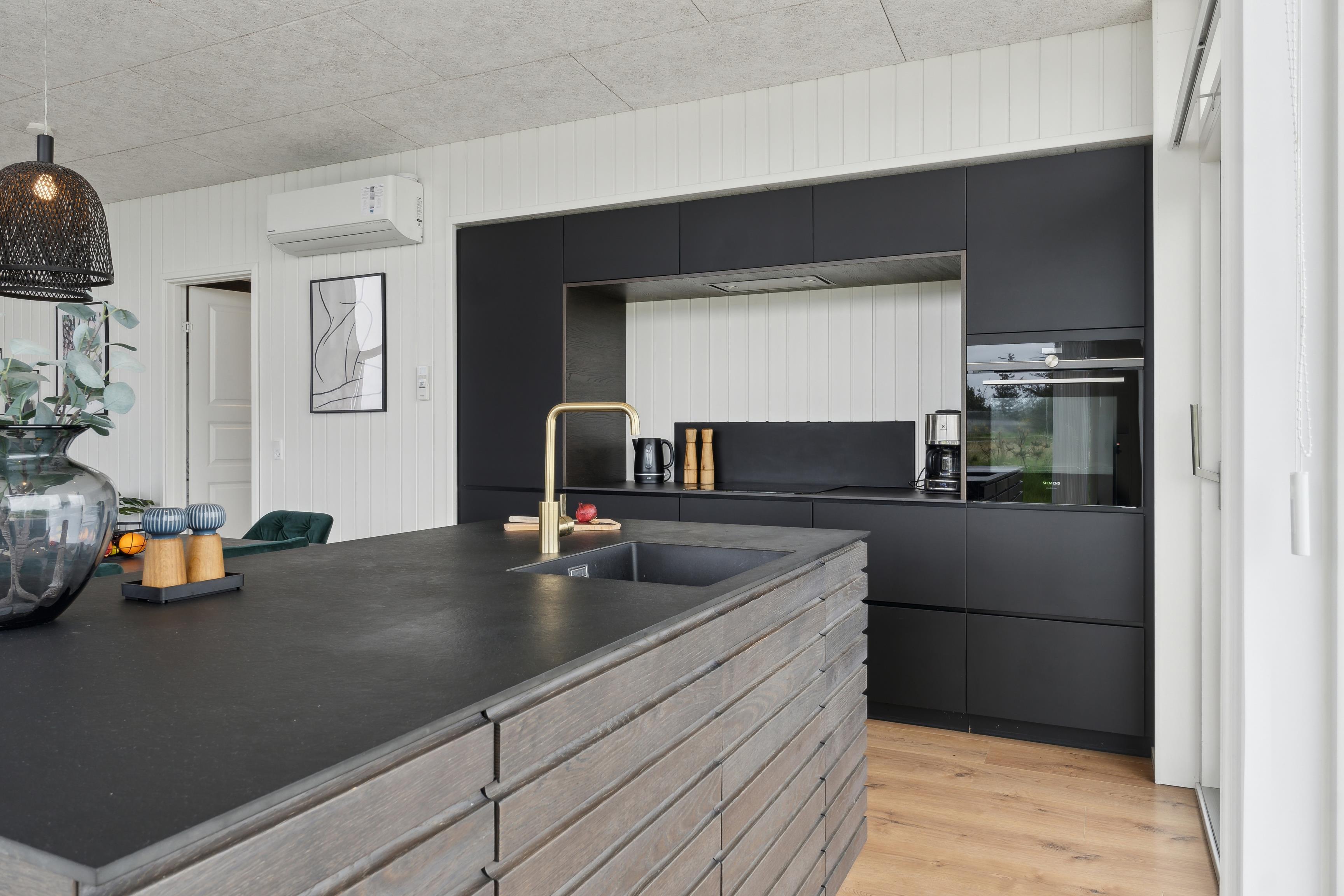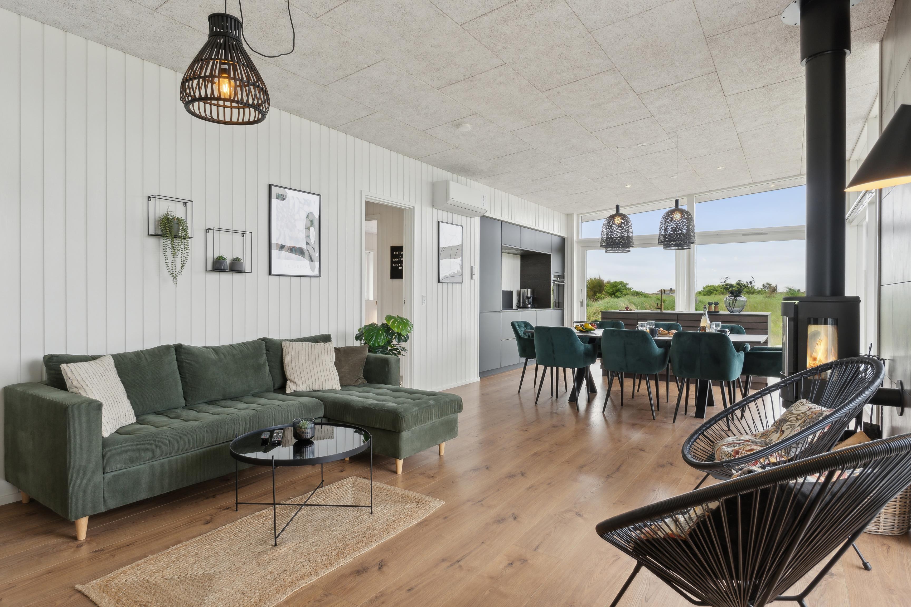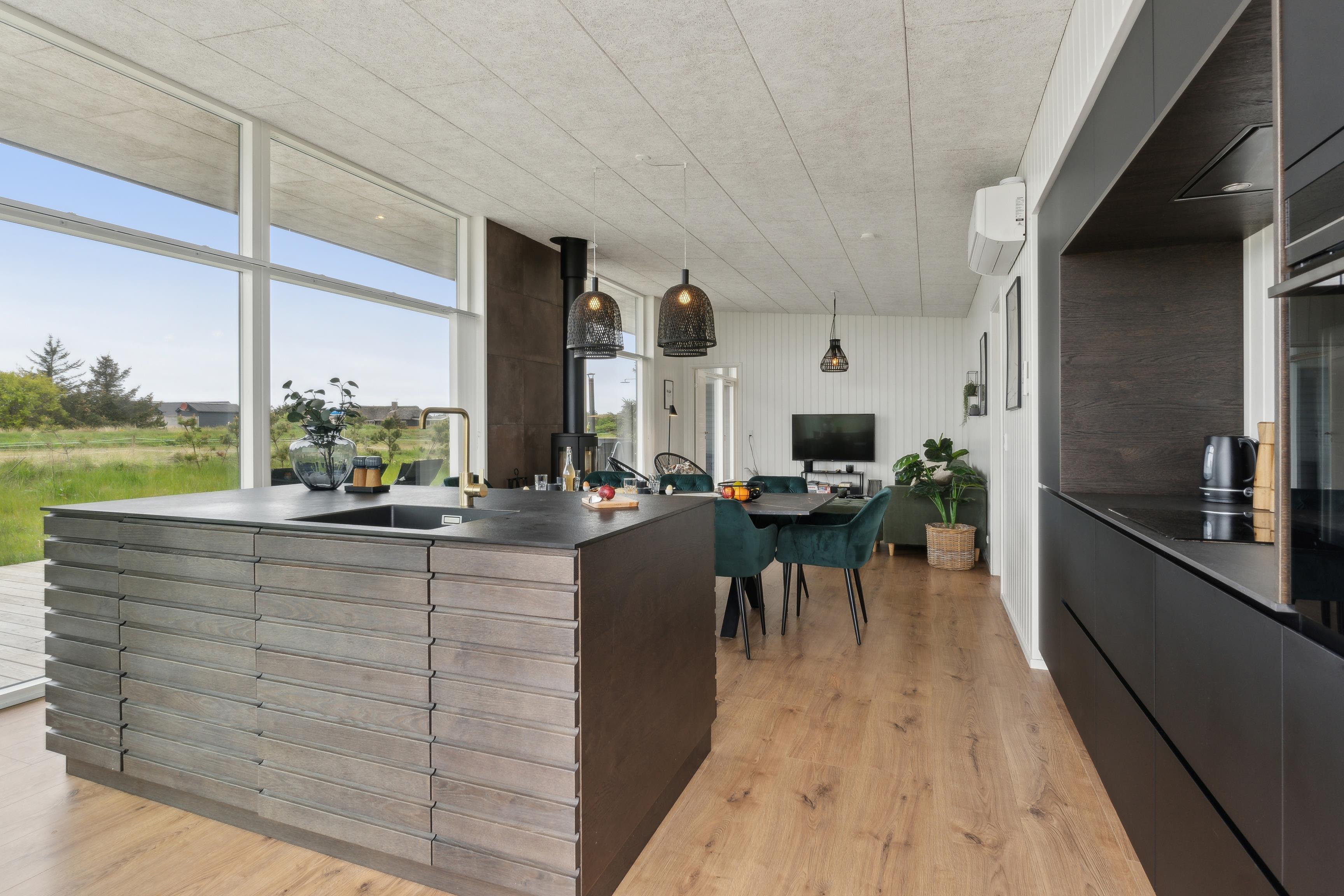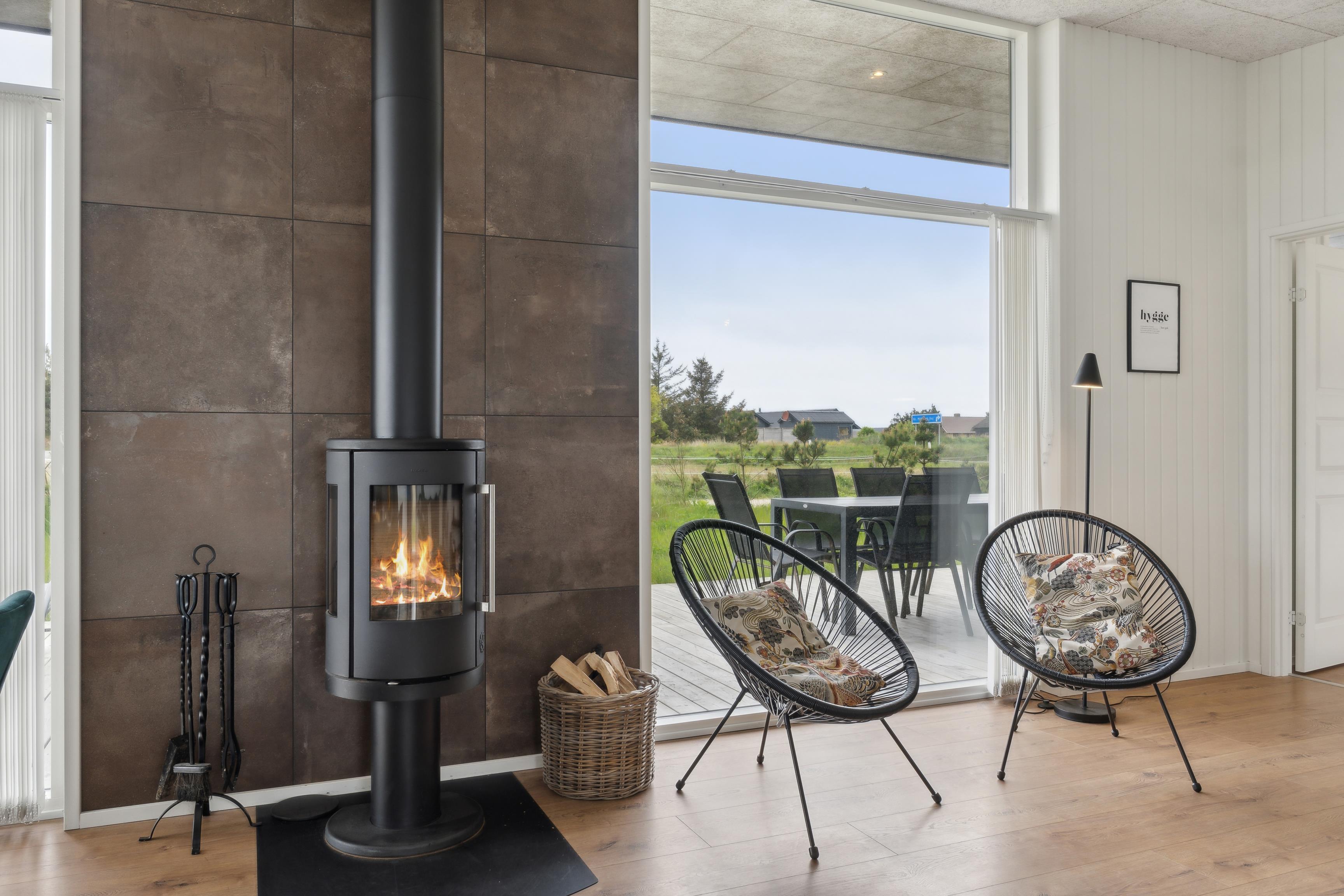 The heart of the holiday home is the open space where the kitchen, dining area, and living room are combined. Here, the whole family can enjoy a card game or a cozy evening on the sofa. There is also a fireplace that provides warmth and extra coziness on cooler days. The house also has an efficient heat pump, which can be used for heating and cooling the house on hot summer days.