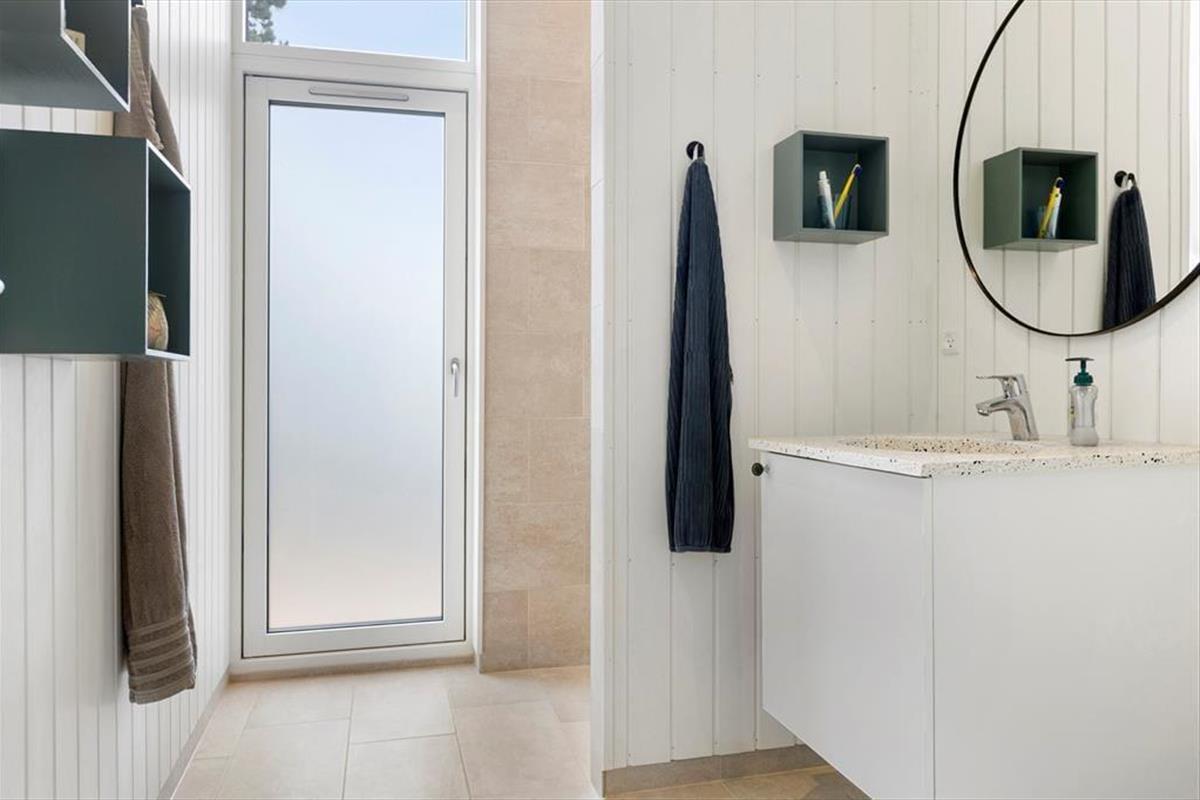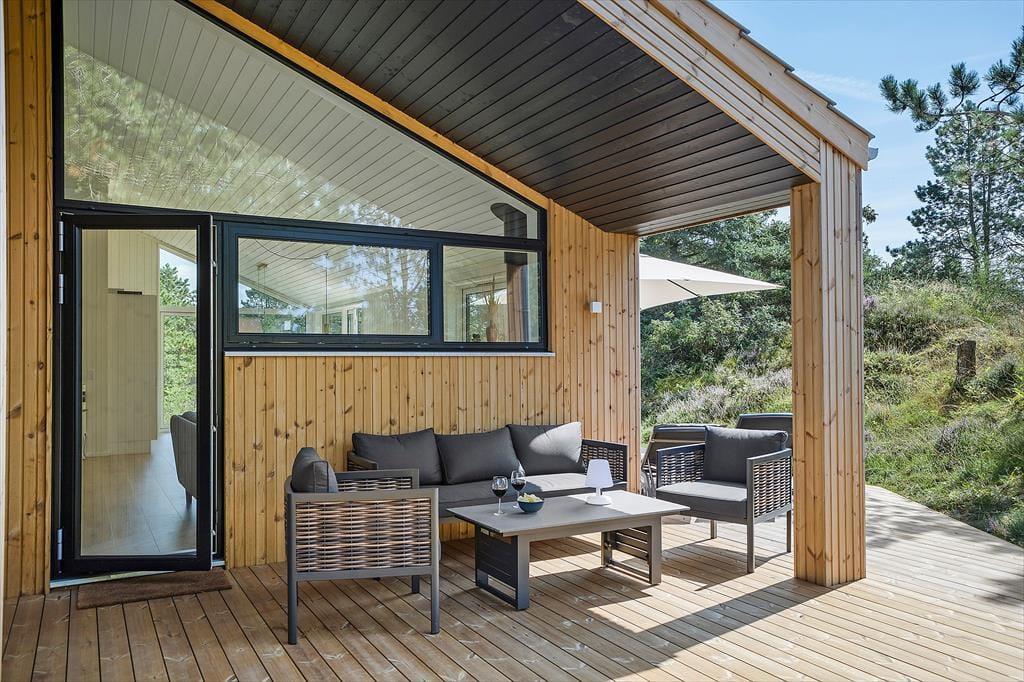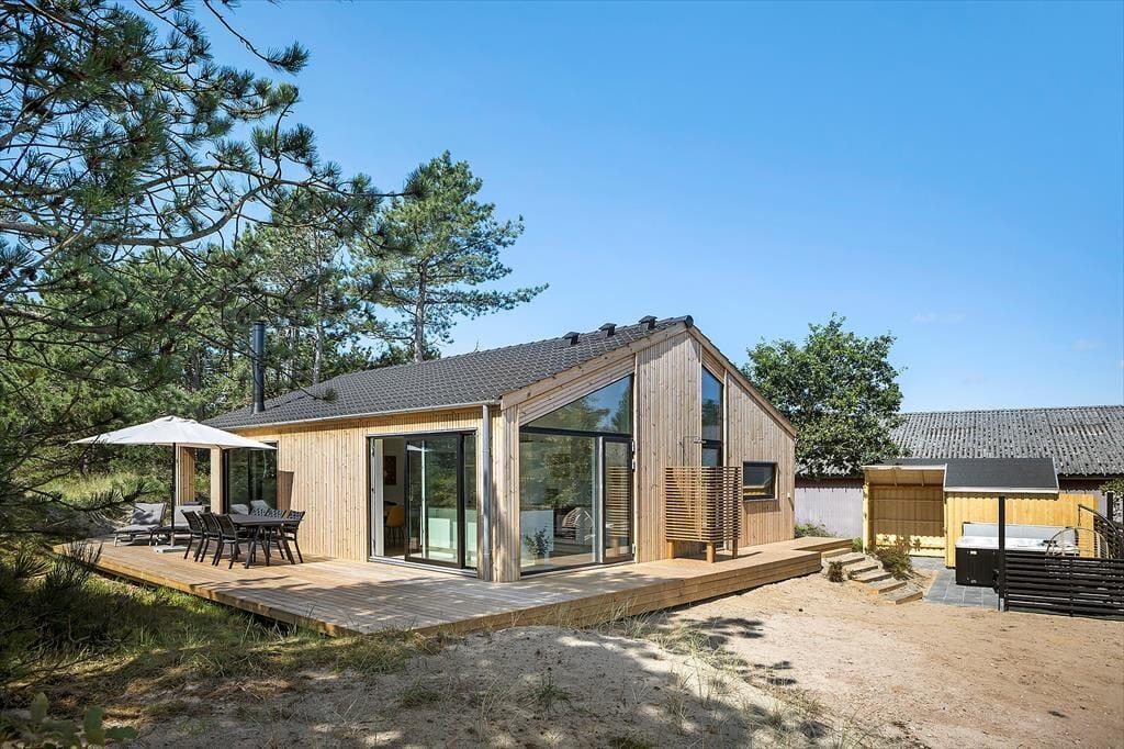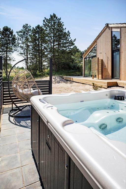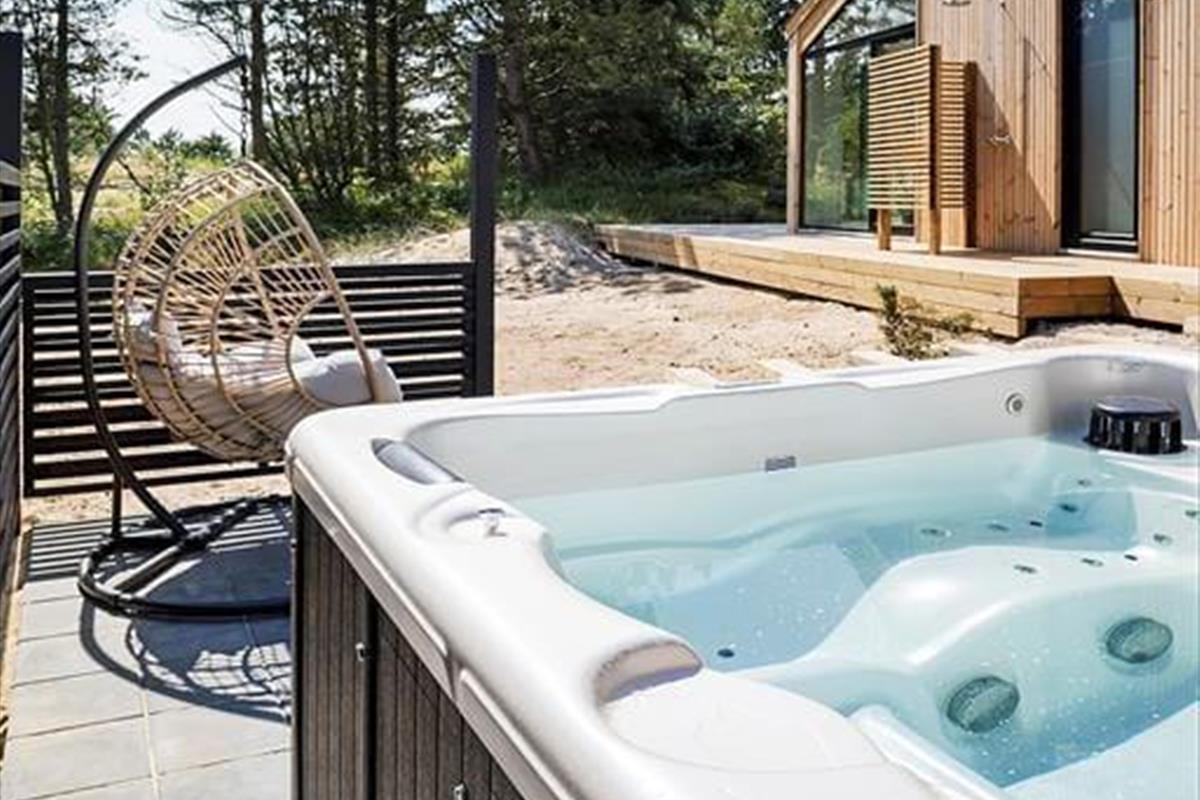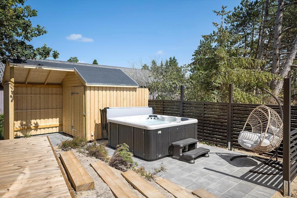 Wenn warme Temperaturen und Urlaubsstimmung herrschen, möchtest Du wahrscheinlich so viel Zeit wie möglich im Freien verbringen, und dann ist es wunderbar, inmitten eines großen und schönen Naturgrundstücks zu wohnen. Rund um das Ferienhaus erstreckt sich eine schöne Holzterrasse, auf der Du von morgens bis abends in den schönen Gartenmöbeln entspannen und Dich mit der Familie vergnügen kannst. An einem der Giebel findest Du eine Außendusche, die perfekt ist, wenn Du vom Schwimmen nach Hause kommst und Dir das Salzwasser vom Körper abspülen möchtest. Der Whirlpool im Freien hingegen ist ideal für die ruhigsten Momente des Urlaubs: Das Verweilen im warmen Wasser an einem hellen Herbsttag oder in der Dämmerung eines ruhigen Sommerabends kann leicht zu einer unvergesslichen Erinnerung werden, an die Du noch lange denken wirst.