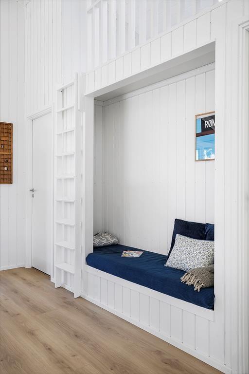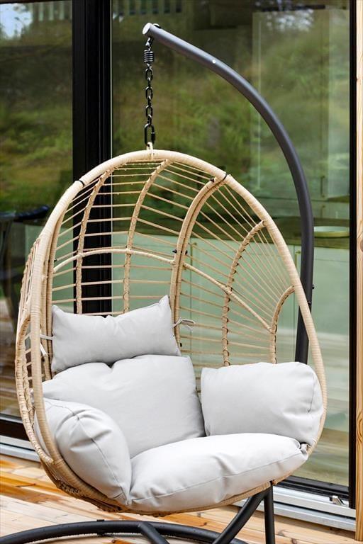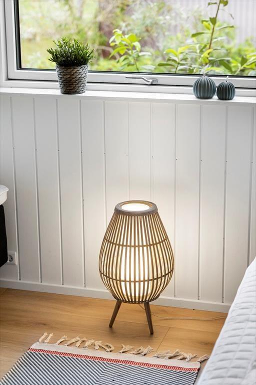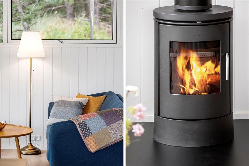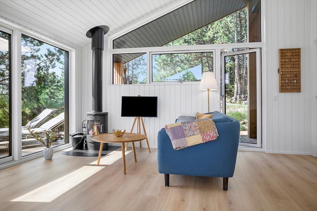 Die helle Holzfassade fügt sich gut in die üppige Vegetation des Naturgrundstücks ein und im Inneren sorgen die großen Fenster dafür, dass man die Nähe zur Natur hautnah spüren kann. Wie man es von einem absolut modernen und hochwertigen Gebäude erwarten kann, sind sowohl die Ausstattung als auch die Atmosphäre erstklassig und Du kannst Dich in den hellen Räumen sofort wohlfühlen – nicht zuletzt im Wohnzimmer, das mit einem Brennofen ausgestattet ist und an dem einen Ende mit einer gut sortierten Küche kombiniert ist. Vom Wohnraum aus führt ebenfalls eine Leiter zur Dachnische.