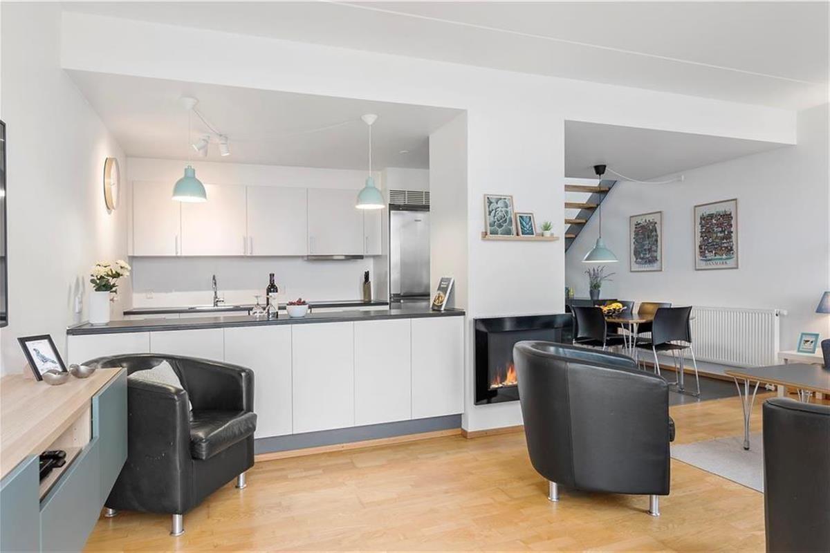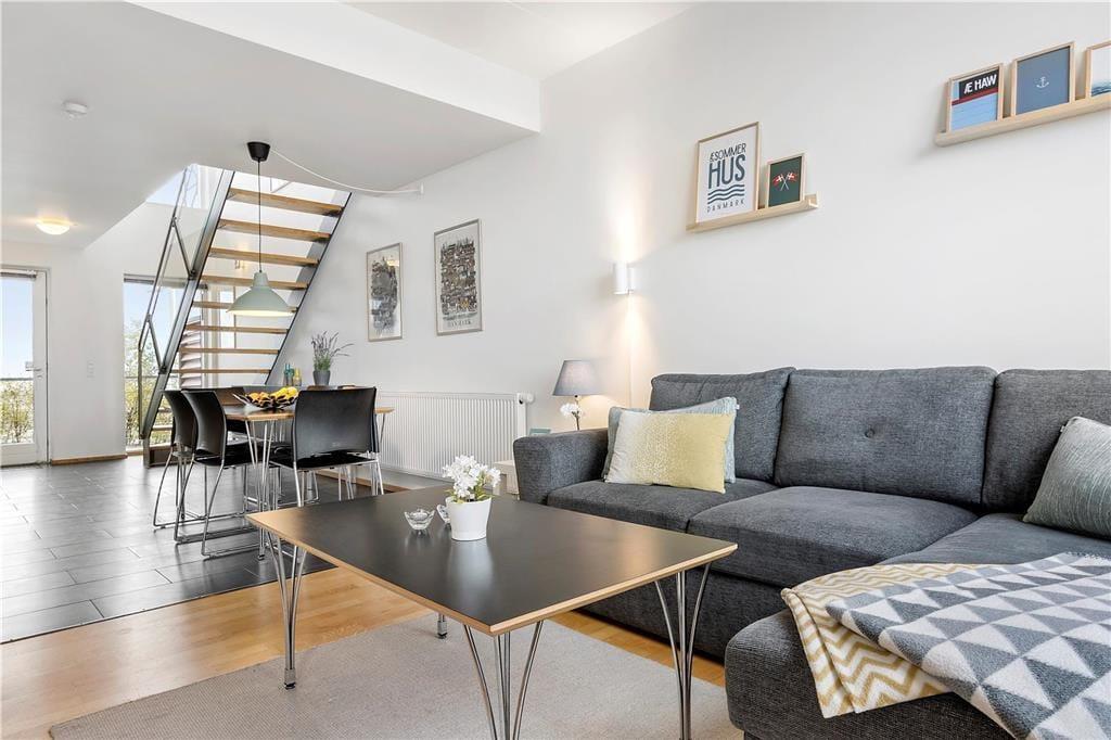 Die attraktive Lage ist allerdings nicht der einzige Pluspunkt, den Ihnen dieses Urlaubsdomizil zu bieten hat. Bei dieser Wohnung handelt es sich um ein geräumiges und außerordentlich ansprechend eingerichtetes Exemplar, das sich über zwei Etagen erstreckt. Auf beiden Etagen sorgen die großen Fensterpartien für einen herrlichen Tageslichteinfall, der maßgeblich zum schönen Wohnambiente beiträgt. Sämtliche Räume bestechen mit einer geschmackvollen Einrichtung. Dies gilt auch für die beiden Badezimmer, von denen sich eines unten und eines oben befindet. Ihnen stehen drei Schlafräume mit insgesamt fünf Schlafplätzen zur Verfügung, die allesamt im Obergeschoss platziert sind. Ein Schlafsofa kann als zusätzliche Schlafgelegenheit genutzt werden. Dieses befindet sich im Wohnraum, einem wunderschönen, großen Raum mit integrierter Küche, einem Bio-Kamin, einem Smart-TV und anderen tollen Annehmlichkeiten.