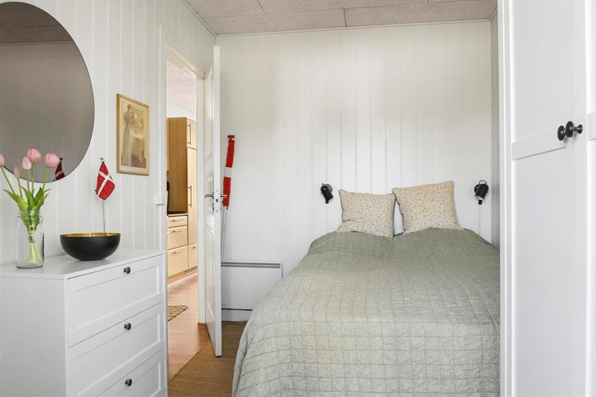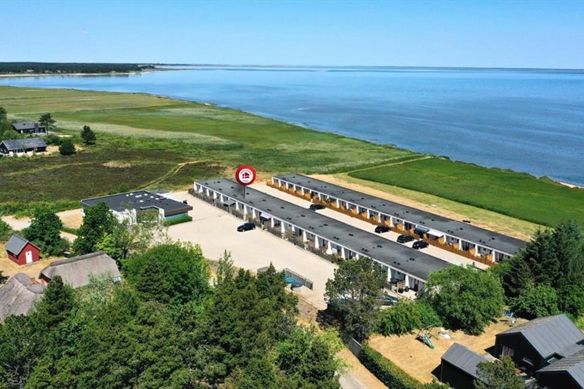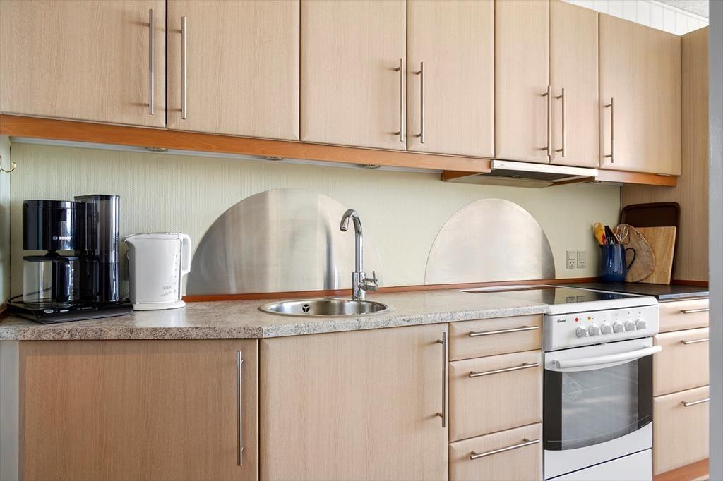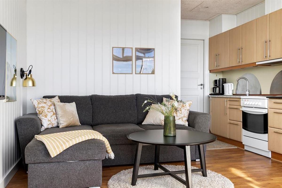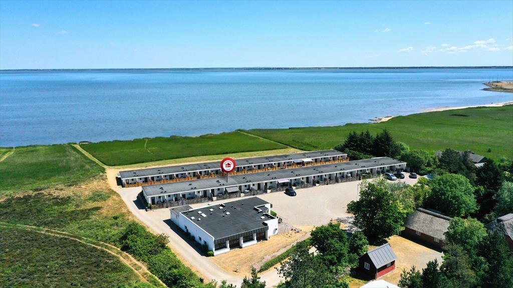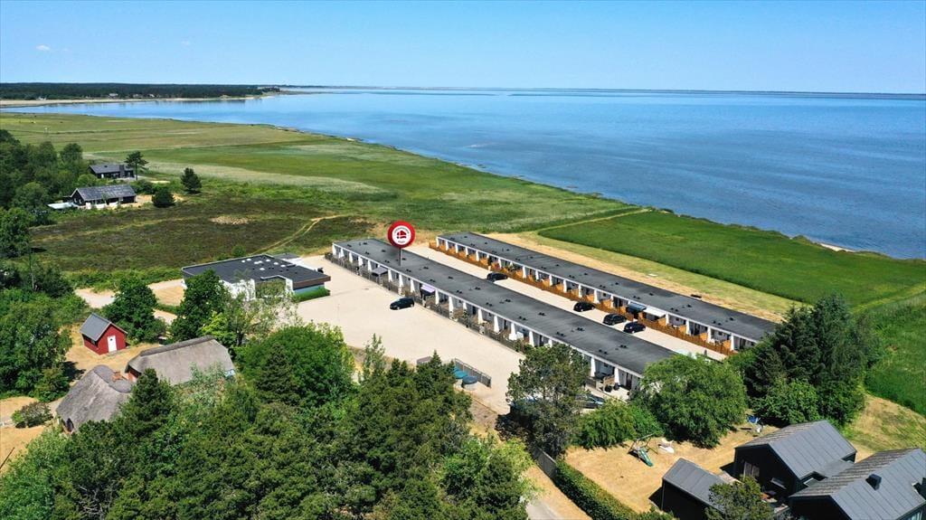 Genauer gesagt handelt es sich um ein 37 m² großes Reihenhaus, welches in zweiter Reihe Richtung Küste liegt. Dank der besonderen Architektur des Gebäudekomplexes hat man im Wohnbereich Aussicht über das Wasser. Gleichzeitig kann man den schönen Lichteinfall durch die große Fensterfront genießen, welche auch eine Tür hat, durch die man an warmen Sonnentagen bequem auf die Terrasse hinaustreten kann. Möchte man es sich drinnen gemütlich machen, kann man sich am Esstisch zusammensetzen, sich im Sofa entspannen oder gemeinsame Zeit beim Zubereiten der Mahlzeiten in der offenen Küche verbringen. Das Sofa ist übrigens ein Schlafsofa, sodass der Wohnbereich nachts als Schlafraum für zwei Personen dienen kann, während das angrenzende Schlafzimmer mit zwei Einzelbetten ausgestattet ist. Ein Badezimmer mit Dusche gehört selbstverständlich ebenfalls zur Raumaufteilung des Hauses.