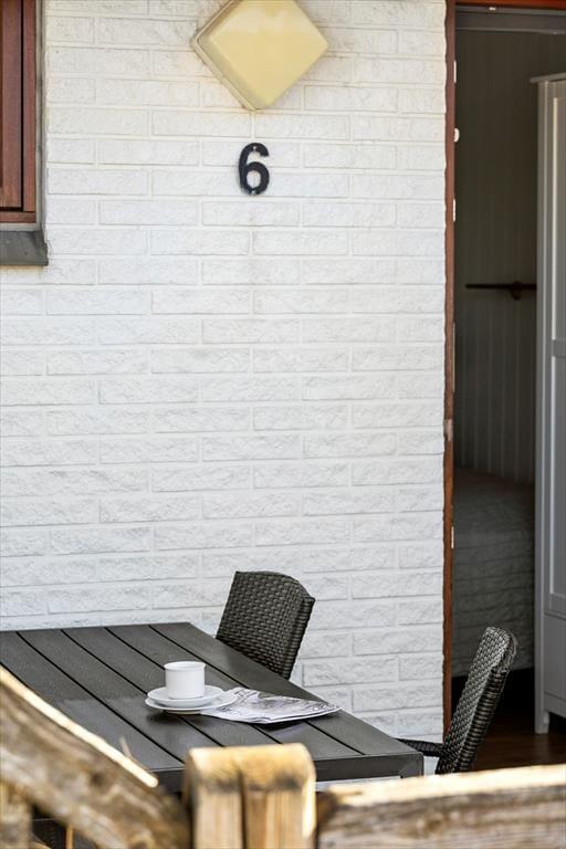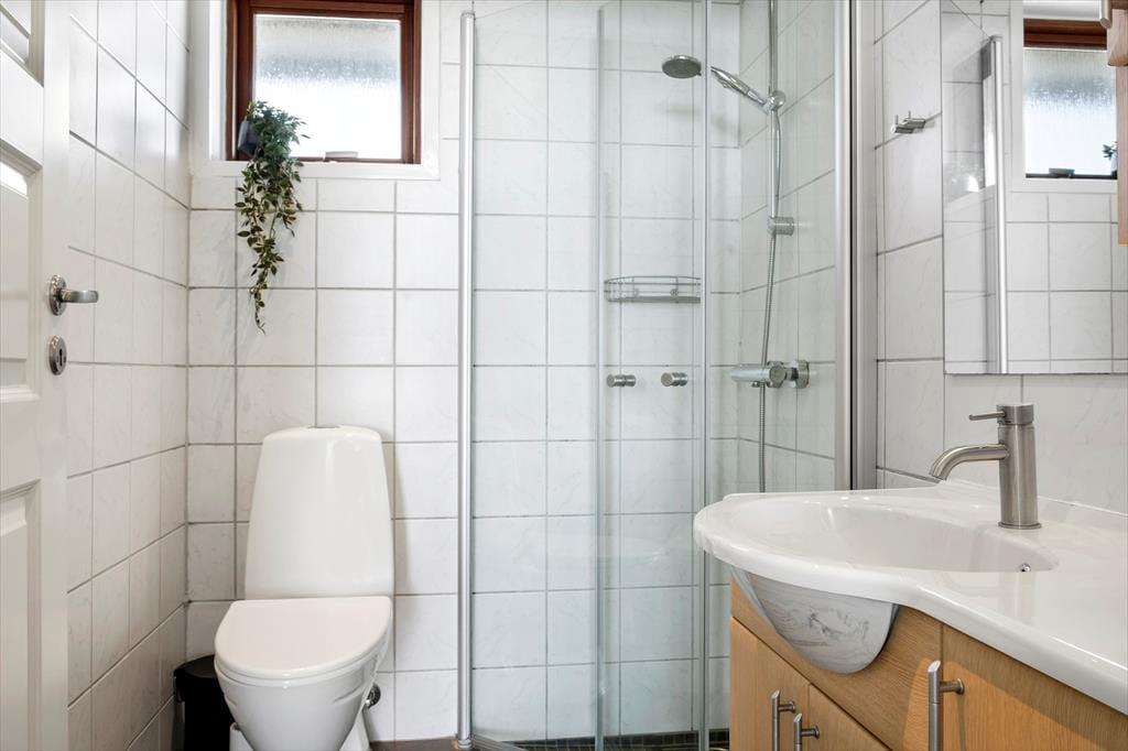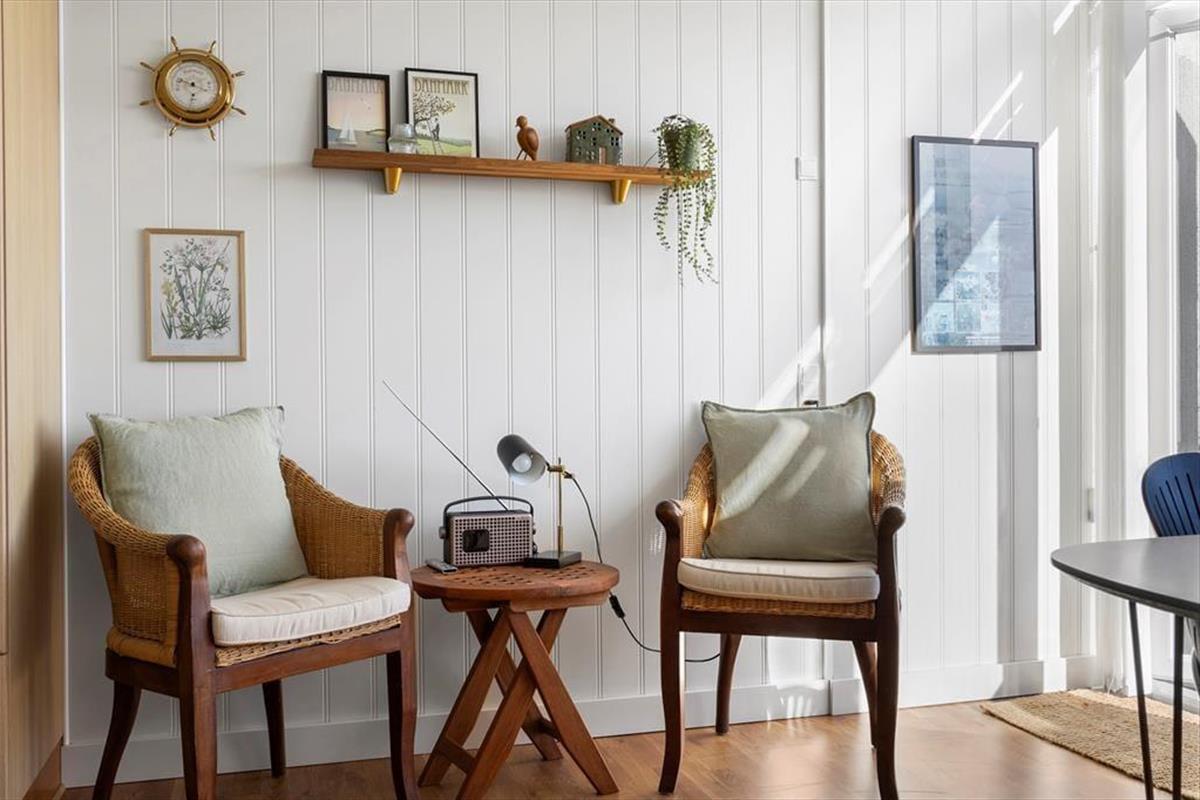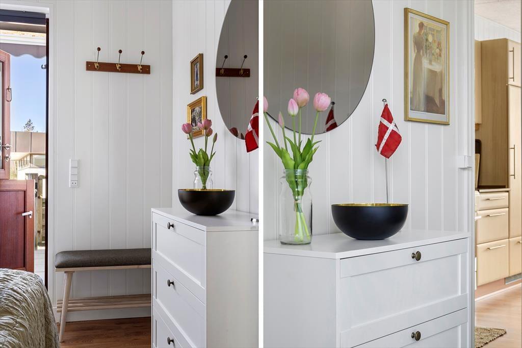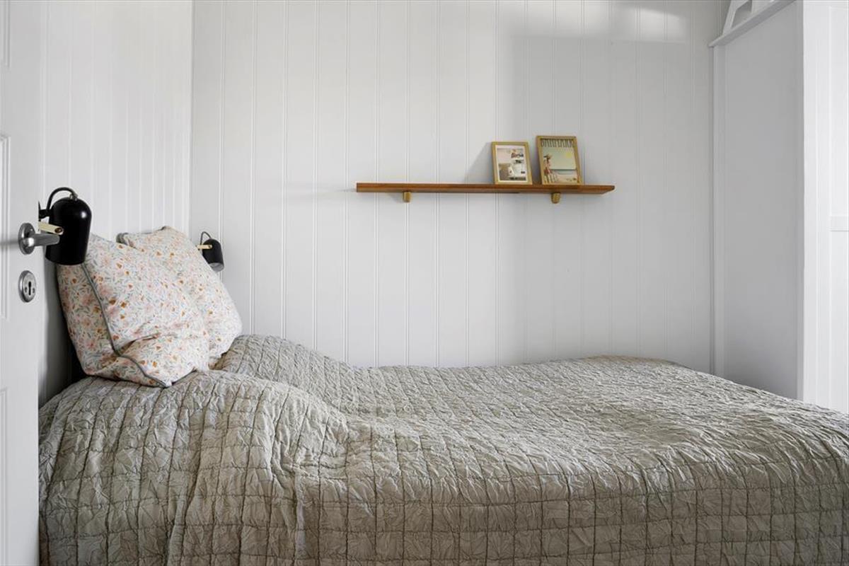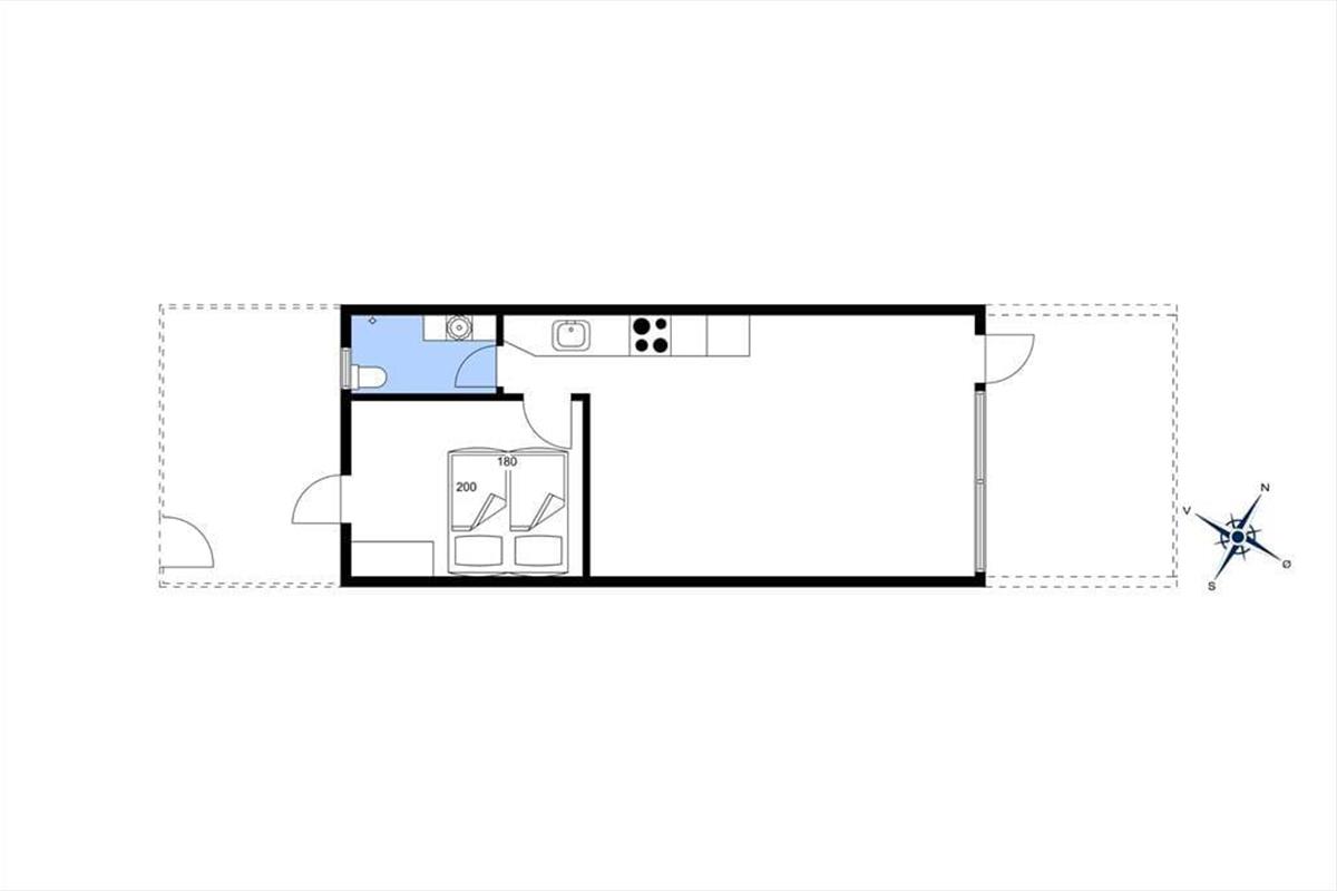 Genauer gesagt handelt es sich um ein 37 m² großes Reihenhaus, welches in zweiter Reihe Richtung Küste liegt. Dank der besonderen Architektur des Gebäudekomplexes hat man im Wohnbereich Aussicht über das Wasser. Gleichzeitig kann man den schönen Lichteinfall durch die große Fensterfront genießen, welche auch eine Tür hat, durch die man an warmen Sonnentagen bequem auf die Terrasse hinaustreten kann. Möchte man es sich drinnen gemütlich machen, kann man sich am Esstisch zusammensetzen, sich im Sofa entspannen oder gemeinsame Zeit beim Zubereiten der Mahlzeiten in der offenen Küche verbringen. Das Sofa ist übrigens ein Schlafsofa, sodass der Wohnbereich nachts als Schlafraum für zwei Personen dienen kann, während das angrenzende Schlafzimmer mit zwei Einzelbetten ausgestattet ist. Ein Badezimmer mit Dusche gehört selbstverständlich ebenfalls zur Raumaufteilung des Hauses.