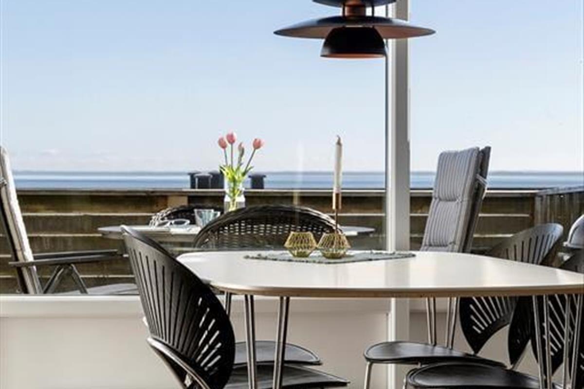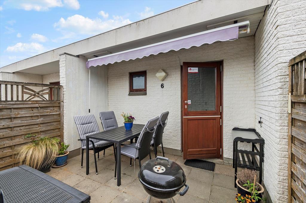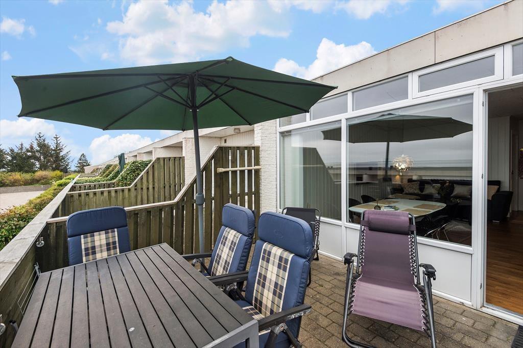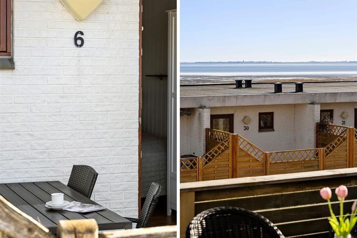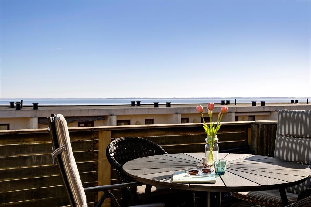 Auf der nach Osten ausgerichteten, geschlossenen Terrasse kann man die Morgensonne und das Wattenmeer Richtung Festland genießen. Ein herrlicher Ort, um sich im Freien aufzuhalten – aber es ist auch angenehm auf der anderen, westlichen Seite des Hauses zu sitzen, wo Sie eine Terrasse mit Markise und Gartenmöbeln erwartet.
