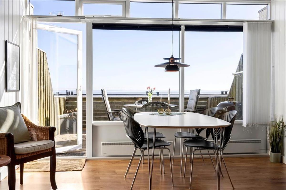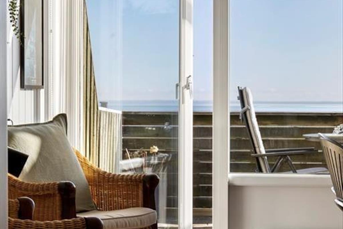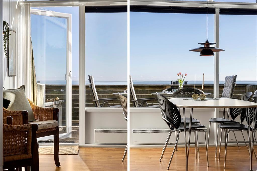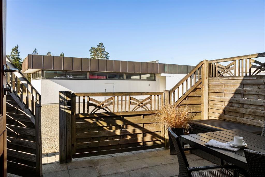 Auf der nach Osten ausgerichteten, geschlossenen Terrasse kann man die Morgensonne und das Wattenmeer Richtung Festland genießen. Ein herrlicher Ort, um sich im Freien aufzuhalten – aber es ist auch angenehm auf der anderen, westlichen Seite des Hauses zu sitzen, wo Sie eine Terrasse mit Markise und Gartenmöbeln erwartet.