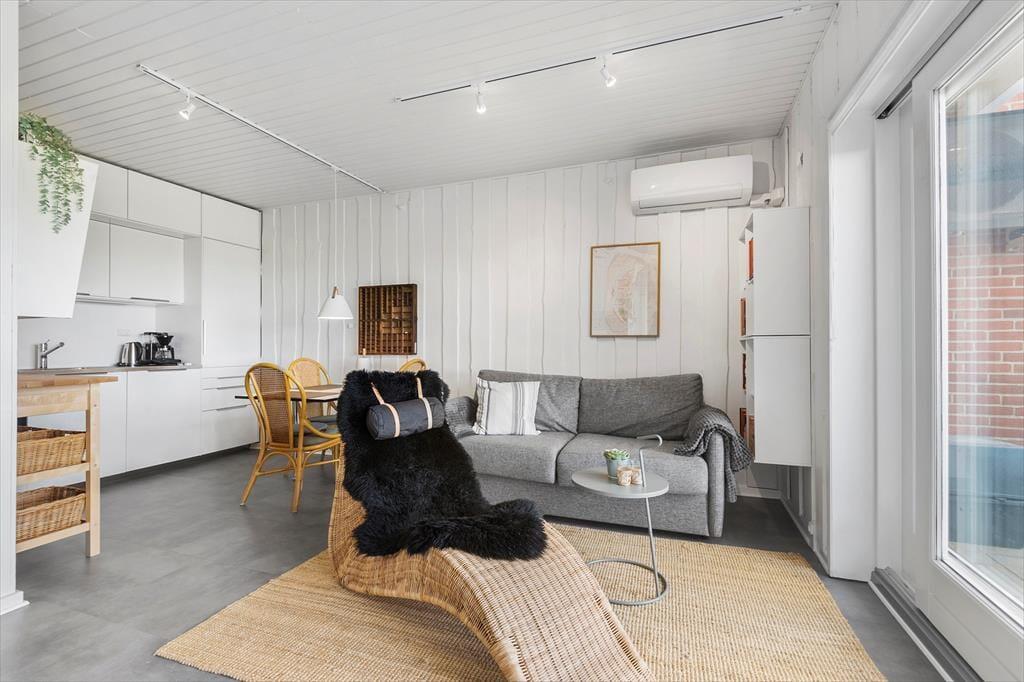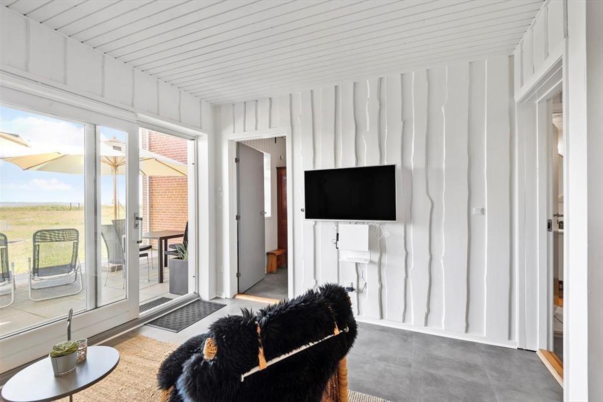 Die 48 m² der Wohnung sind optimal genutzt mit einem Badezimmer, einem Schlafzimmer und einem Wohnzimmer mit integriertem Küchenbereich. Das Schlafzimmer ist mit einem Doppelbett ausgestattet und zudem gibt es ein Schlafsofa im Wohnzimmer, sodass die Ferienwohnung insgesamt vier Urlaubsgäste beherbergen kann. Alle Räume sind gepflegt, und das Wohnzimmer wurde zum Beispiel mit einem UHD-Smart-TV mit dänischen und deutschen Kanälen ausgestattet. Durch die nach Süden ausgerichtete Fensterfront des Wohnzimmers kannst du den schönen Blick auf das Wattenmeer und die grüne Natur genießen.