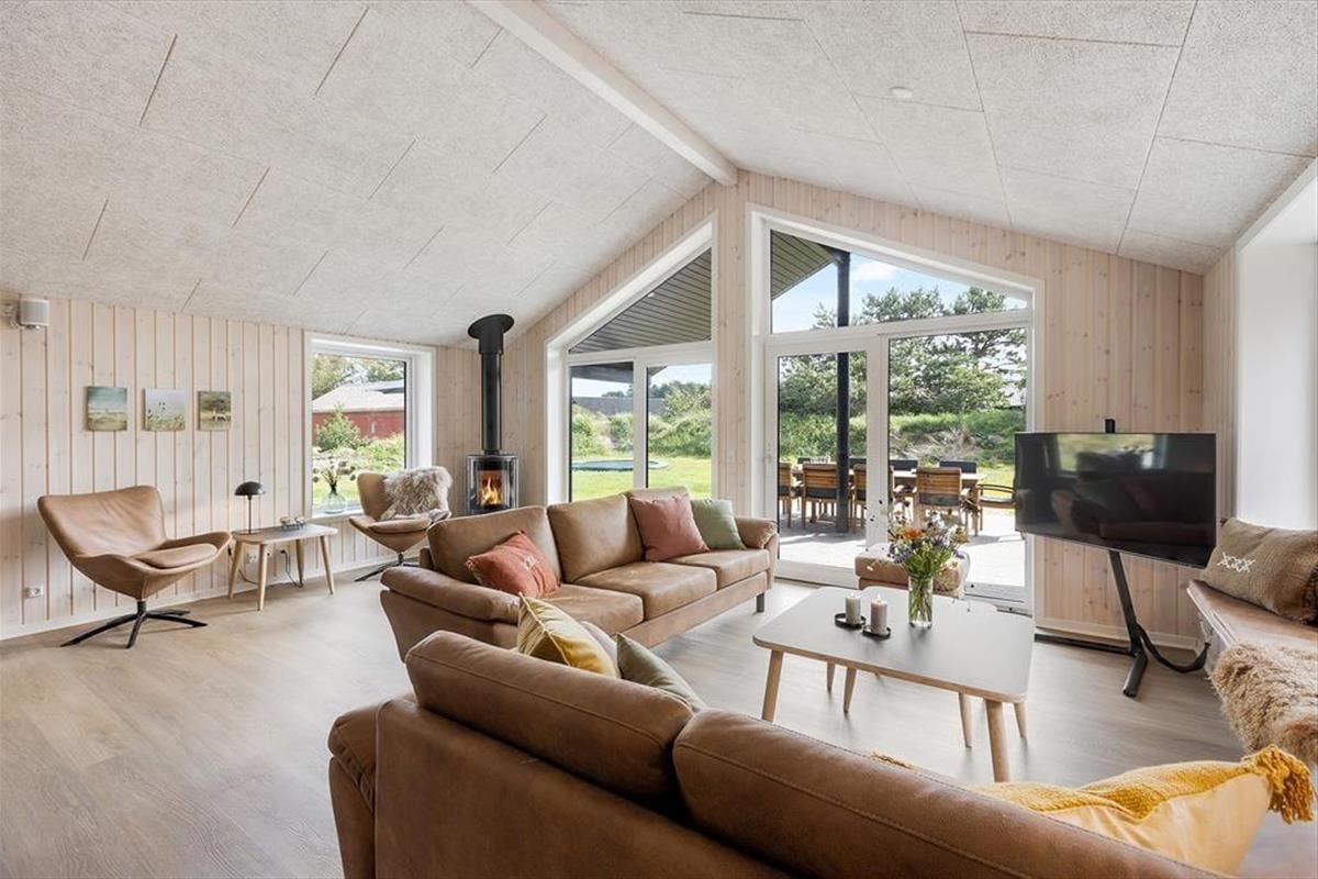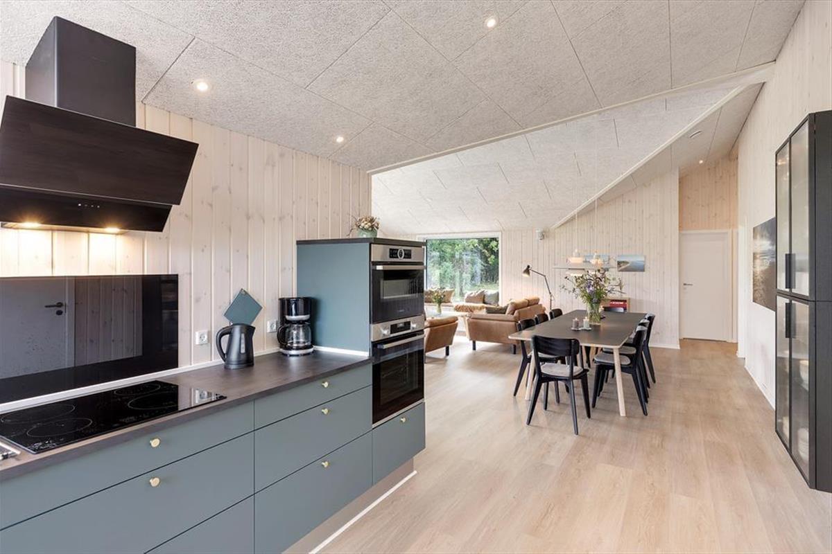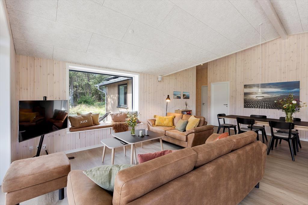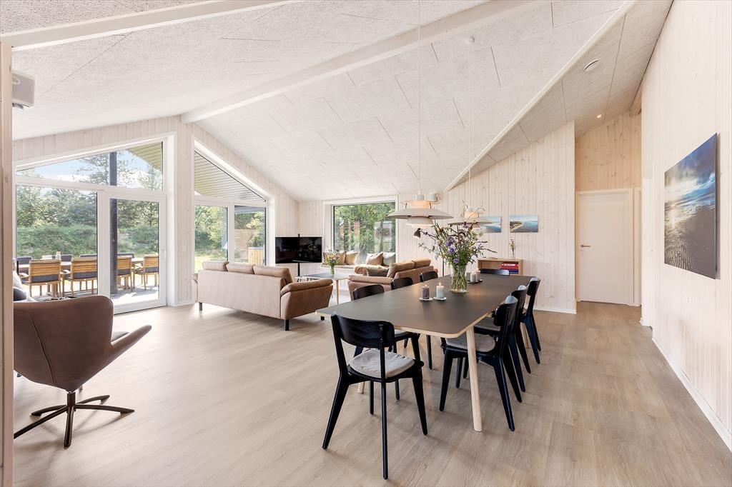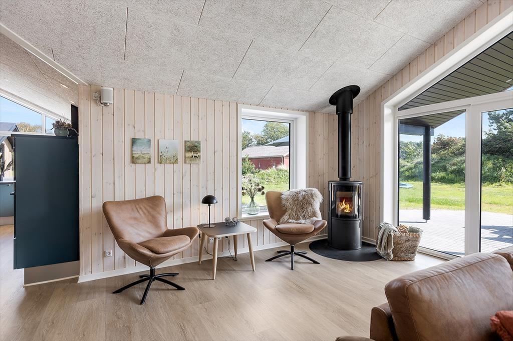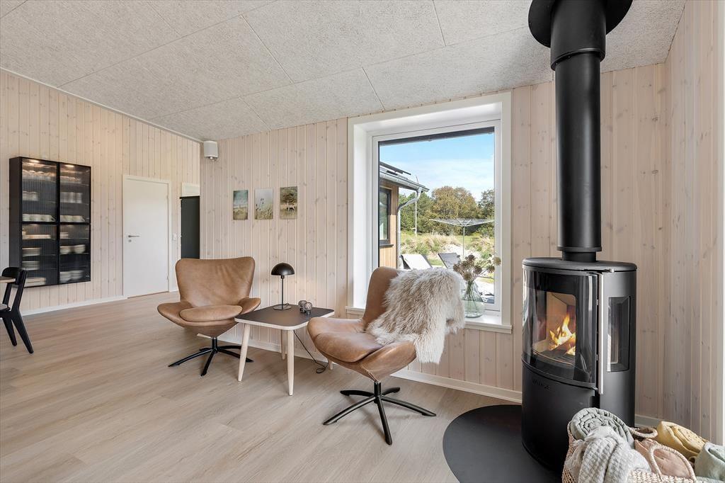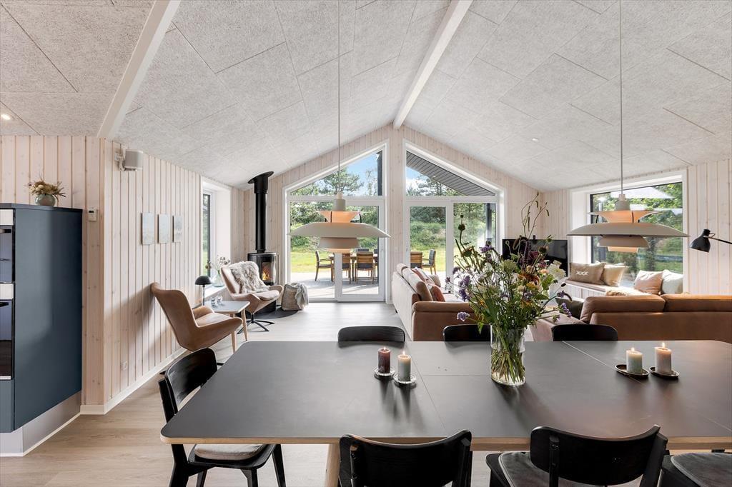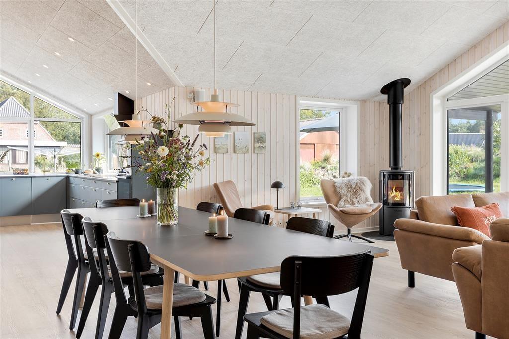 In diesem 136 m² großen und komplett neu erbauten Ferienhaus gibt es Platz für bis zu 10 Personen, sodass du Freunde oder Familie problemlos in den Urlaub einladen kannst. Alle vier Schlafzimmer verfügen über jeweils ein Doppelbett und Kleiderschränke. Im größten Schlafraum gibt es zusätzlich ein eingebautes Etagenbett, das beispielsweise als gemütlicher Schlafplatz für die Kinder benutzt werden kann. Die Wohnfläche verfügt auch über zwei schöne Badezimmer, von denen das größte mit einem Eck-Whirlpool ausgestattet ist, und im Eingangsbereich erwartet dich eine praktische Waschsäule. Alle Räume wirken hell und stilvoll, das Allerbeste ist jedoch der Wohnbereich, in dem Wohnzimmer und Küche kombiniert sind. Hier findest du viel Platz für Entspannung und Gemütlichkeit – zum Beispiel bei einer leckeren Mahlzeit am Esstisch oder bequem zurückgelehnt im Sofabereich mit Blick auf den Brennofen. Außerdem besteht die Möglichkeit, in der eingebauten Kuschelecke auf der Fensterbank bei einer heißen Tasse Kaffee zu sitzen, und wenn dir der Sinn nach Unterhaltung ist, stehen dir ein großer Flachbildfernseher sowie Sonos-Lautsprecher zur Verfügung.