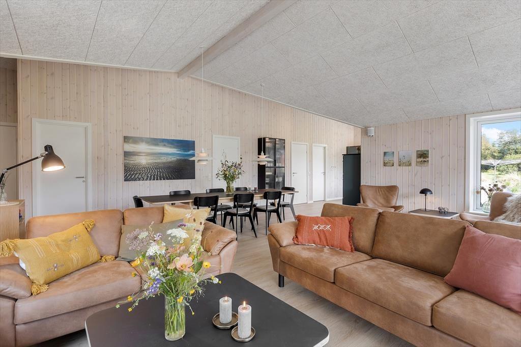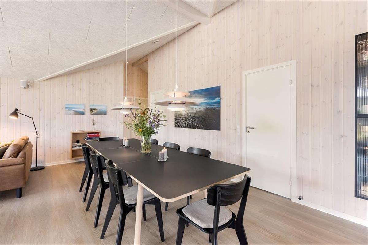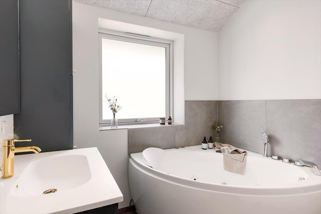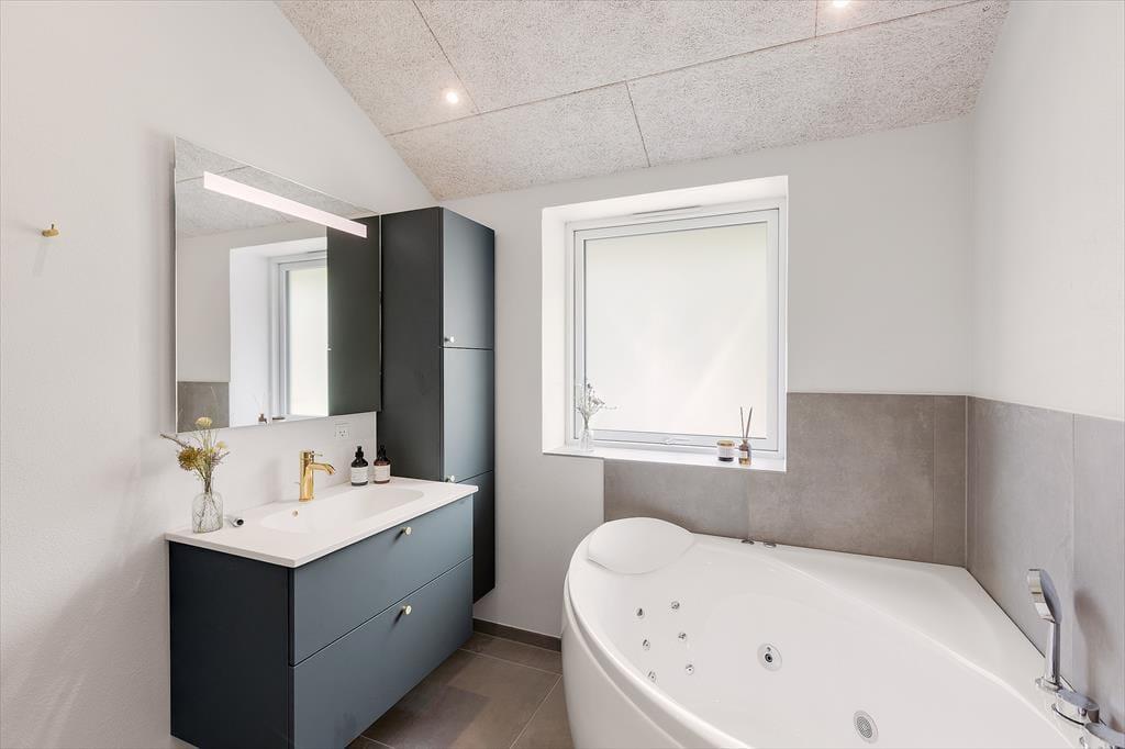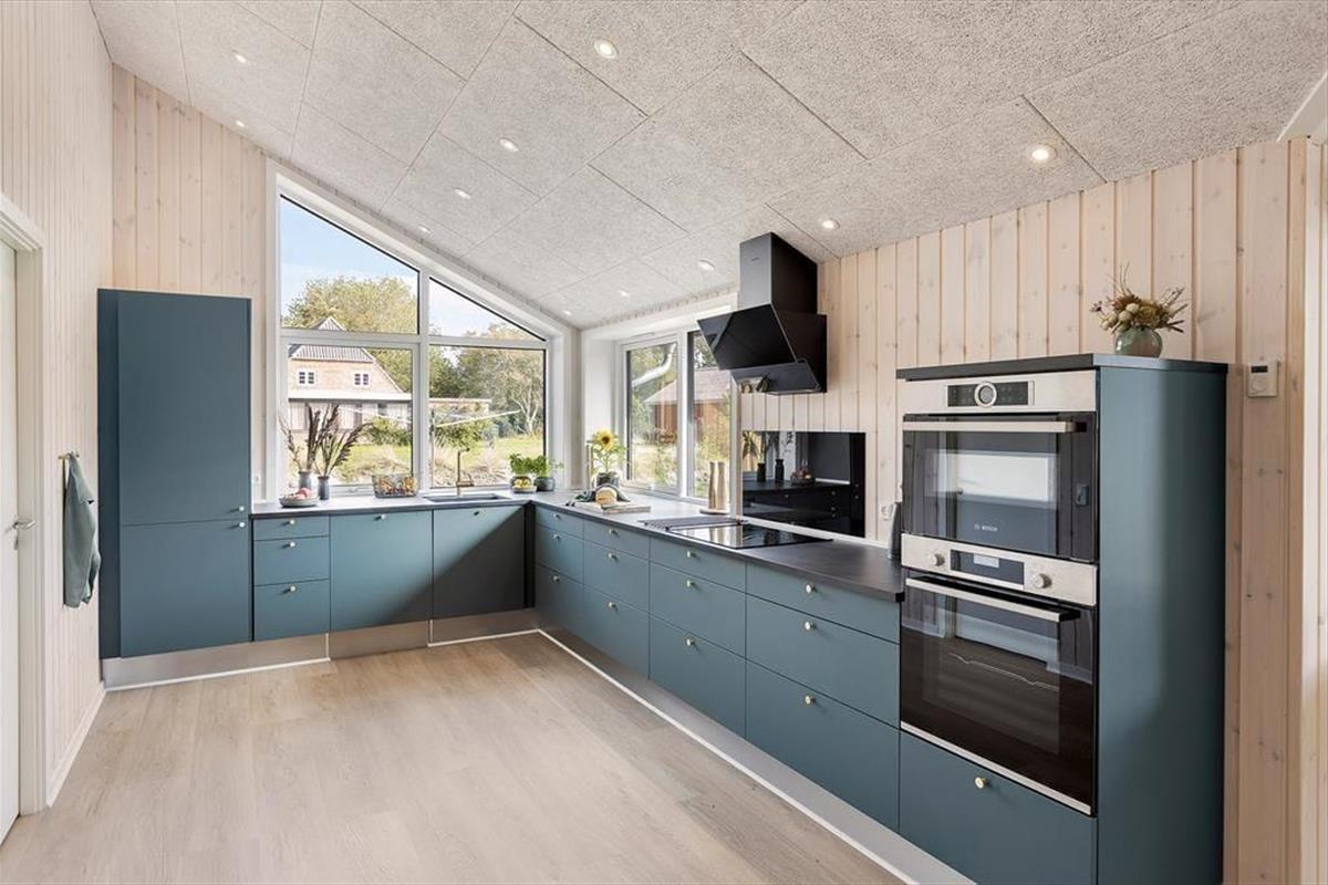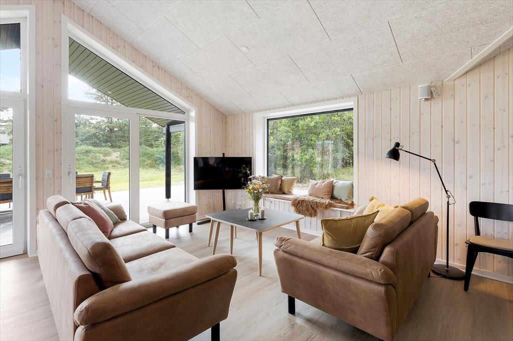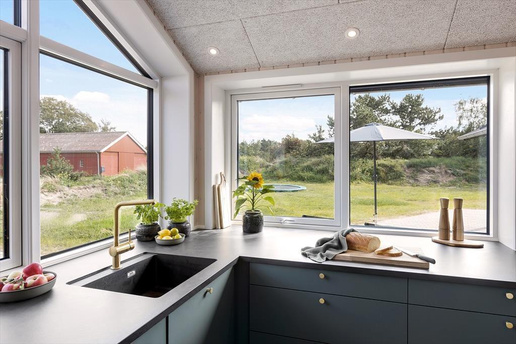 In diesem 136 m² großen und komplett neu erbauten Ferienhaus gibt es Platz für bis zu 10 Personen, sodass du Freunde oder Familie problemlos in den Urlaub einladen kannst. Alle vier Schlafzimmer verfügen über jeweils ein Doppelbett und Kleiderschränke. Im größten Schlafraum gibt es zusätzlich ein eingebautes Etagenbett, das beispielsweise als gemütlicher Schlafplatz für die Kinder benutzt werden kann. Die Wohnfläche verfügt auch über zwei schöne Badezimmer, von denen das größte mit einem Eck-Whirlpool ausgestattet ist, und im Eingangsbereich erwartet dich eine praktische Waschsäule. Alle Räume wirken hell und stilvoll, das Allerbeste ist jedoch der Wohnbereich, in dem Wohnzimmer und Küche kombiniert sind. Hier findest du viel Platz für Entspannung und Gemütlichkeit – zum Beispiel bei einer leckeren Mahlzeit am Esstisch oder bequem zurückgelehnt im Sofabereich mit Blick auf den Brennofen. Außerdem besteht die Möglichkeit, in der eingebauten Kuschelecke auf der Fensterbank bei einer heißen Tasse Kaffee zu sitzen, und wenn dir der Sinn nach Unterhaltung ist, stehen dir ein großer Flachbildfernseher sowie Sonos-Lautsprecher zur Verfügung.