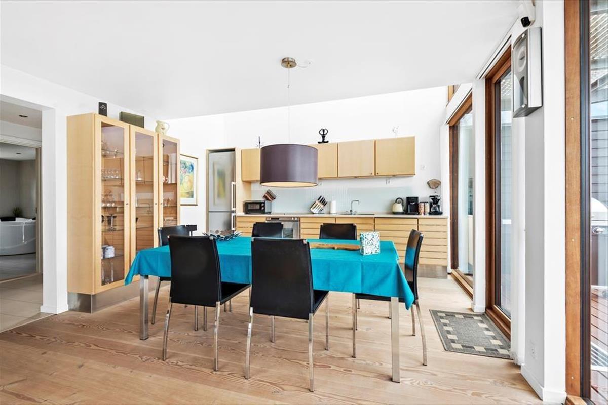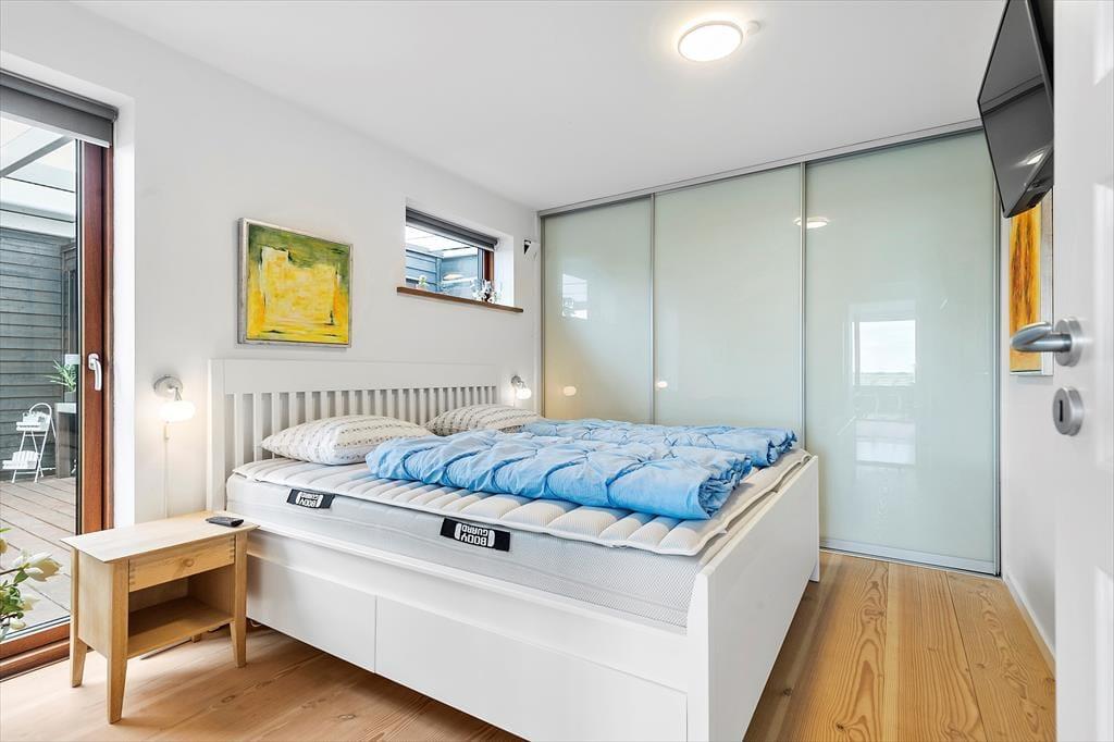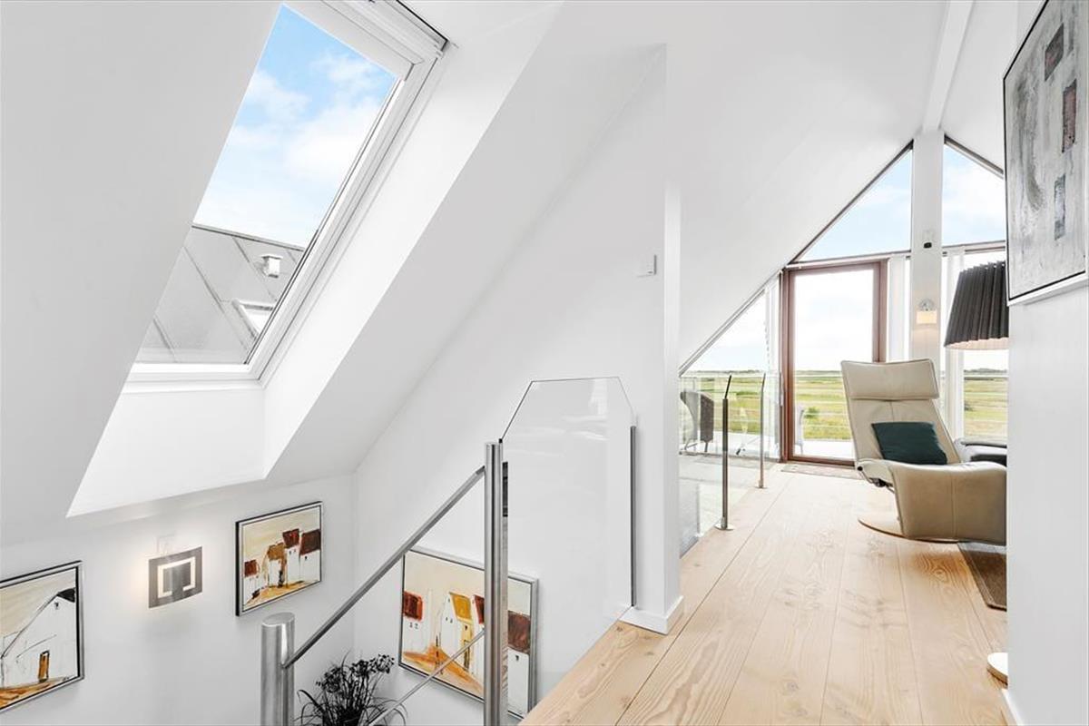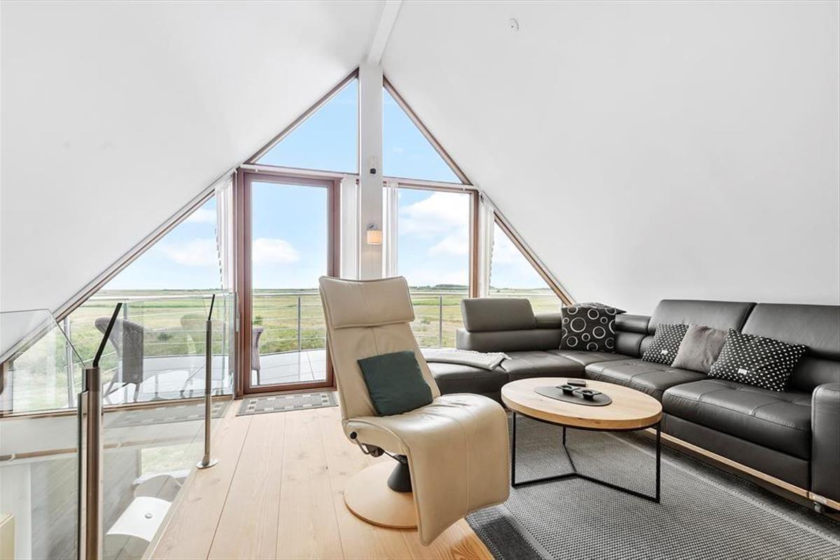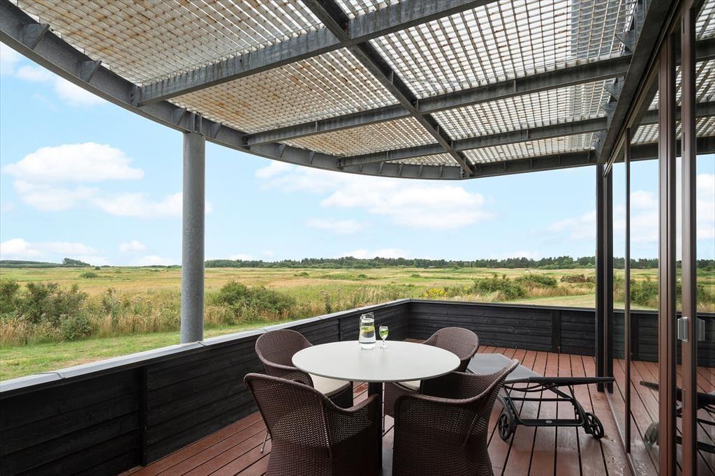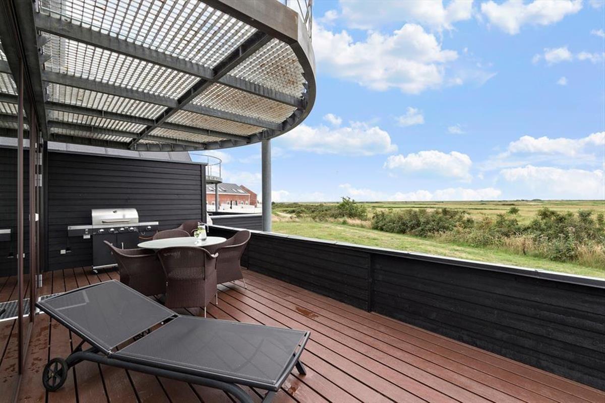 Die Aussicht wird sicherlich nicht schlechter, wenn du auf den Balkon im ersten Stock oder auf die große Terrasse im Erdgeschoss ins Freie trittst. Nicht zuletzt vom ersten Stock aus kannst du weit über die weite Landschaft blicken und die Fähre beobachten, die zwischen Rømø und Sylt auf der anderen Deichseite verkehrt. Wie der Balkon, ist auch die Terrasse nach Süden ausgerichtet und daher einen großen Teil des Tages sonnig, teilweise sogar dreiseitig abgeschirmt. Darüber hinaus findest du eine schöne überdachte Terrasse mit Esstisch und Außenküche, und es steht ein Gasgrill zur Verfügung.