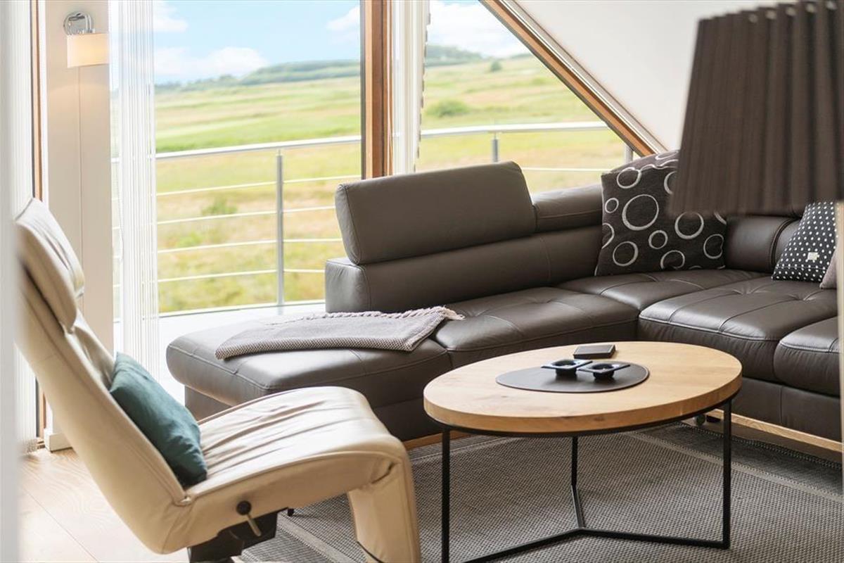 Der Raum ist nicht nur gut auf der Küchenseite ausgestattet, sondern hat auch eine gute Musikanlage und ein Digitalradio, sodass du beim Kochen schöne Musik hören kannst. Wenn du einen guten Film sehen möchtest, kannst du das im Wohnzimmer im ersten Stock – aber dann musst du dich auch von der tollen Aussicht über den Golfplatz und in Richtung Wattenmeer losreißen können.