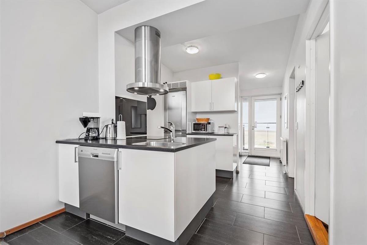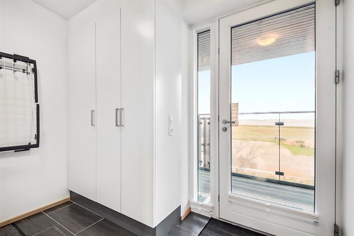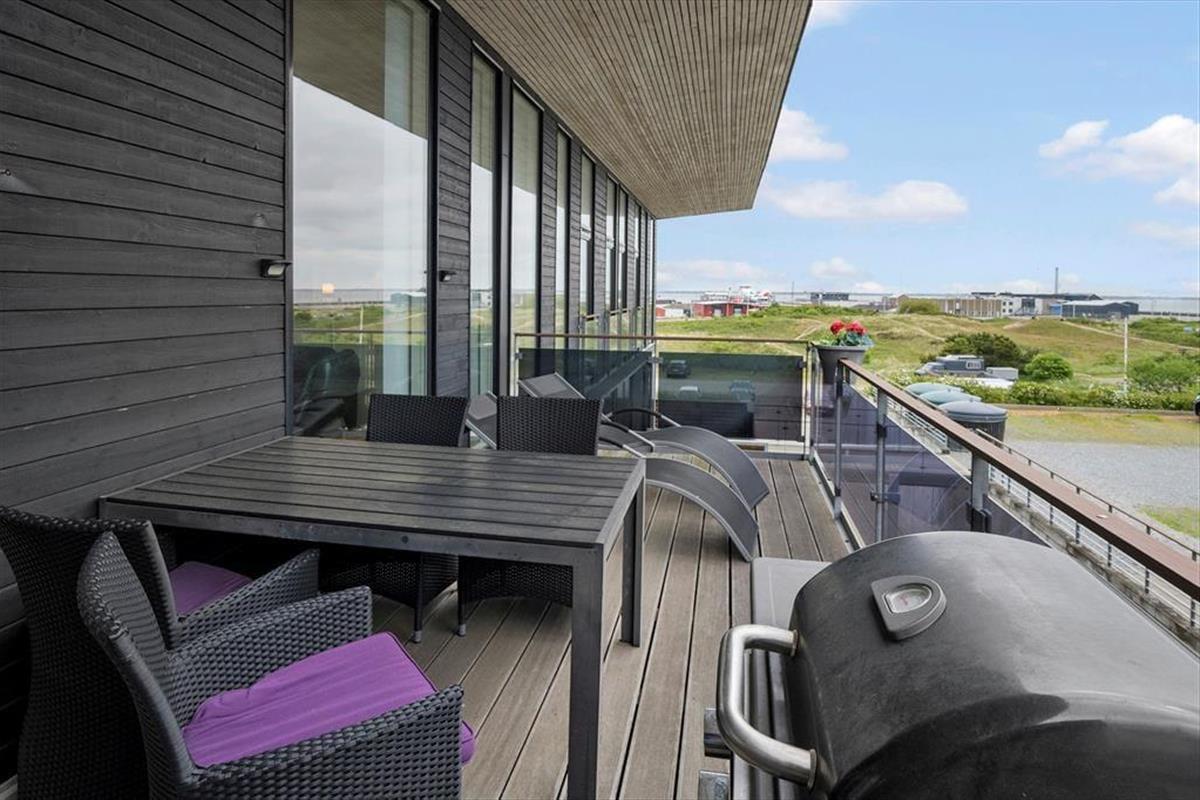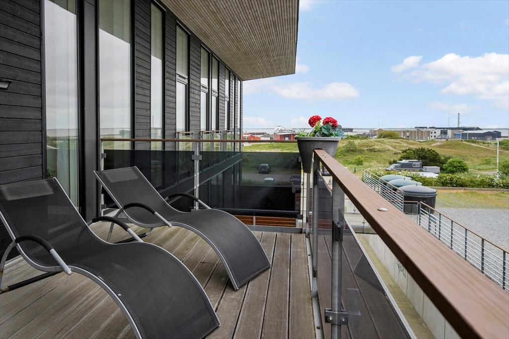 Sehnst du dich nach einem Sonnenbad auf dem Liegestuhl, kommst du direkt vom Wohnzimmer auf den Südbalkon, der ausgestattet ist mit Grill und großem Esstisch samt zwei Liegestühlen. Genieße dein Abendessen auf dem Balkon mit Blick über Havneby und den Marktplatz, während du von der Galerie auf der anderen Wohnungseite eine fantastische Aussicht über das Wattenmeer hast.