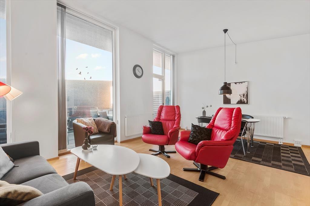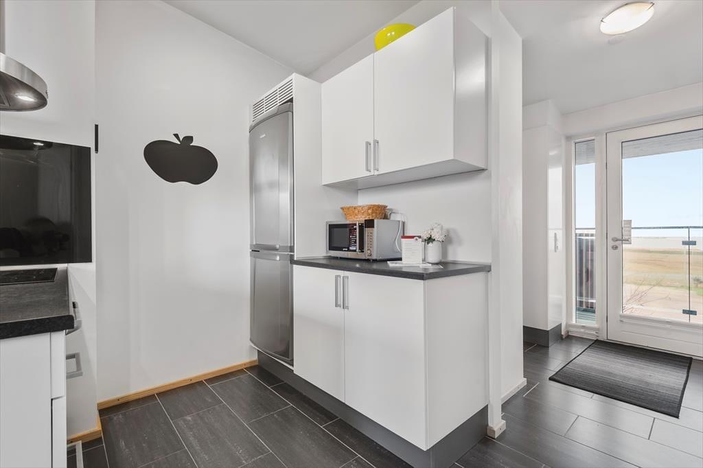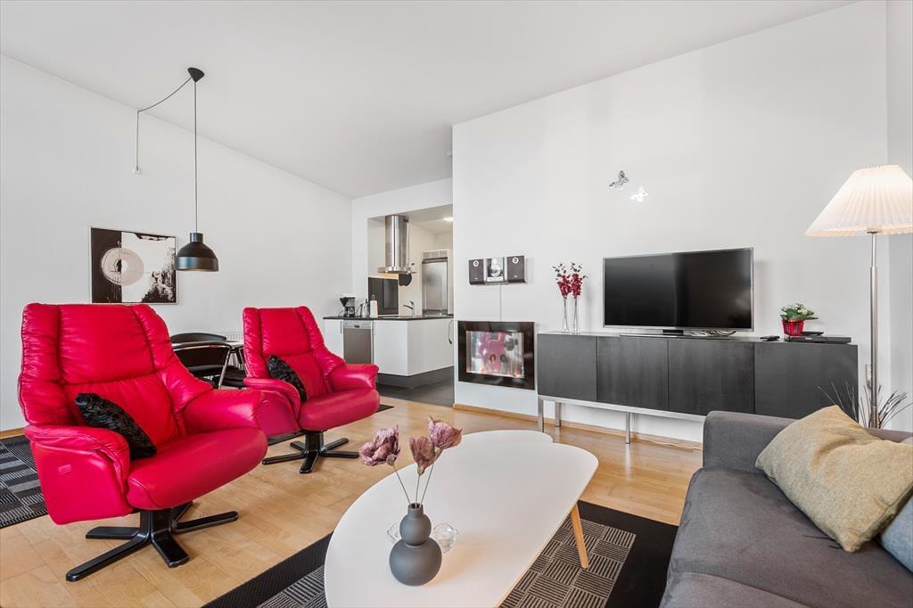 Mache es dir bequem auf 62 m² in einer Ferienwohnung der obersten Etage des Ferienkomplexes Skansen. Das große Wohnzimmer mit integrierter Küche ist erstklassig ausgestattet mit Esstisch, Flachbildschirm, einem Bioethanol-Kamin und gemütlichen Sitzmöbeln, sowie einem Schlafsofa für zwei Personen. Zudem gibt es ein Schlafzimmer mit Doppelbett, ein herrlich großes Badezimmer mit Dusche und einen großen Eingangsbereich mit Waschmaschine und Trockner, der mit Fernwärme beheizt wird. Kurz gesagt, diese Wohnung ist mit allem ausgestattet, was du dir für einen komfortablen und entspannten Urlaub wünschst!