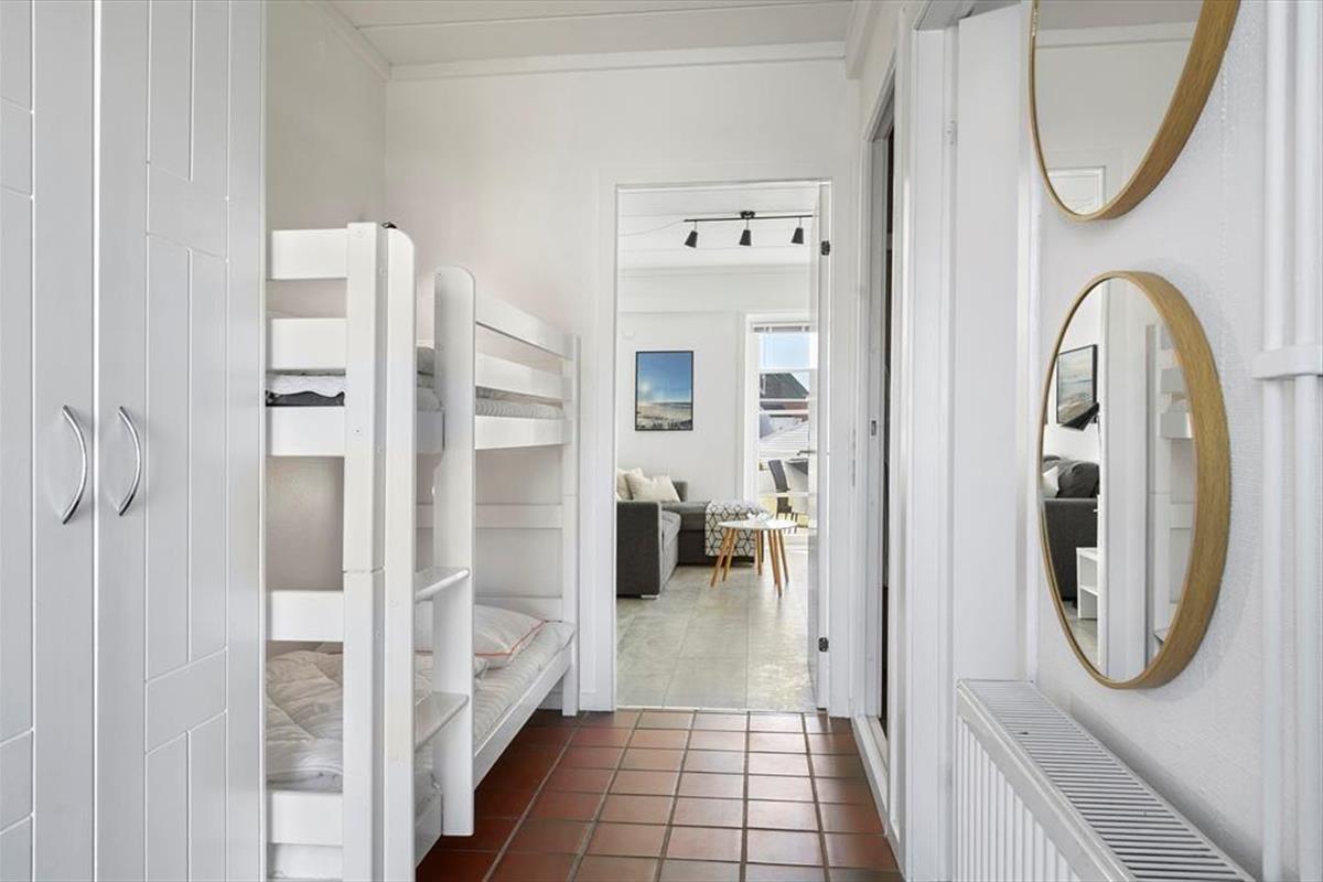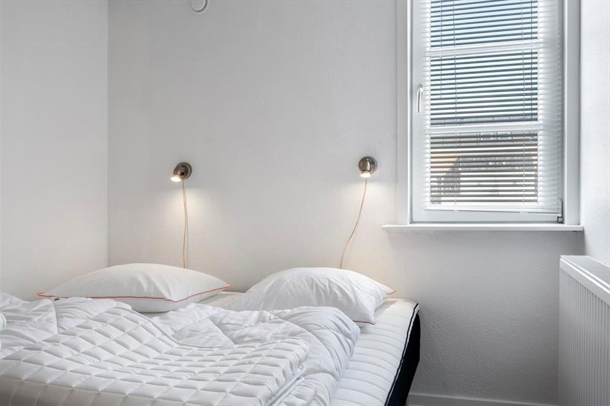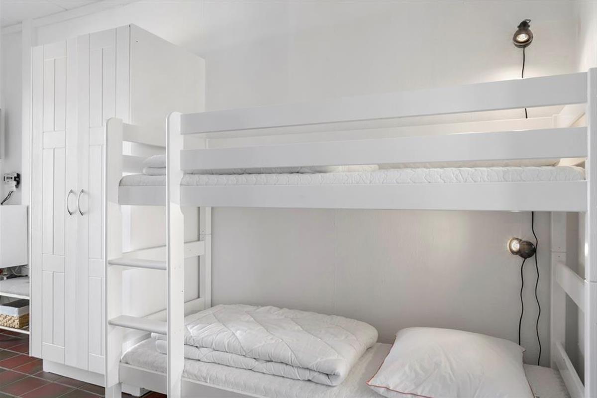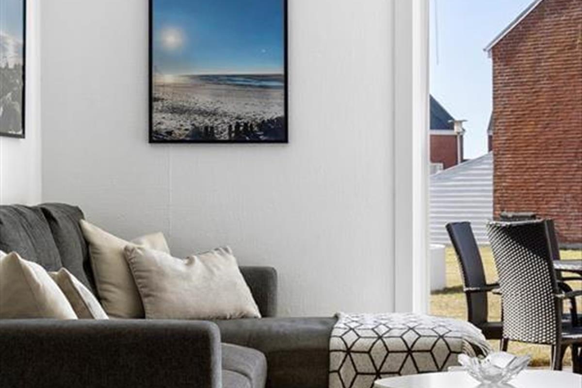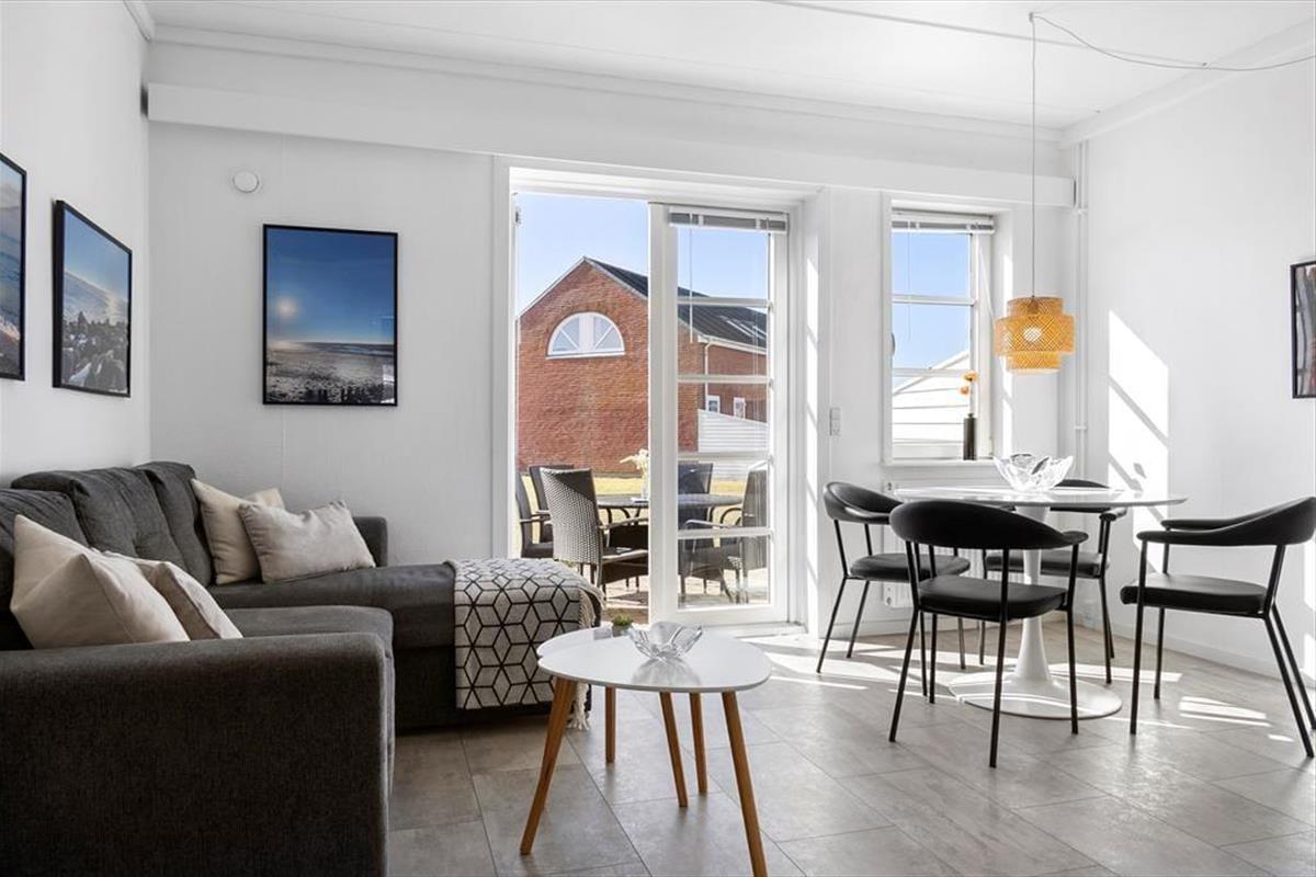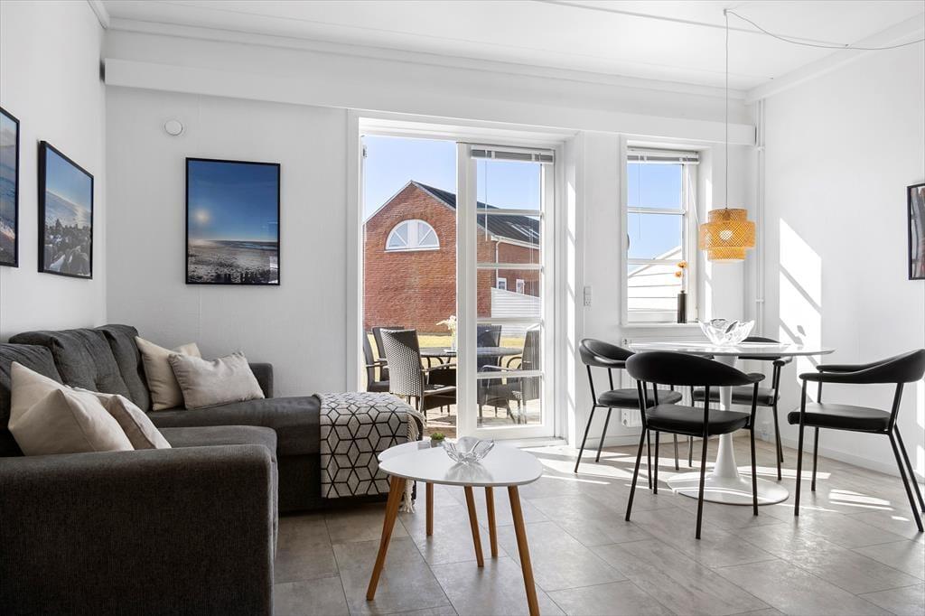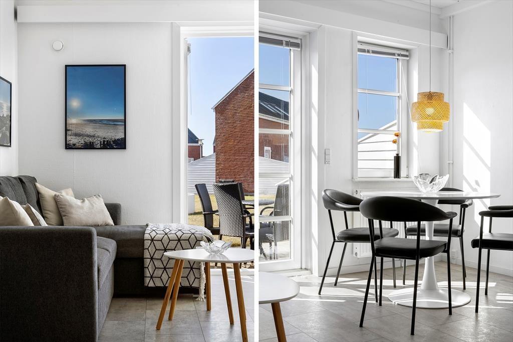 Im Innenraum empfängt dich eine helle und einladende Wohnatmosphäre. Alle Räume bestechen mit ihrer schönen und funktionalen Einrichtung. Die Wohnung beherbergt ohne Probleme bis zu vier Urlaubsgäste. Zur Wohnfläche zählen ein Badezimmer, ein Schlafraum mit einem Doppelbett und ein Durchgangszimmer mit einem Etagenbett. Falls du lieber im Wohnzimmer schlafen möchtest, ist dies auf dem komfortablen Schlafsofa möglich. Der Wohnraum beinhaltet darüber hinaus einen Esstisch und einen Fernseher mit dänischen und deutschen Sendern. Da die Küche offen in den Wohnraum integriert ist, befindest du dich selbst beim Zubereiten der Mahlzeiten mitten im Familiengeschehen.