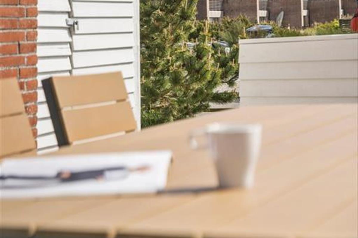 Vom Wohnbereich aus ermöglichen Glastüren den direkten Zugang zur Terrasse, die nach Süden ausgerichtet ist und somit ideal zum Sonnenbaden – und möchtest du in den Schatten fliehen, kannst du den Sonnenschirm aufklappen.