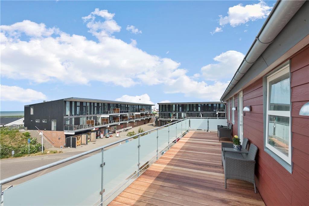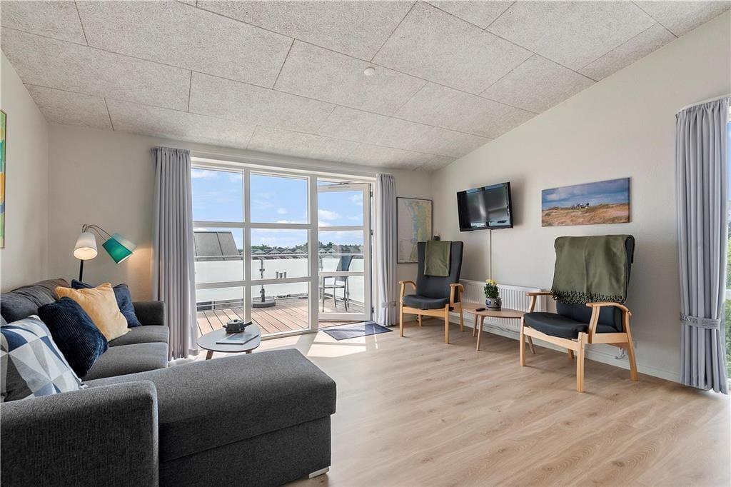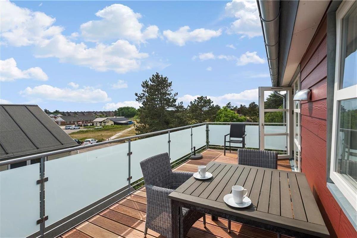 Vom Wohnzimmer aus hast du, durch die breite Glastür, direkten Zugang zum großen Balkon, der durch seine südliche Ausrichtung fast den ganzen Tag über sonnig ist. Bevorzugst du kühlere Temperaturen, kannst du dich auch auf die breite Galerie auf der anderen Seite des Gebäudes setzen. Hier kannst du ebenfalls die schöne Aussicht über das Wattenmeer genießen, welches nur ein paar Hundert Meter weit entfernt ist.
