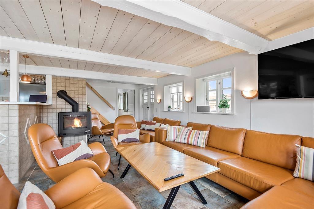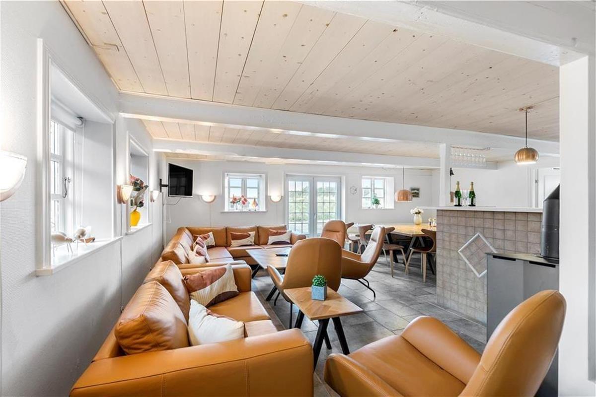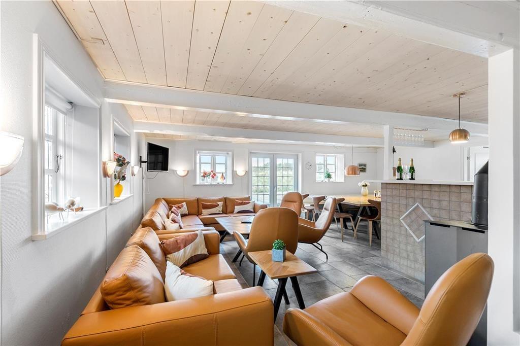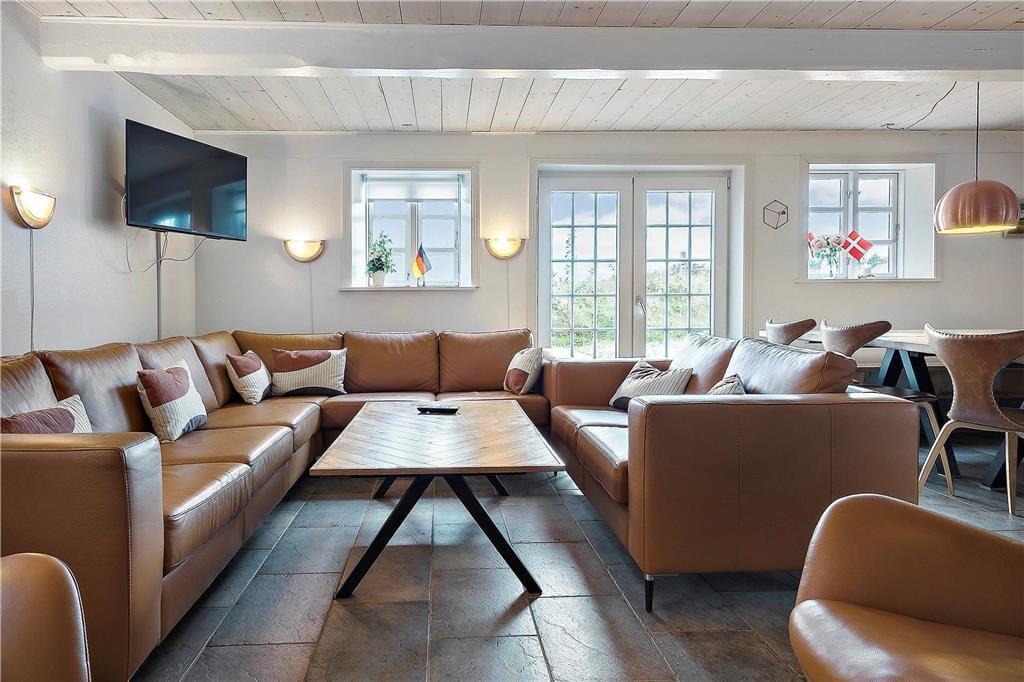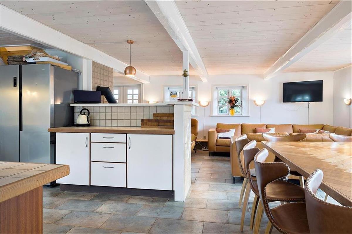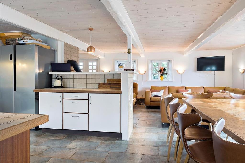 Das ursprünglich aus dem Jahr 1827 stammende Haus wurde nach allen Regeln der Kunst renoviert. Hier findest du modernen Komfort und authentischen Rømø-Charme; mit Strohdach, verputzter Fassade und Sprossenfenstern. Innen herrscht eine unglaublich einladende Atmosphäre und du merkst, dass die Renovierung mit großem Respekt gegenüber dem ursprünglichen Stil vorgenommen wurde. Das Herz des Hauses ist der große Aufenthaltsraum, wo Küche und Wohnzimmer offen miteinander verbunden sind. Sichtbare Deckenbalken und rustikale Bodenfliesen sorgen für ein stimmiges Ambiente. Der Raum ist eingerichtet mit einem großen Esstisch, an dem sich alle zu den Mahlzeiten versammeln können. Als zusätzliches Detail steht ein 2-Zonen-Weinkühlschrank zur Verfügung. Zudem gibt es eine große Sofagruppe und eine gemütliche Ecke mit Sesseln vor dem Kaminofen. Es gibt insgesamt acht Zimmer im Haus: vier Doppelzimmer im Erdgeschoss und zwei Doppelzimmer sowie ein Einzelzimmer im 1. Stock. Zudem gibt es drei Badezimmer.