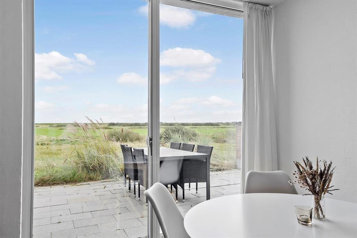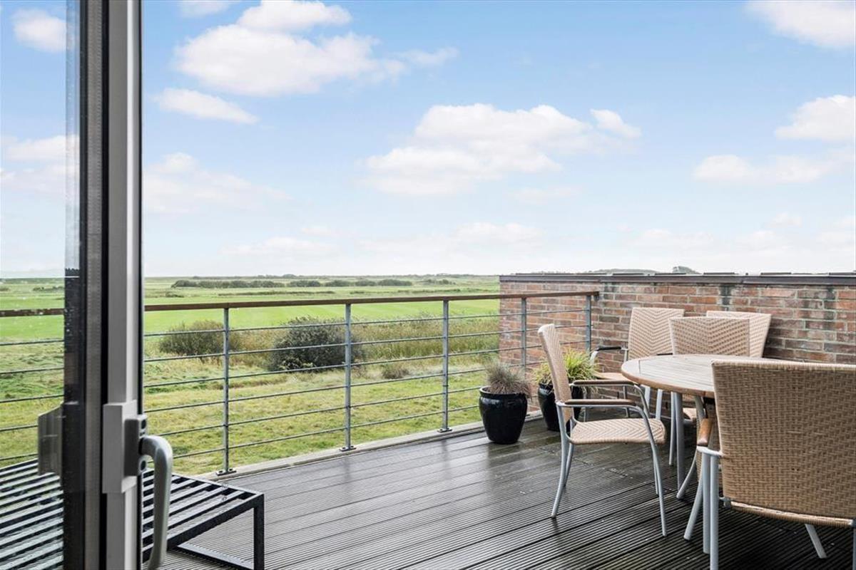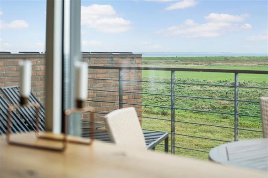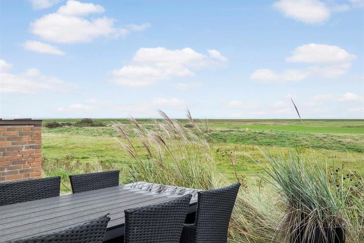 Auf der Nordseite des Hauses gibt es genügend Platz zum Parken, aber der eigentliche Urlaub findet auf der Südseite statt. Hier gibt es unten eine große Terrasse und im oberen Bereich einen Balkon. Beide sind sonnig und bieten den schönsten Blick über den Golfplatz und die flachen Salzwiesen. Auf beiden Ebenen gibt es Gartenmöbel von guter Qualität, die einen schönen und komfortablen Rahmen bilden, wenn du unter freiem Himmel entspannen möchtest.