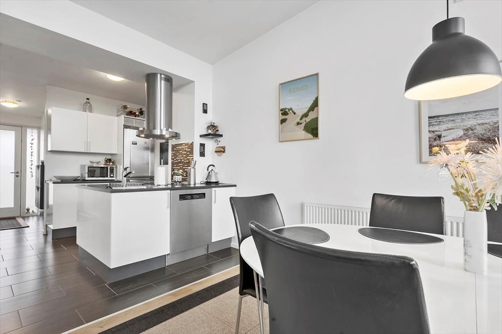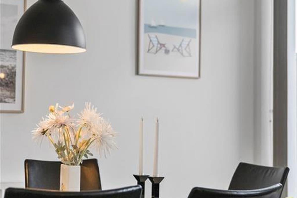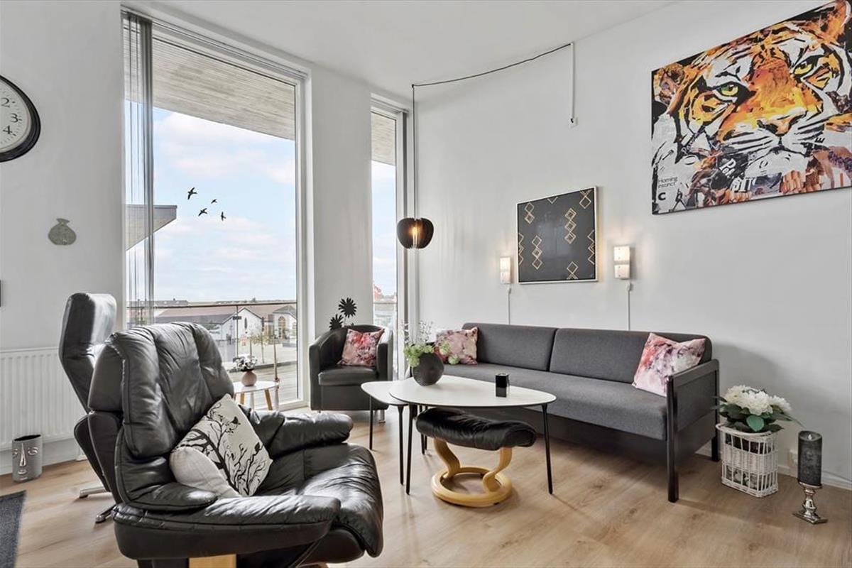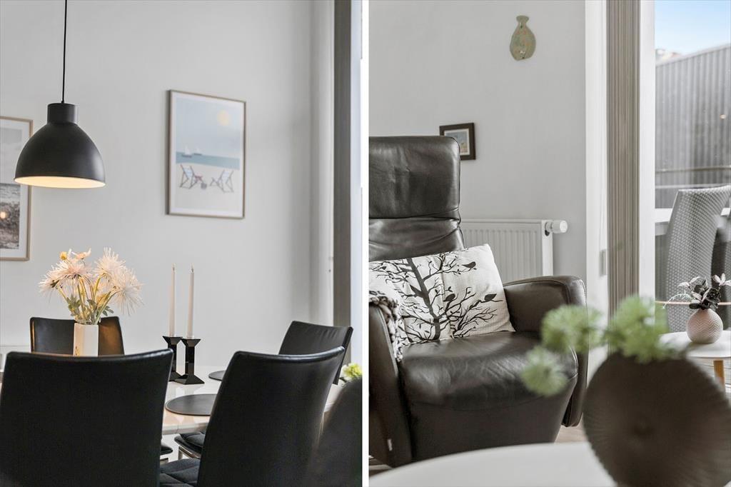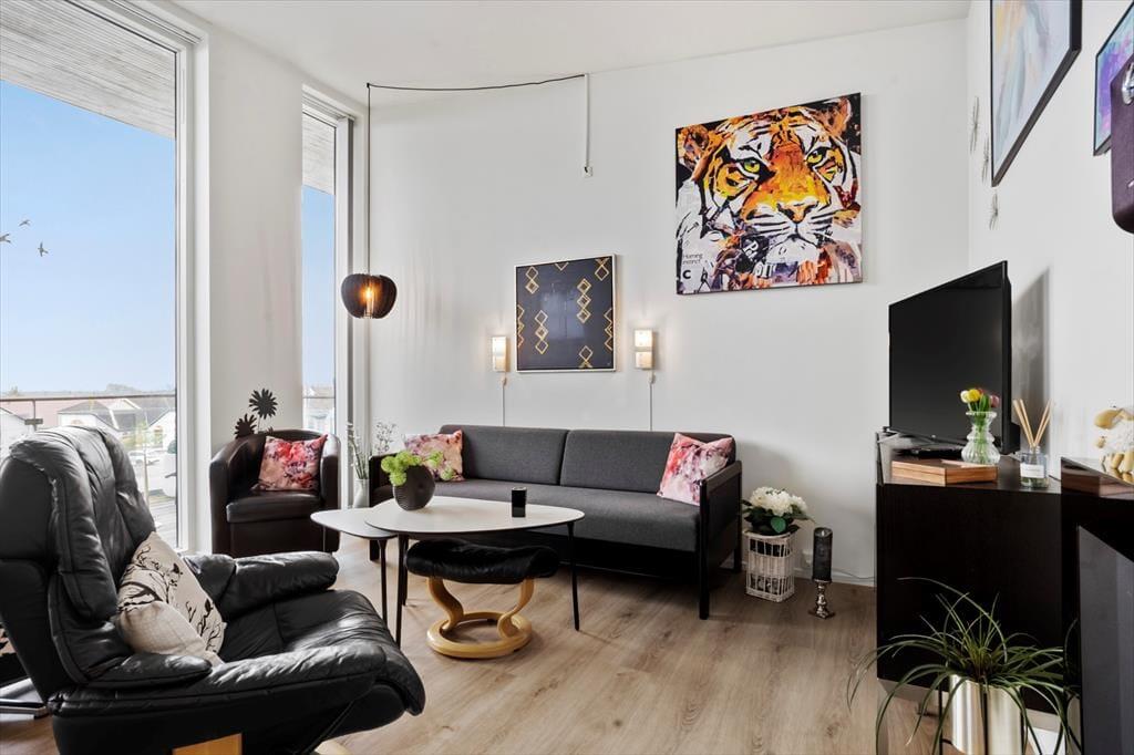 Wenn du die Wohnung betrittst, empfängt dich ein heller und einladender Raum, in dem die stilvolle Einrichtung sofort eine warme und einladende Atmosphäre schafft. Die großen Fenster sorgen nicht nur für einen angenehmen Lichteinfall, sondern bieten auch einen schönen Blick über die Stadt und den Platz in Havneby – perfekt für eine Tasse Kaffee am Morgen oder ein Glas Wein am Abend. Die Wohnung bietet eine harmonische Verbindung zwischen Wohn- und Schlafbereich, was eine gute Funktionalität und ein offenes Design gewährleistet. Du kannst dich im bequemen Sofa entspannen, eine Mahlzeit am Esstisch genießen oder einfach die Aussicht bewundern. Die gemütlichen Details wie Liegestühle und schöne Kunstwerke verleihen dem Raum eine persönliche Note, und die praktische Einrichtung sorgt dafür, dass dein Aufenthalt komfortabel und unkompliziert verläuft.